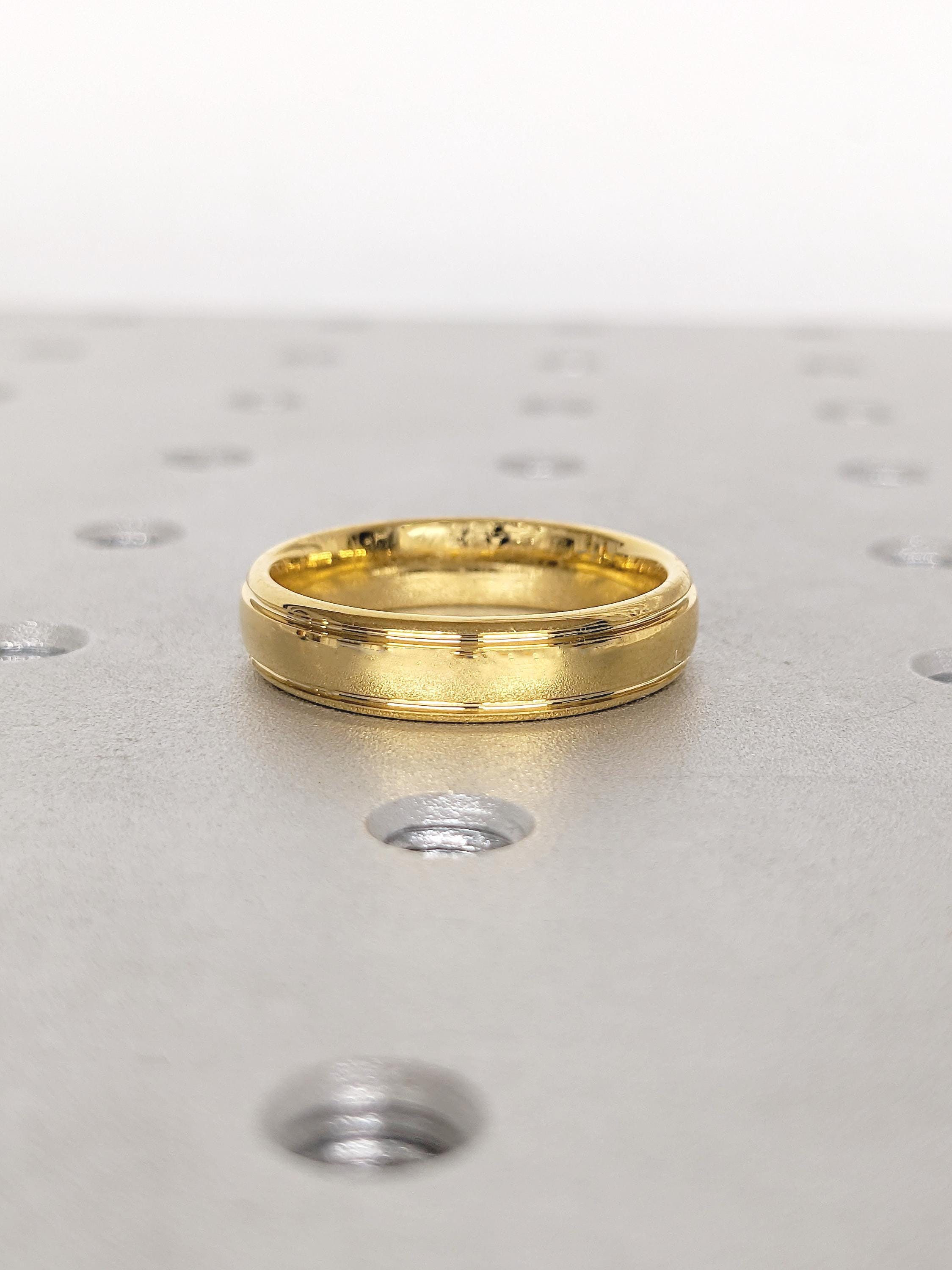 This 5mm dome wedding band is crafted from durable tungsten and finished with a polished yellow gold plating. Its subtle texture and classic dome profile offer a refined, modern look that is perfect for everyday wear and special occasions.