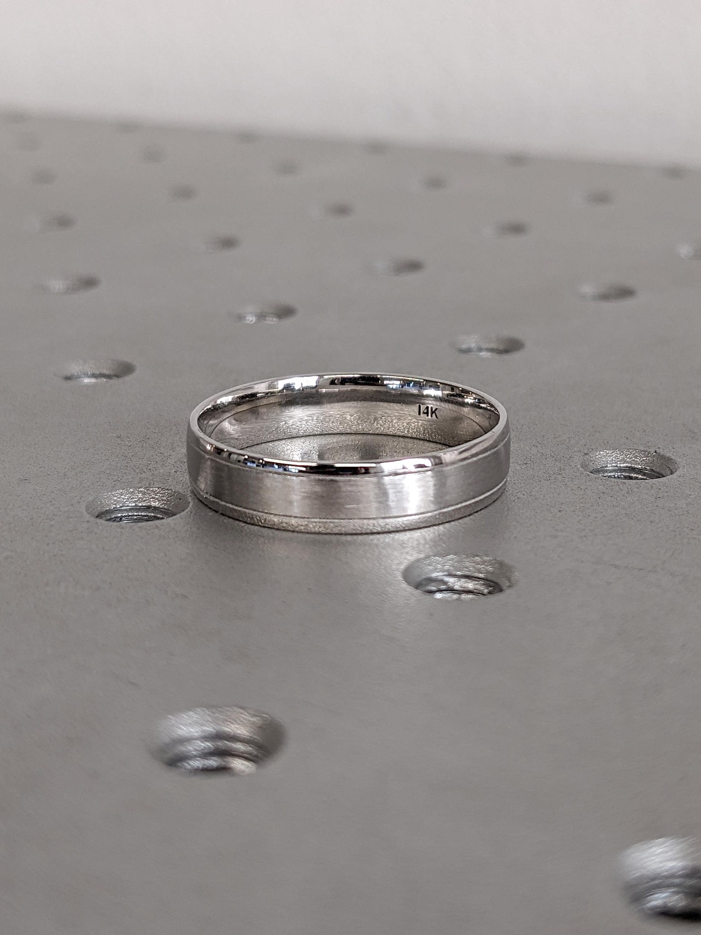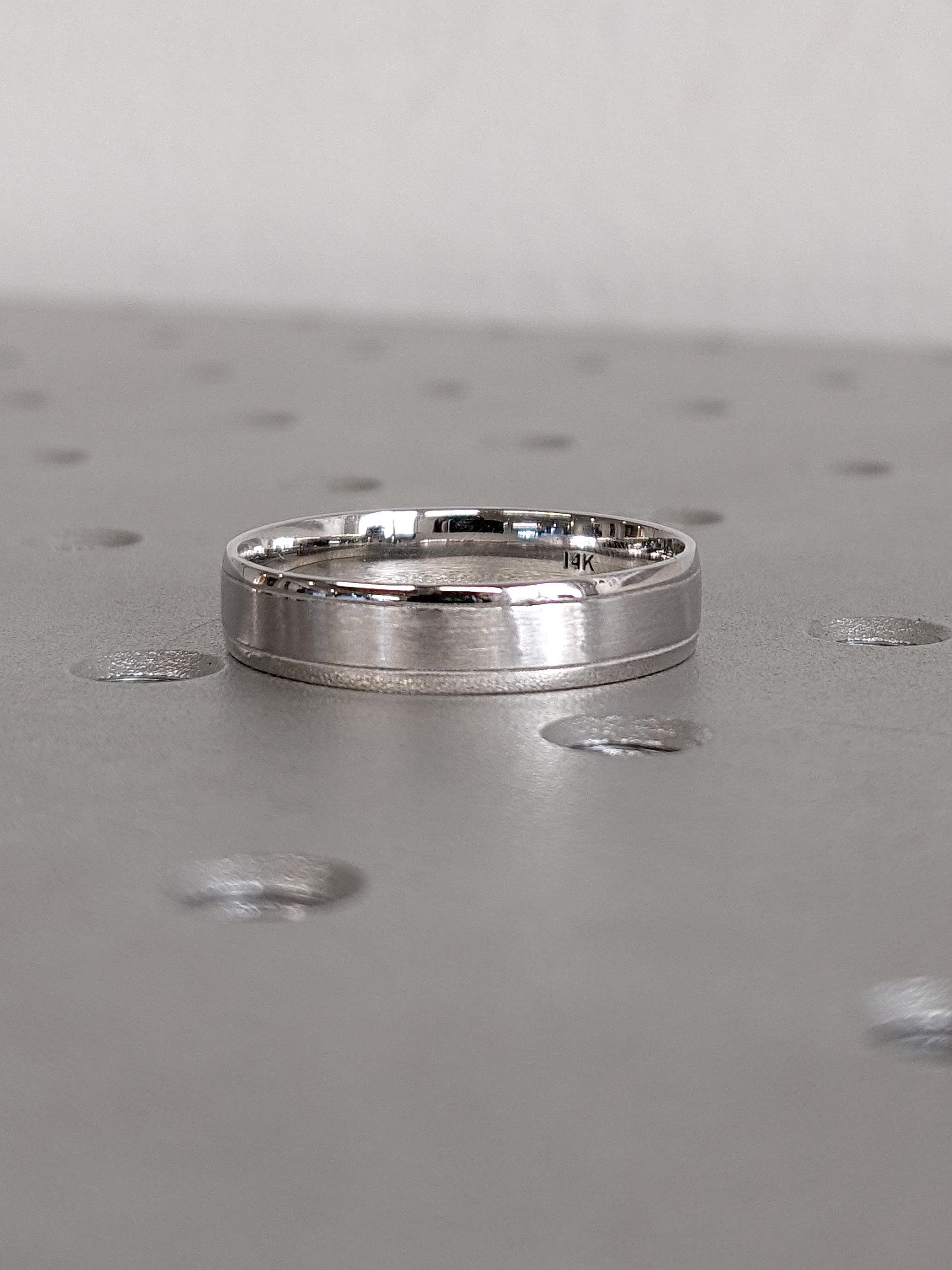 Sleek and modern, this ring features a brushed finish center framed by concurrent polished grooves, creating a refined contrast of texture and shine. The rounded interior edges ensure a comfortable fit for everyday wear. A timeless band that balances understated style with contemporary craftsmanship — perfect as a wedding ring or daily statement piece.