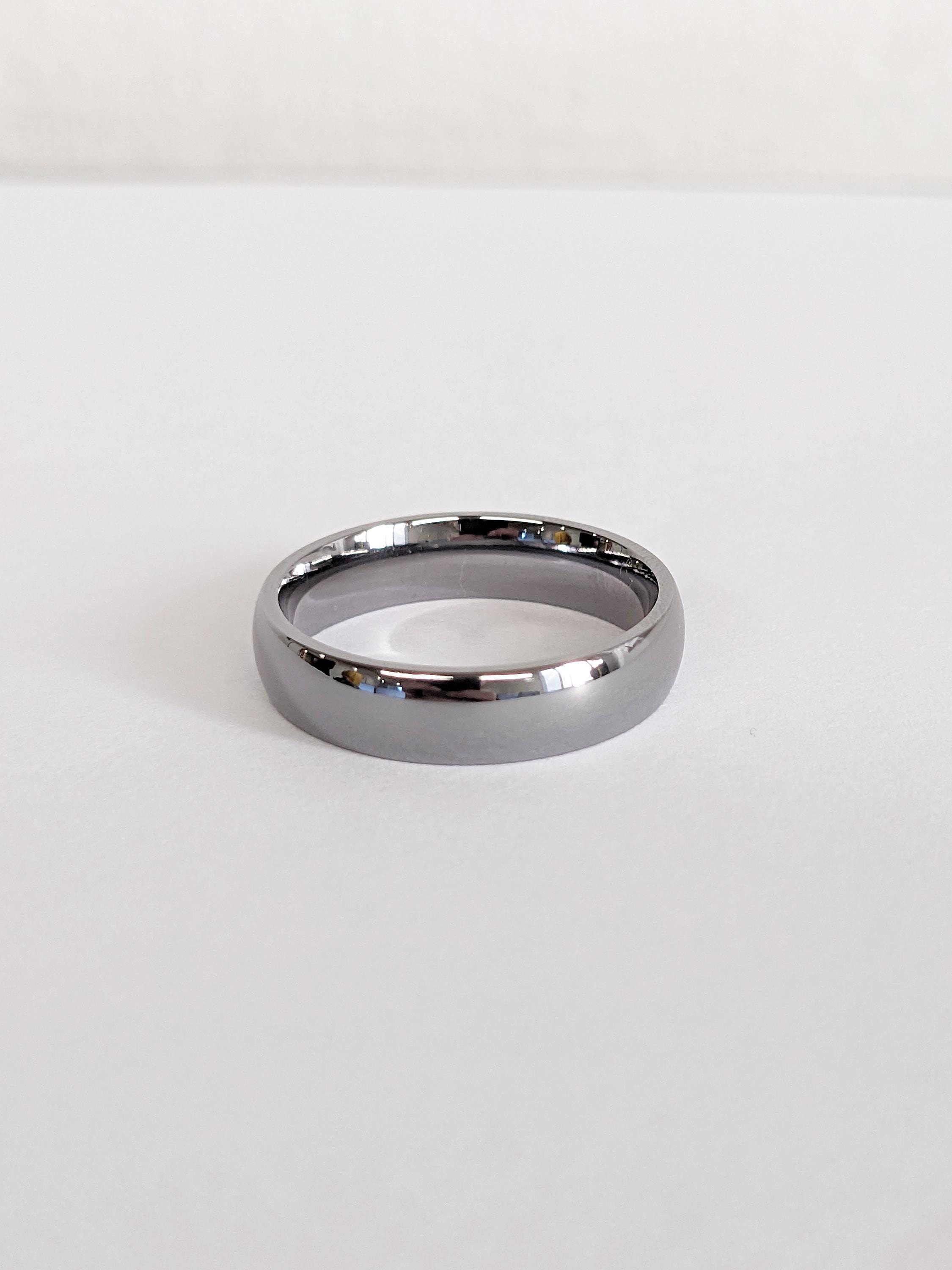 A minimalist, polished finish 5mm width ring for him, in a classic court shape for comfortable everyday wear. Made with rare earth metal, Tantalum, its sophisticated gunmetal color, corrosion-resistant, and hypoallergenic qualities make this ring the perfect alternative for those with sensitive skin or allergies to nickel or metal.