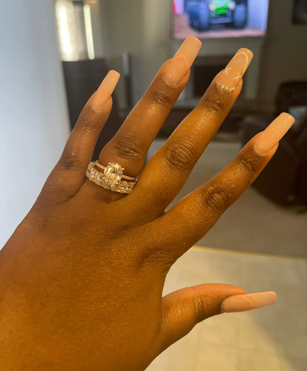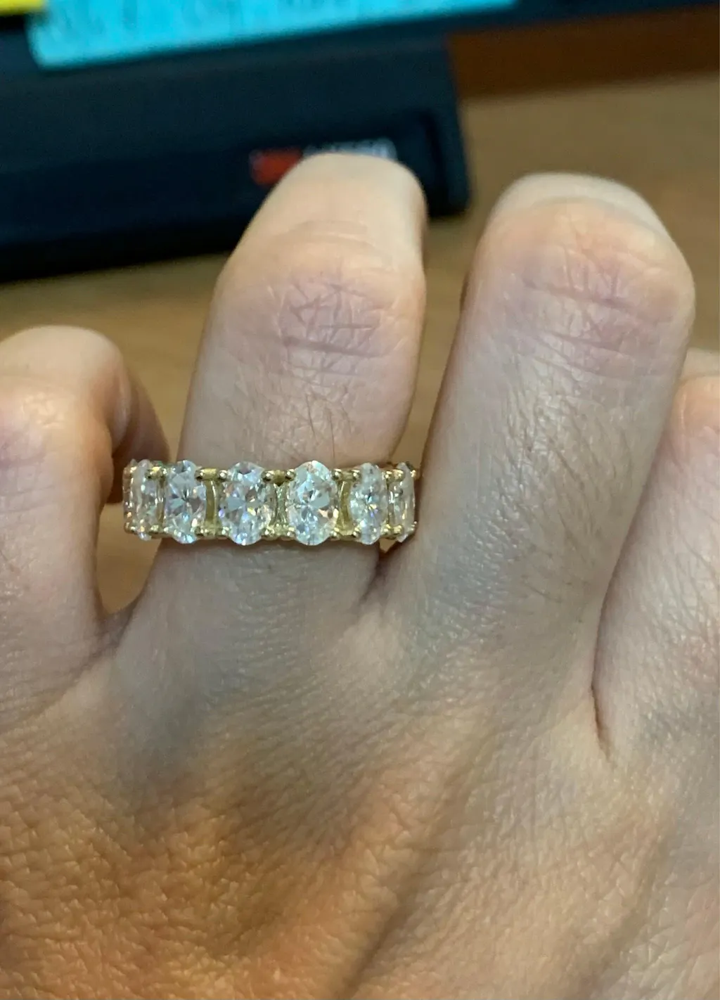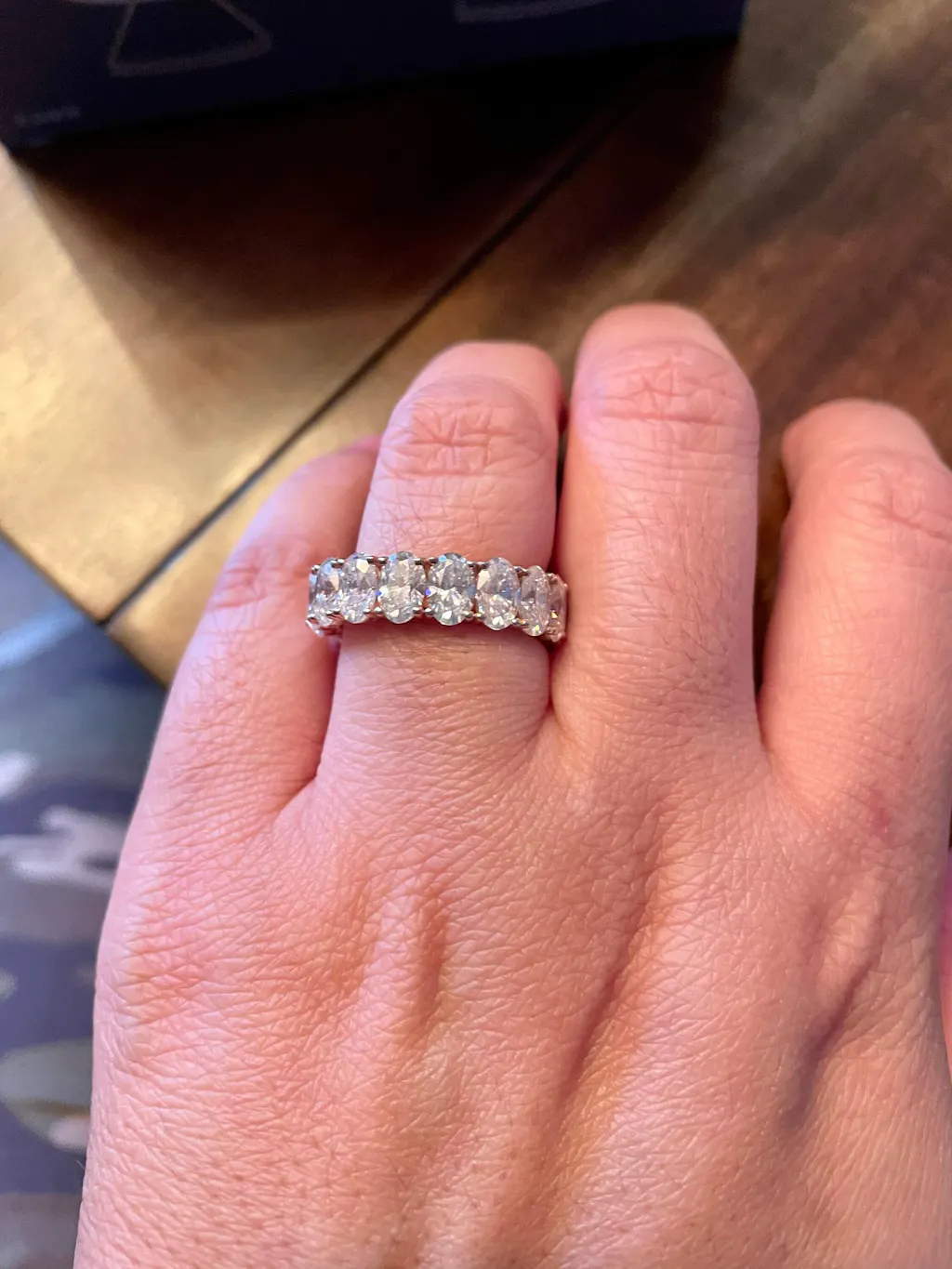 Nothing to add but the fact that this oval moissanite full eternity ring, has a BLOWING amount of light, sparkle and fire shooting out of it!