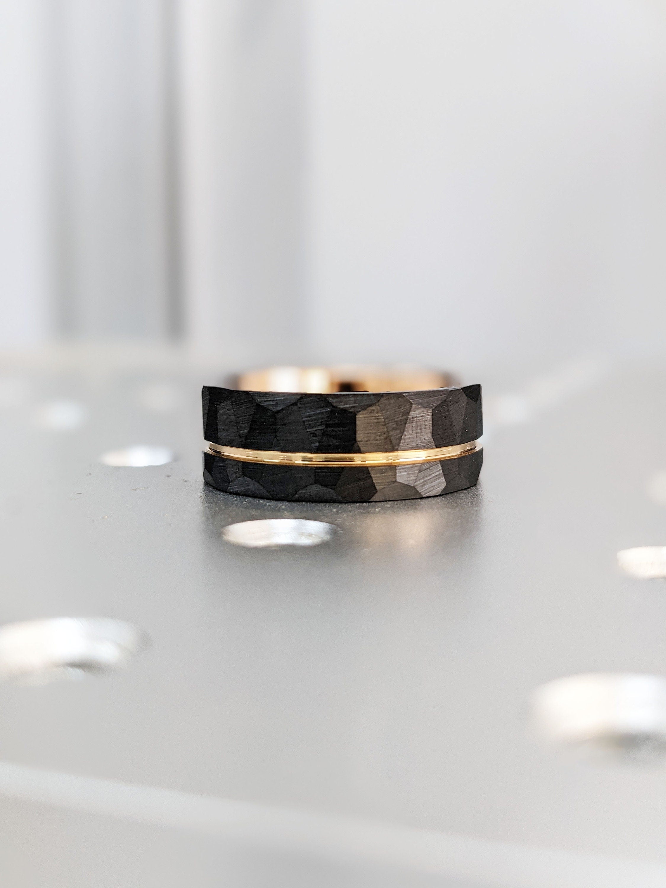 This timeless men’s band blends rugged texture with modern sophistication. The organic hammered black top and sides create a bold contrast against the rose gold stripe and inner band, giving it a sleek yet masculine appeal. Crafted from durable tungsten carbide, this ring is designed to stand the test of time — strong, scratch-resistant, and built for everyday wear.