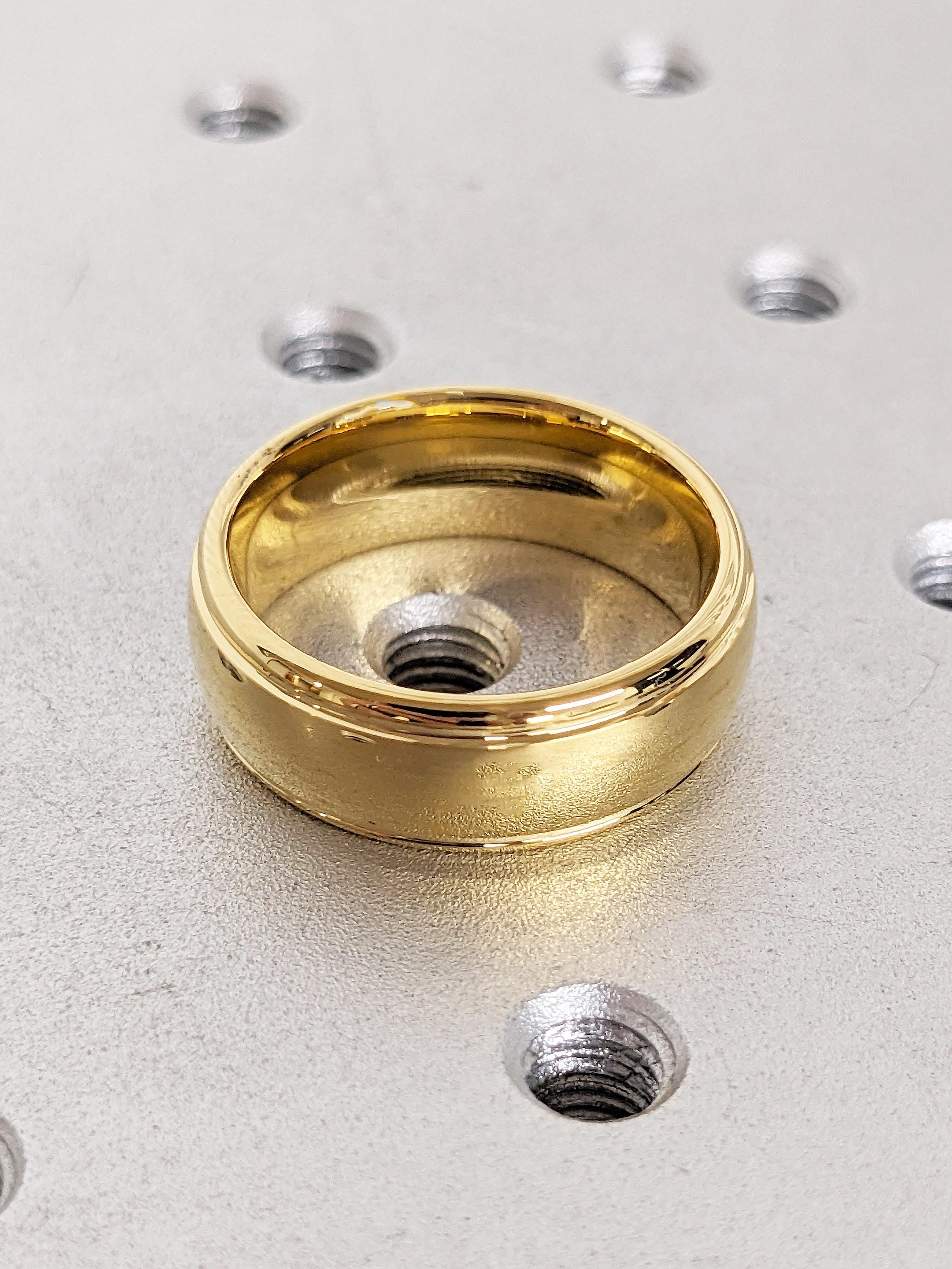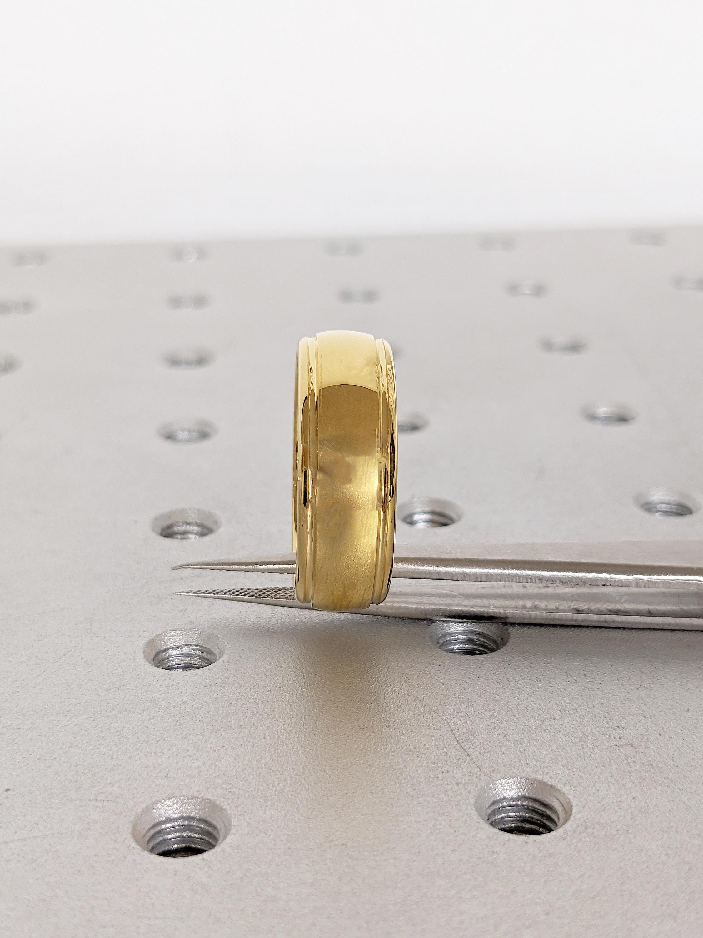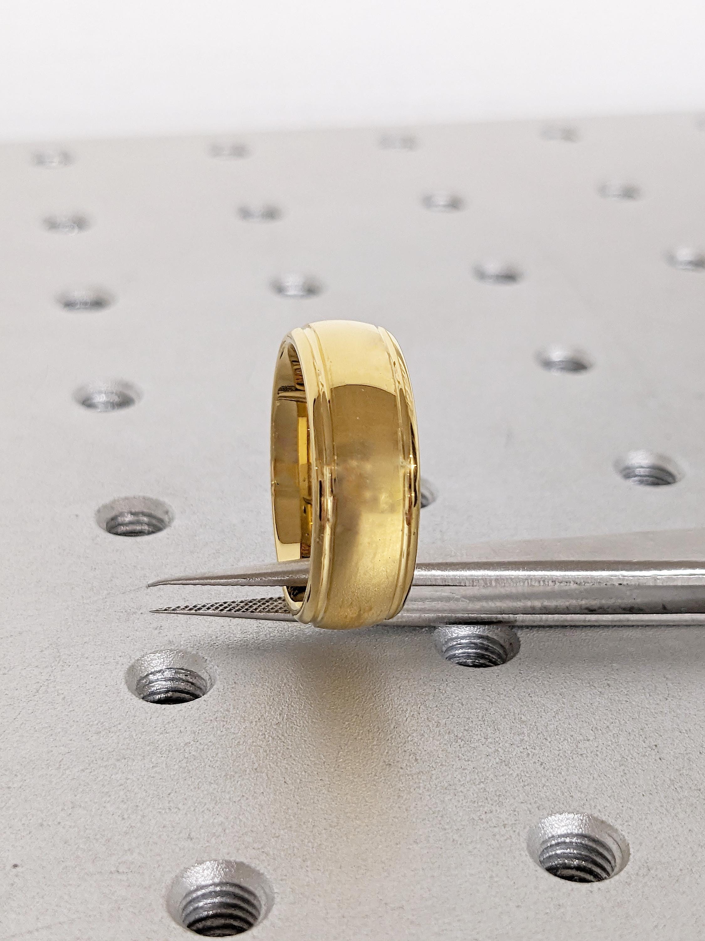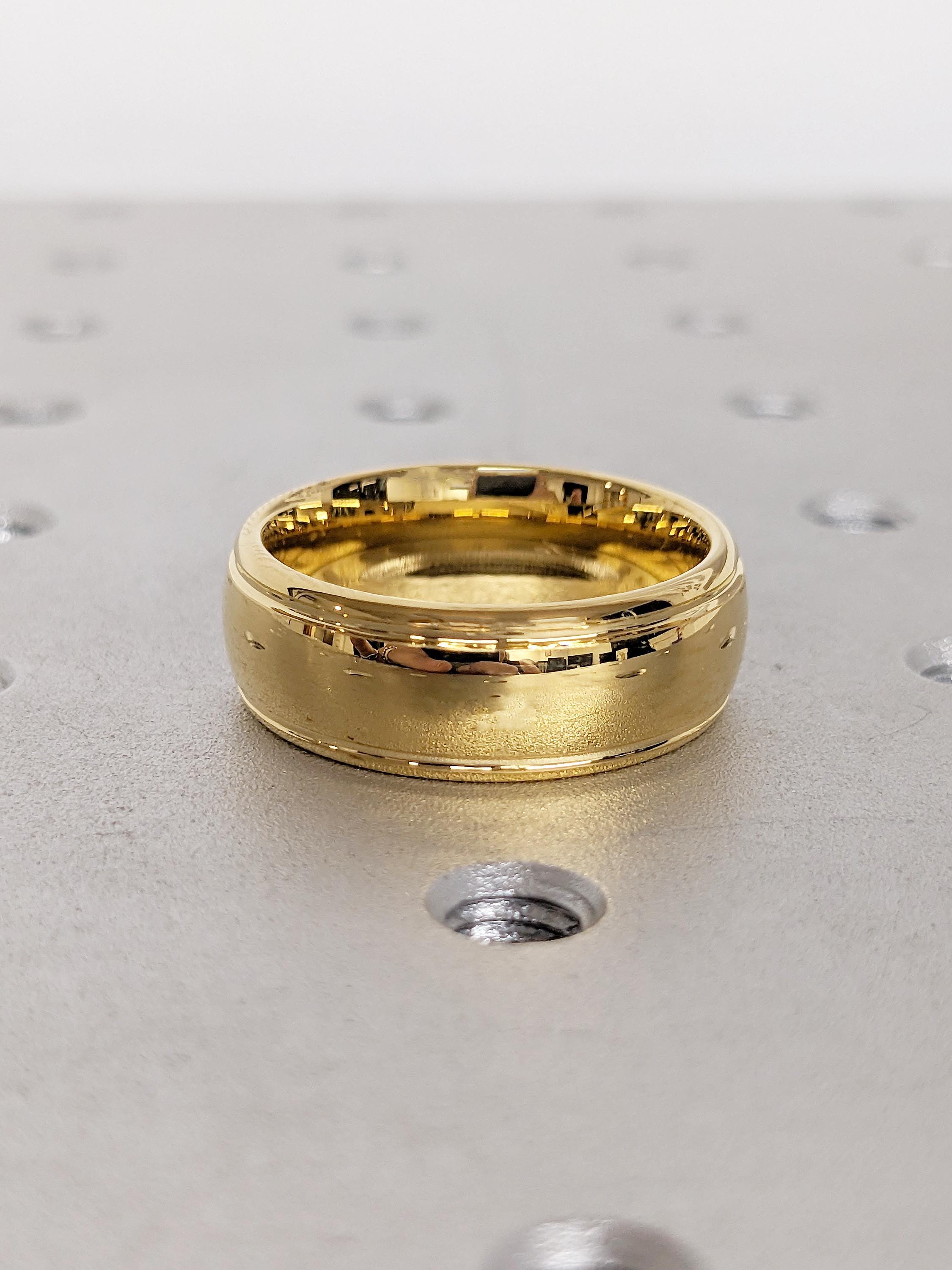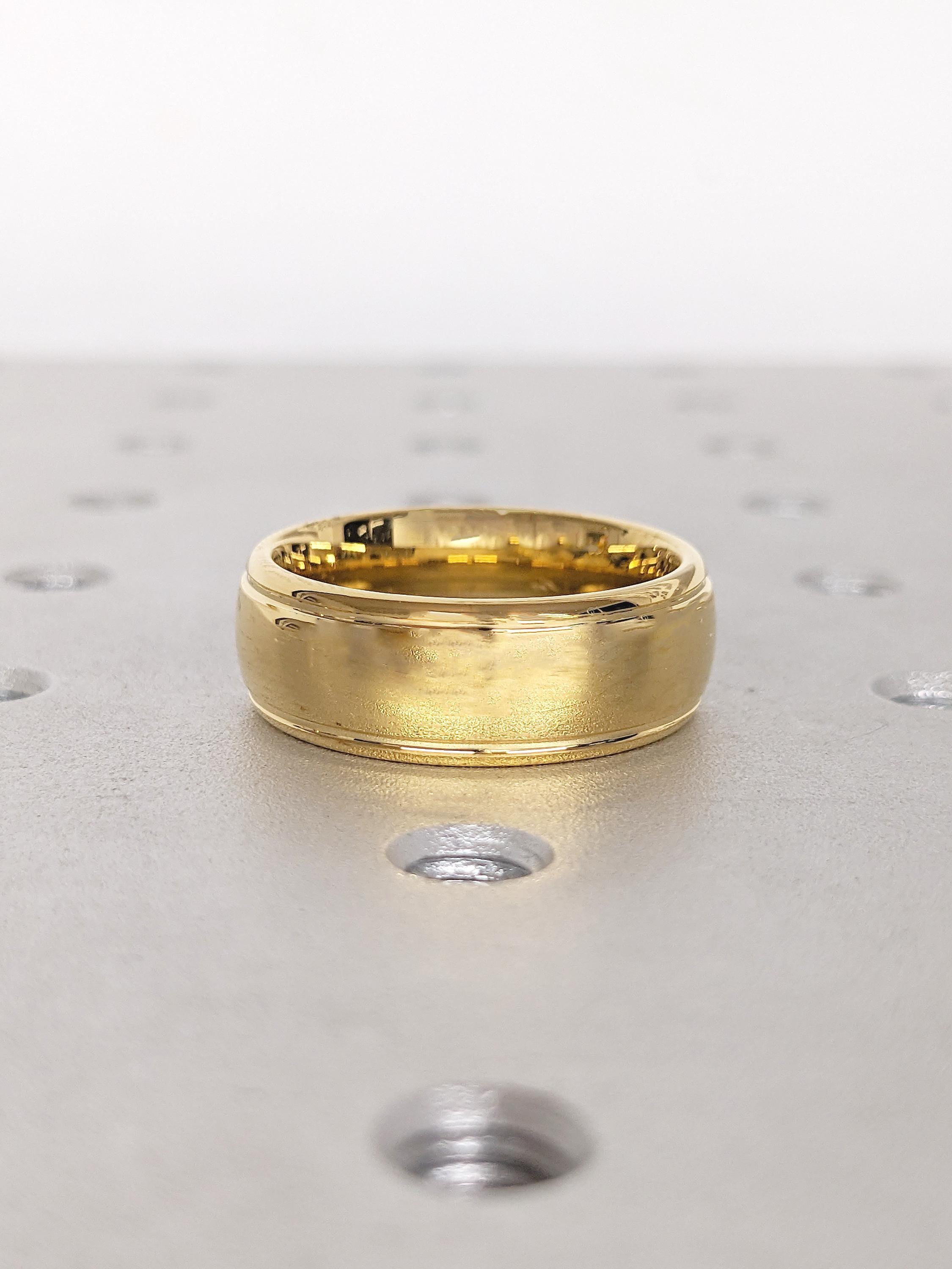 This 8mm dome wedding band is crafted from durable tungsten and finished with a polished yellow gold plating. Its subtle texture and classic dome profile offer a refined, modern look that is perfect for everyday wear and special occasions.