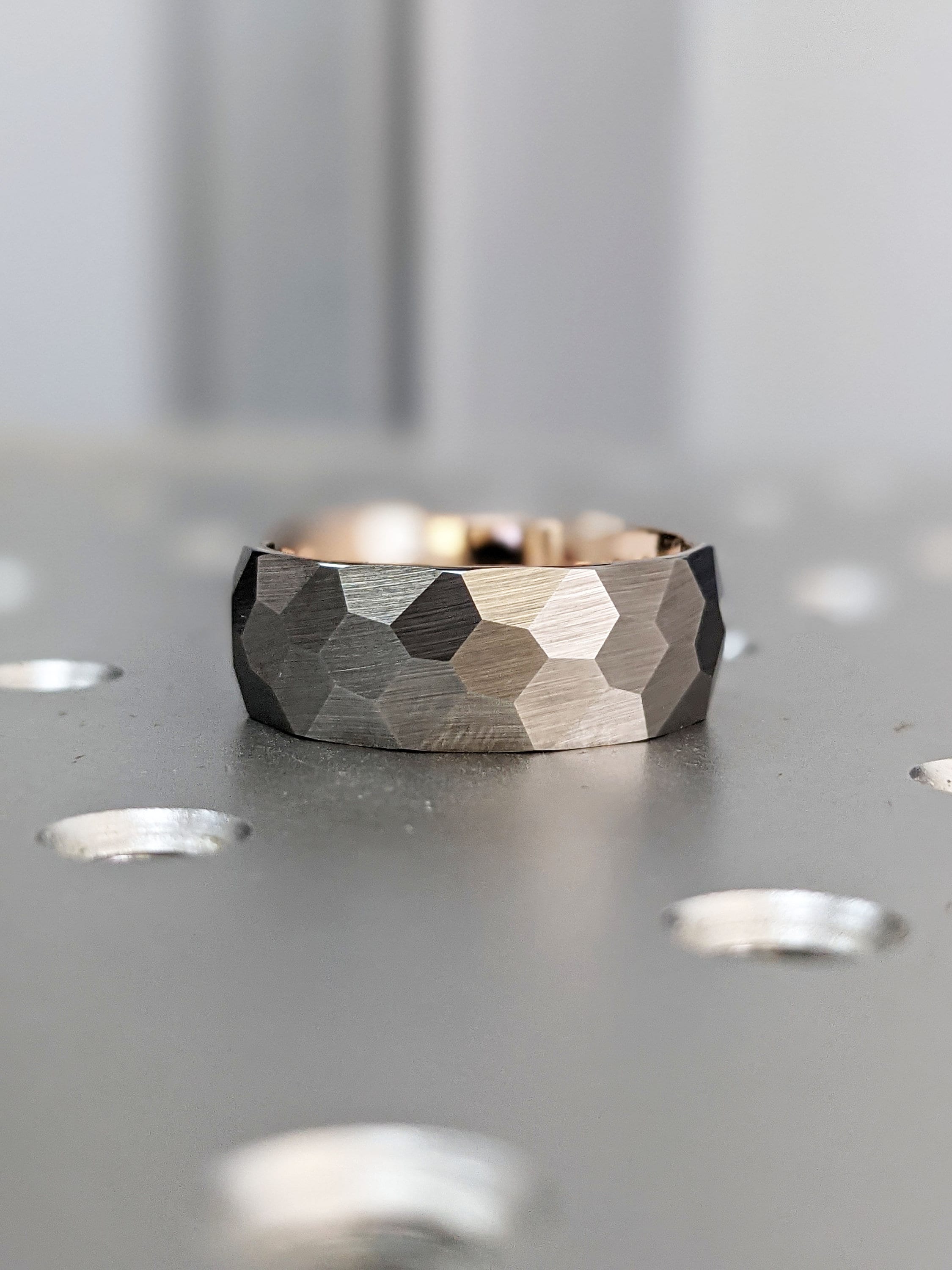 This wide hammered tungsten men’s wedding band features a wide hammered finish with a rose gold plated interior for a modern, masculine look. Crafted to be cobalt-free and hypoallergenic, it ensures lasting comfort and durability. With its comfort-fit design, this ring is perfect for everyday wear while symbolizing strength and timeless commitment.