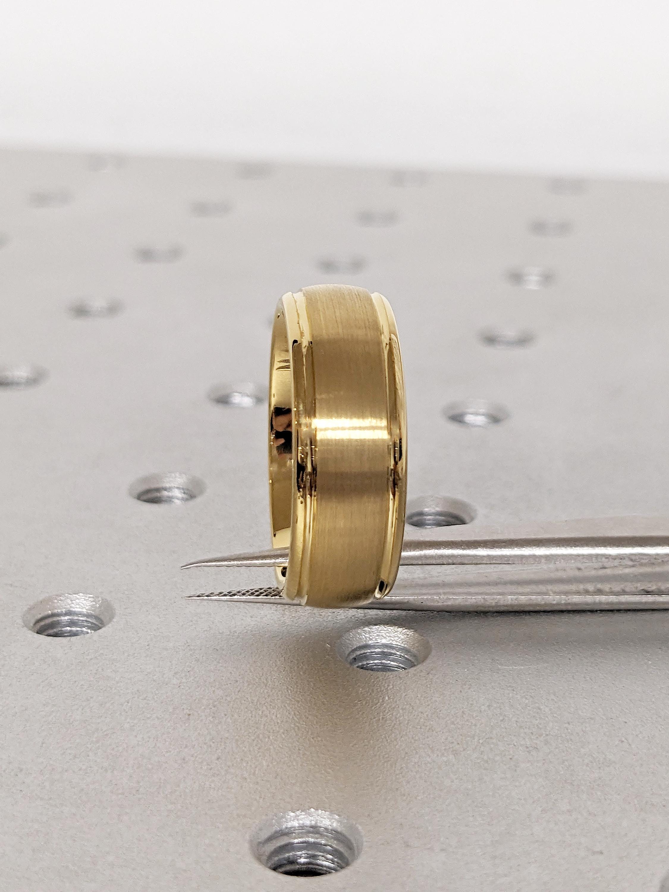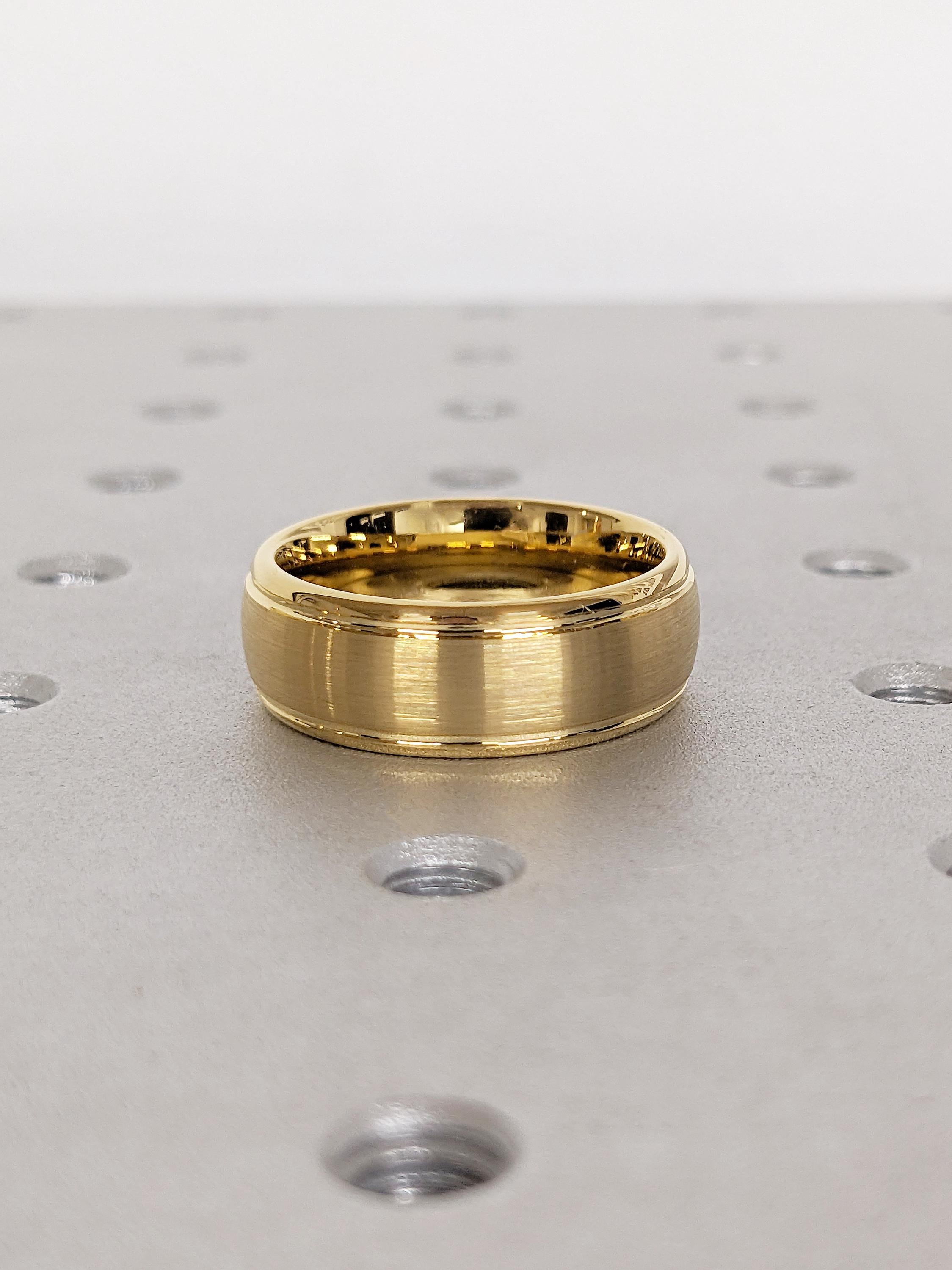 This 8mm dome wedding band is crafted from durable tungsten and finished with a brushed yellow gold plating. Its subtle texture and classic dome profile offer a refined, modern look that is perfect for everyday wear and special occasions.
