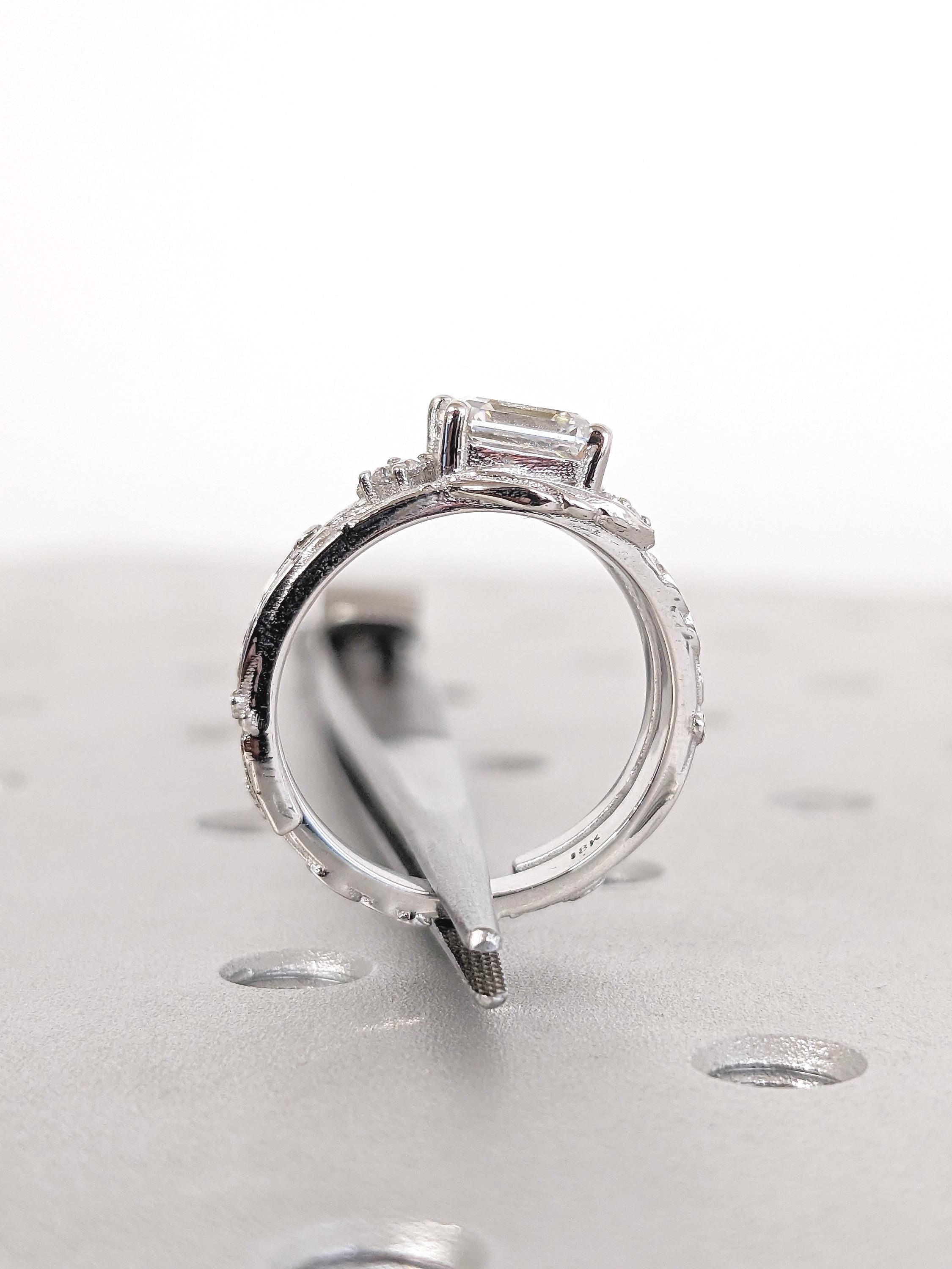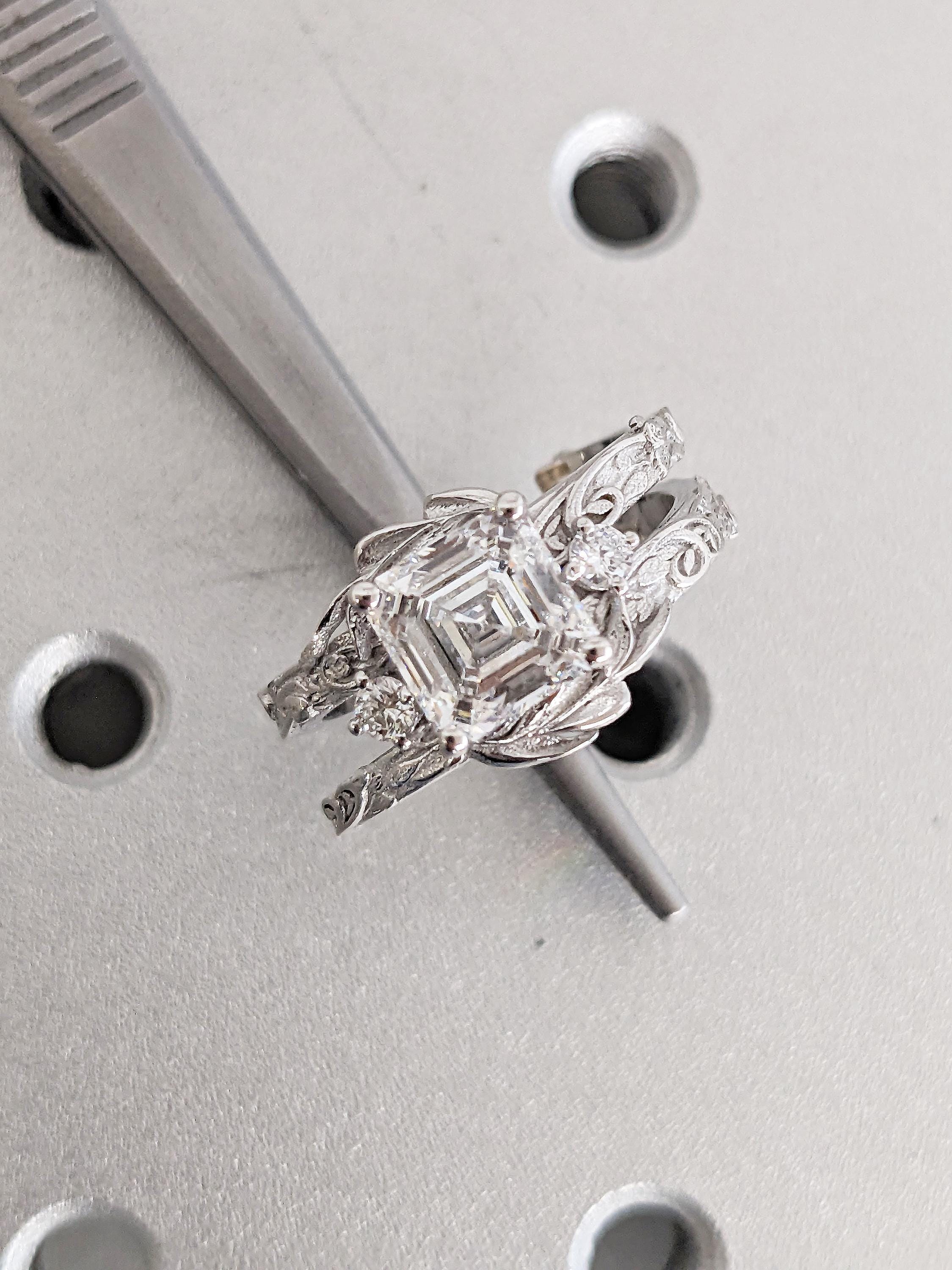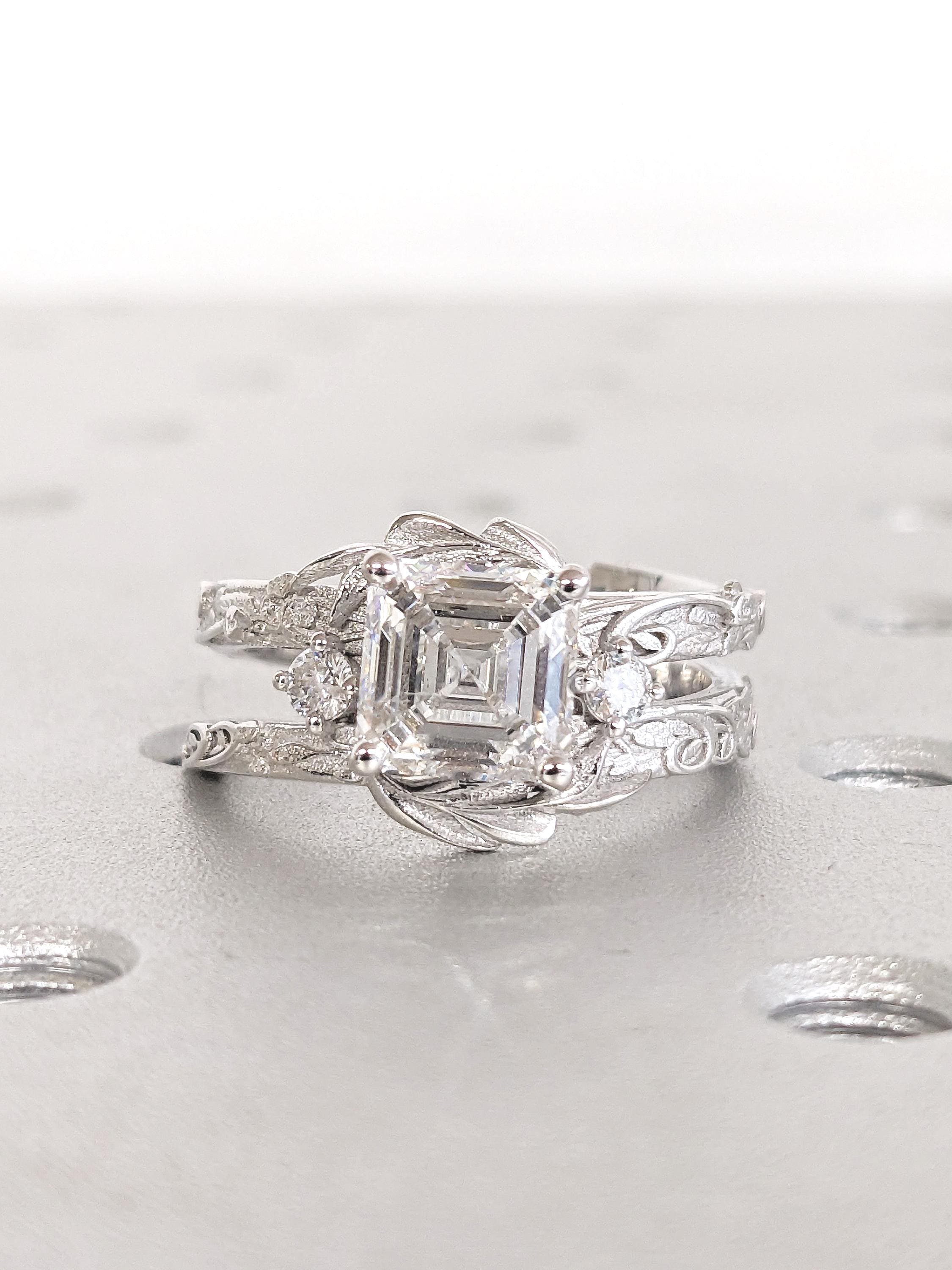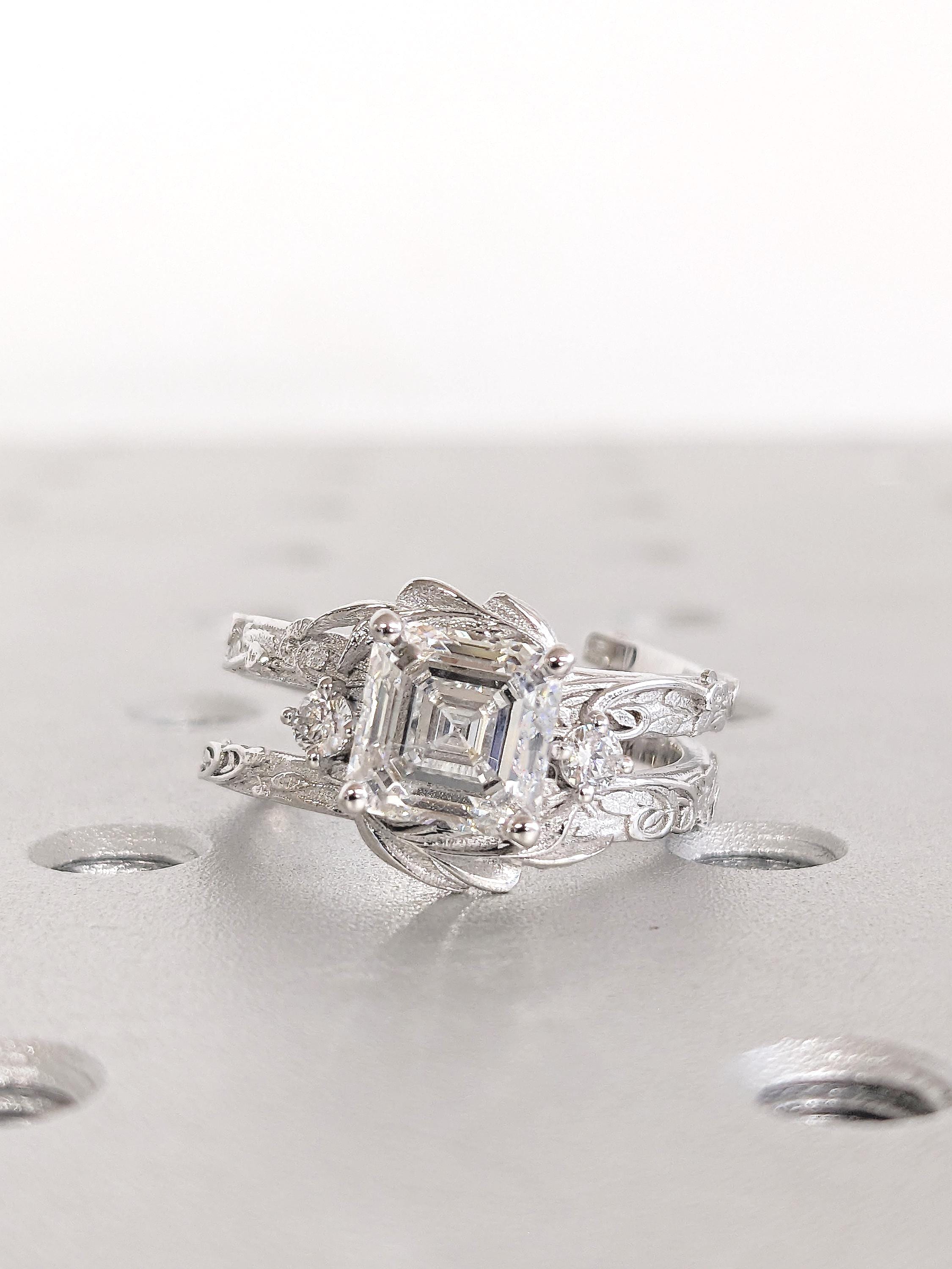 Antique Asscher Cut Ring, Nature Inspired Moissanite Ring, Floral Ring, 18k White Gold Ring
