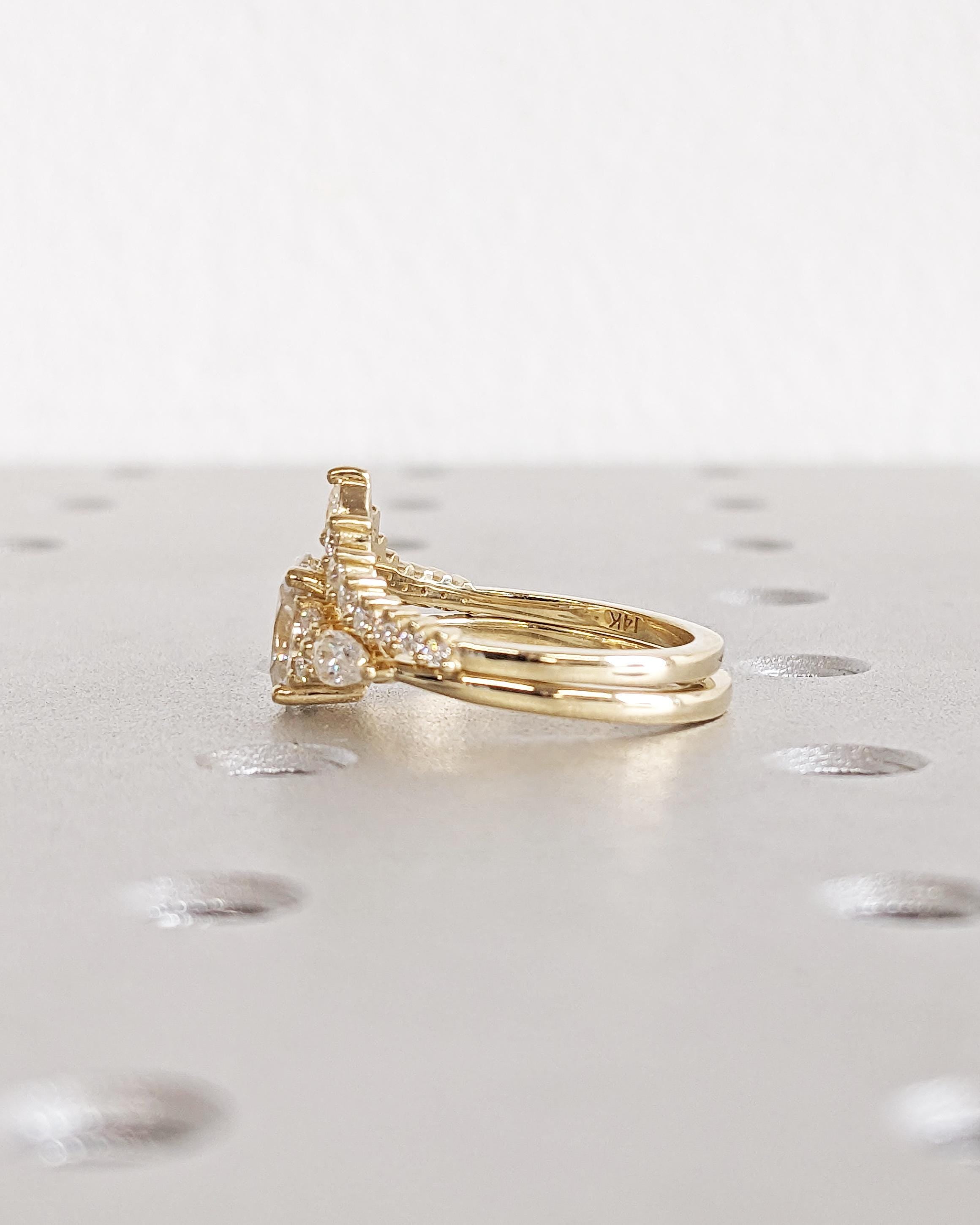 Antique Style Vintage Bridal Wedding Ring Set: Oval Moissanite Ring with Diamond Accents, Chevron Diamond Cluster Band, 14K Yellow Gold