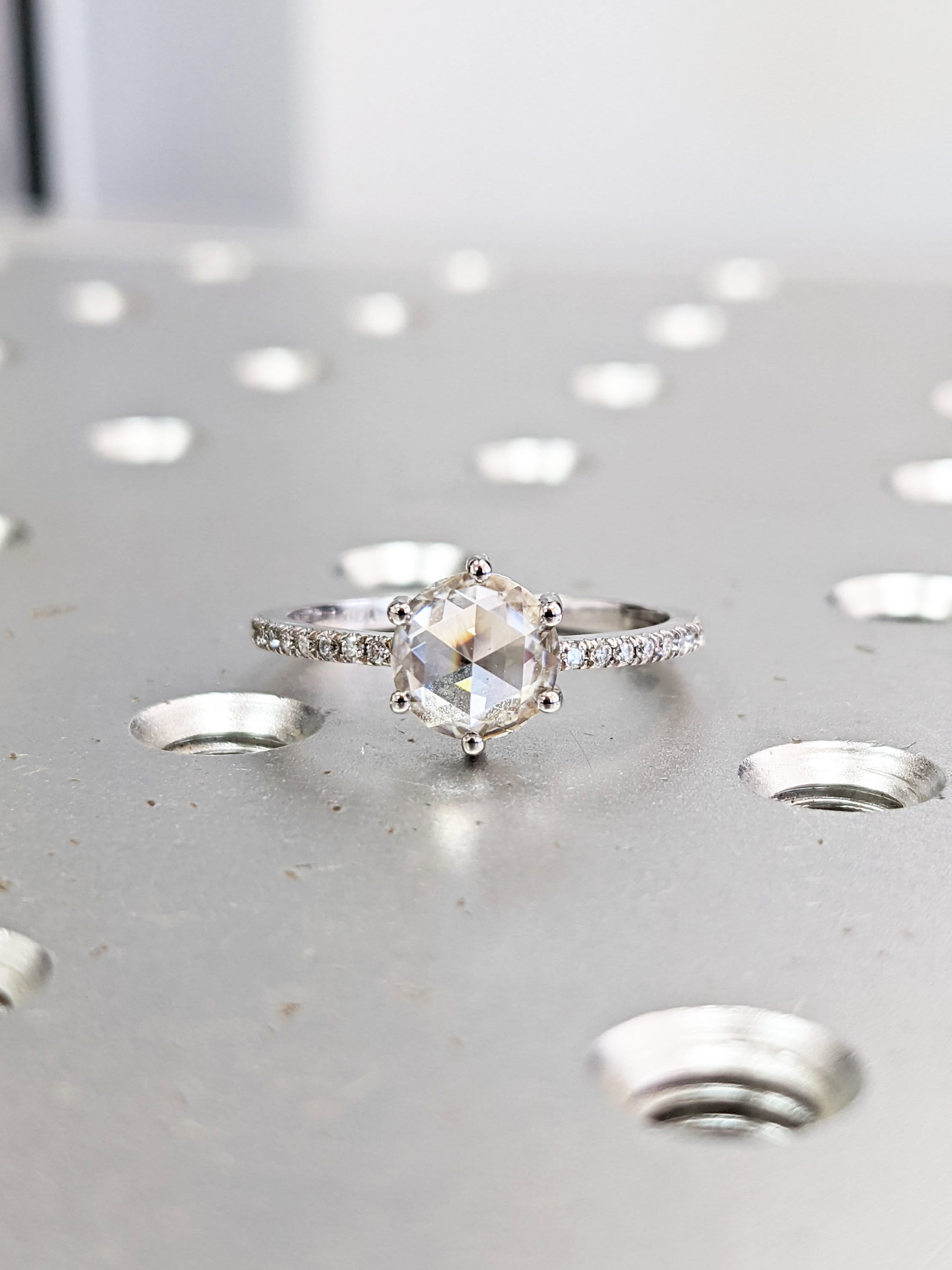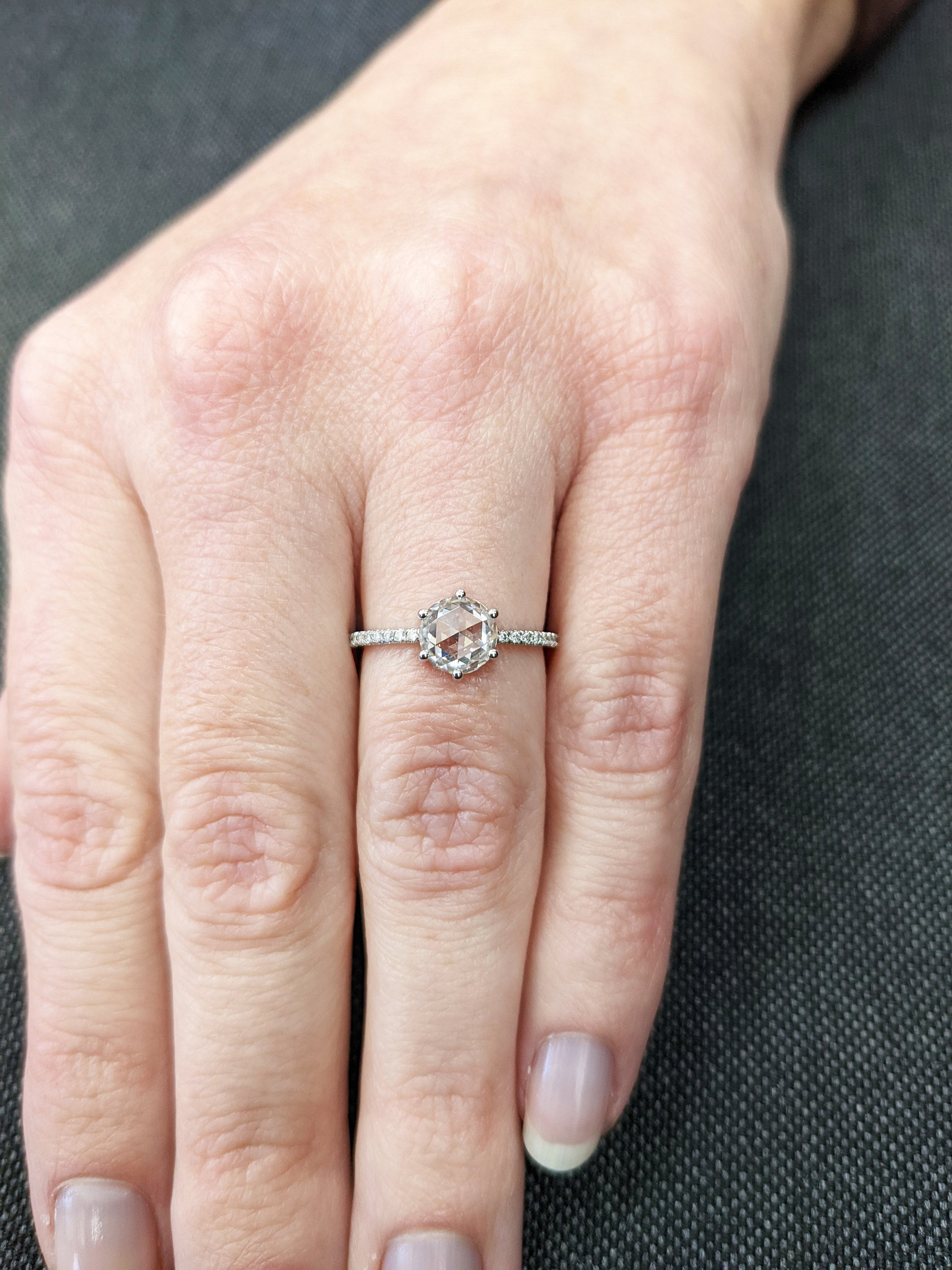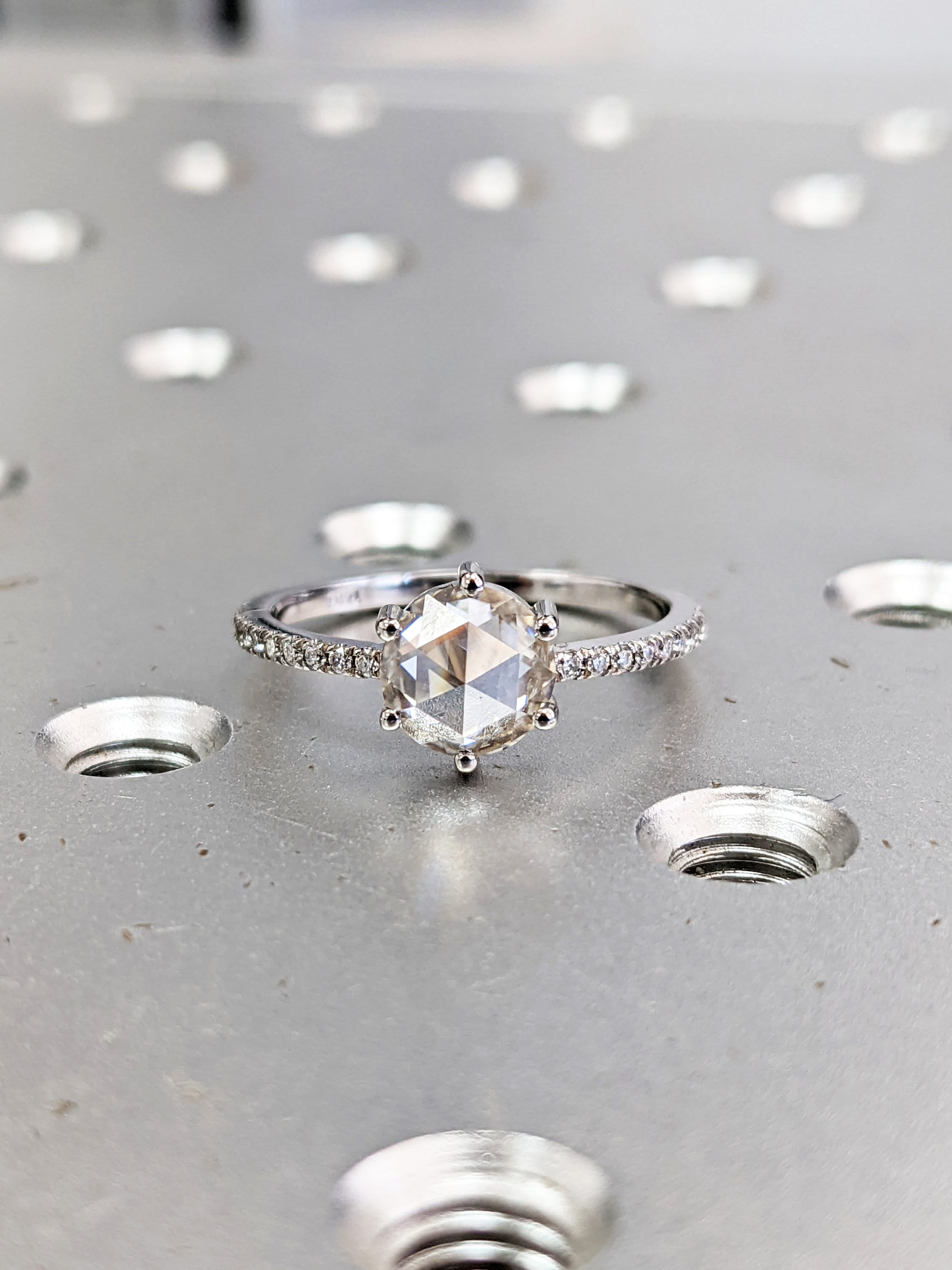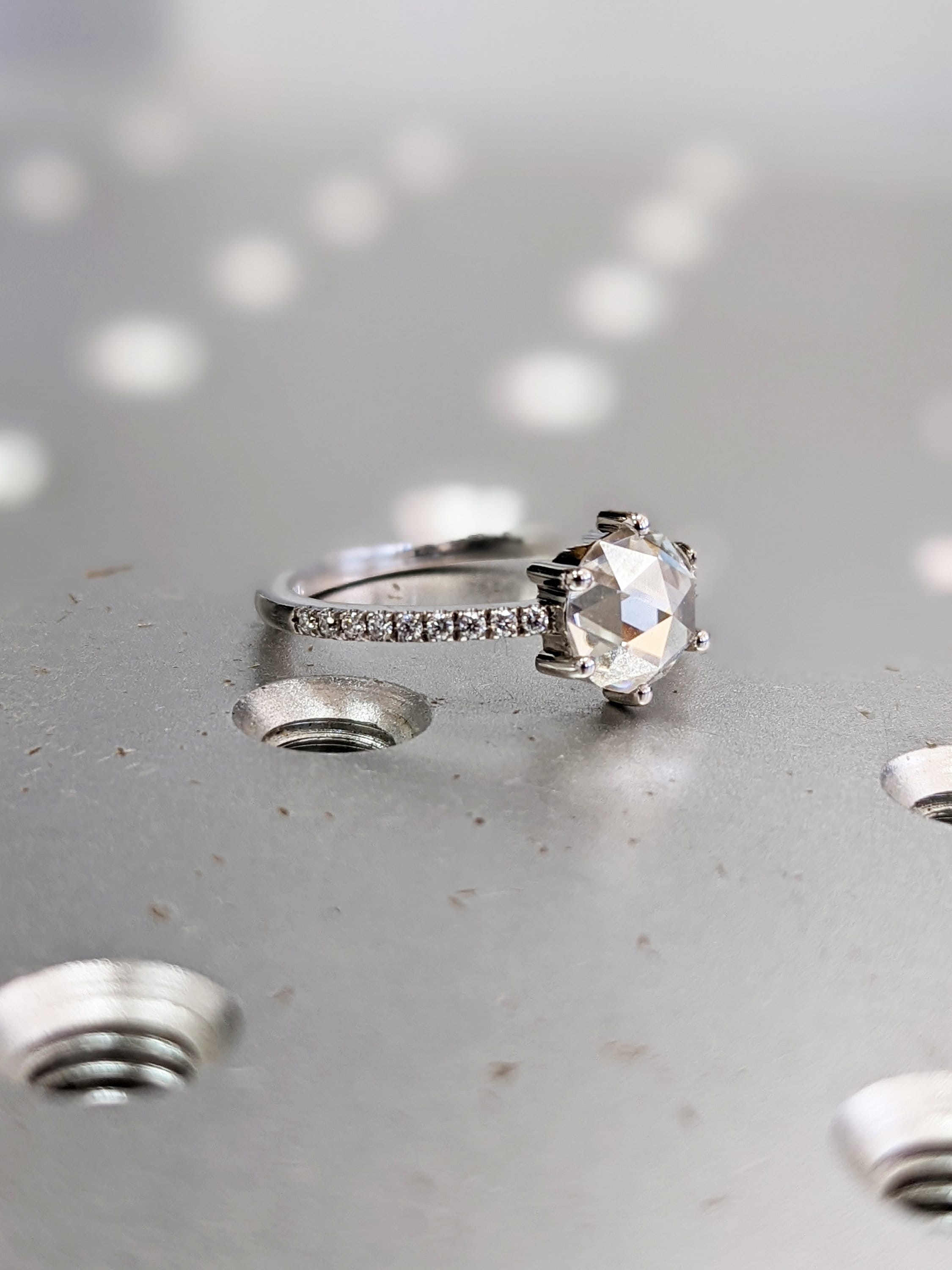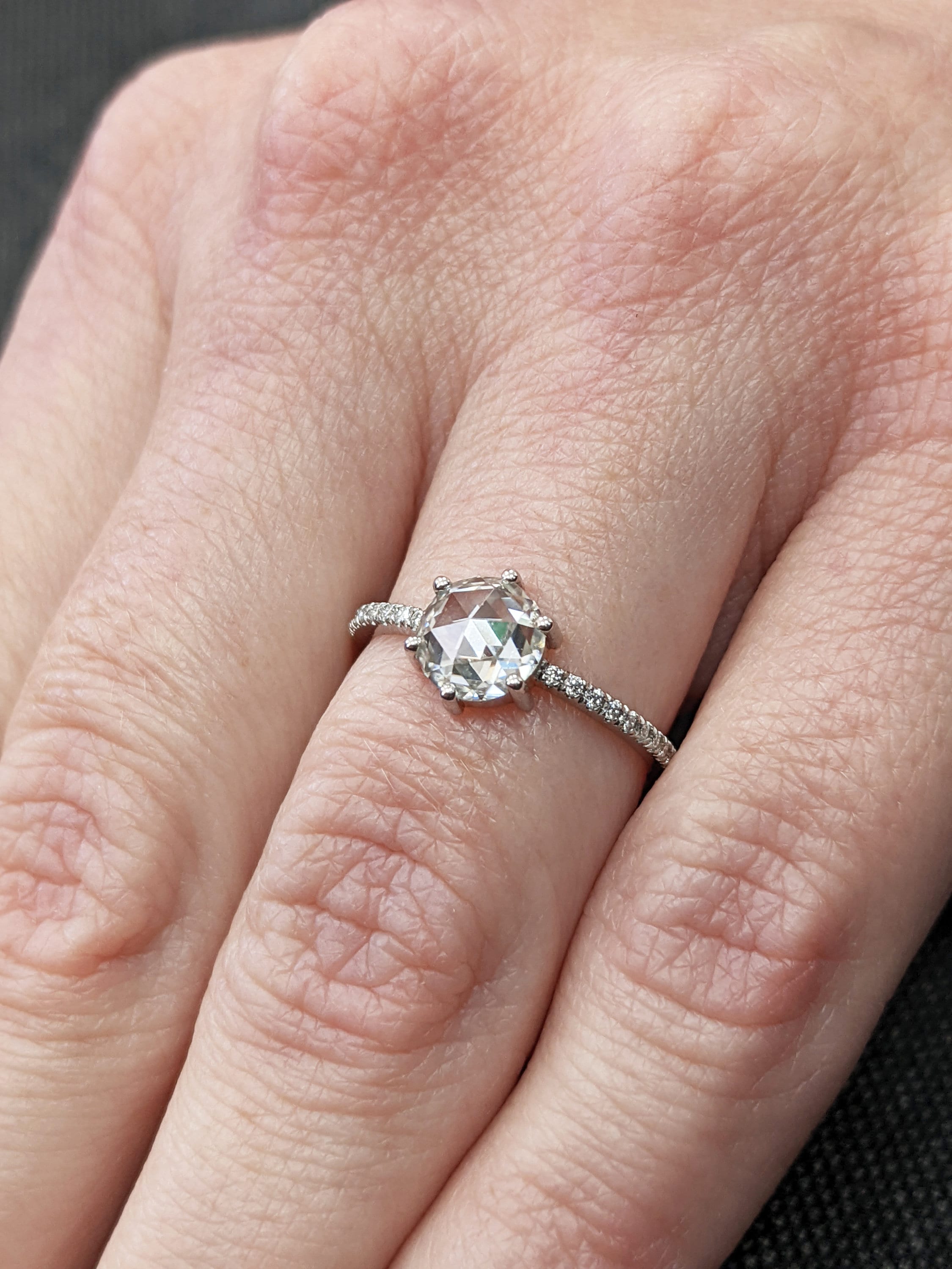 A beautiful round rose cut shaped moissanite, set with a super delicate and thin setting, paved with a row of moissanites from both sides, a thin band of 1.4mm width, make this ring a true stunner!