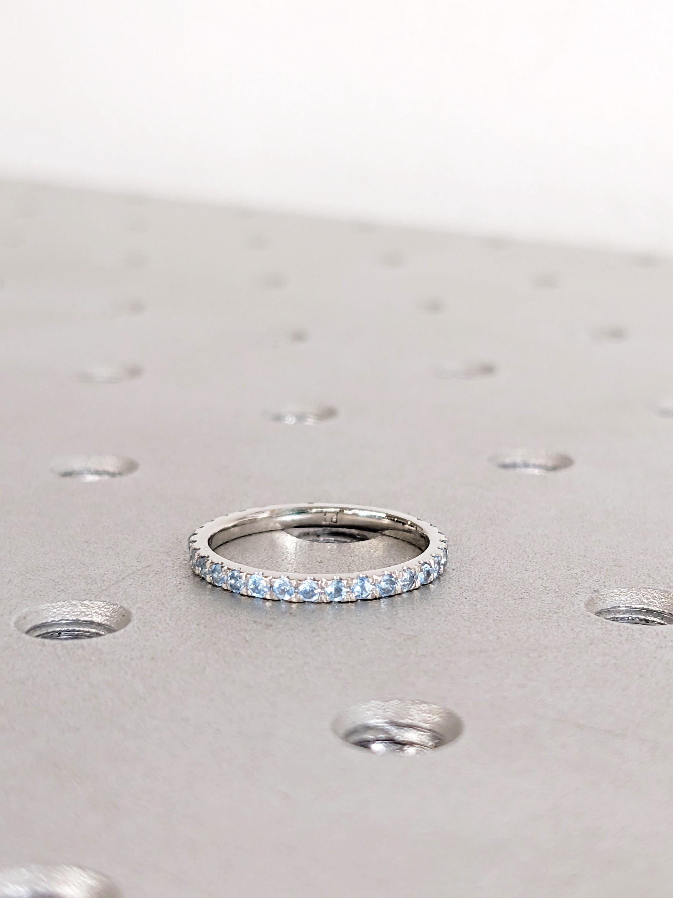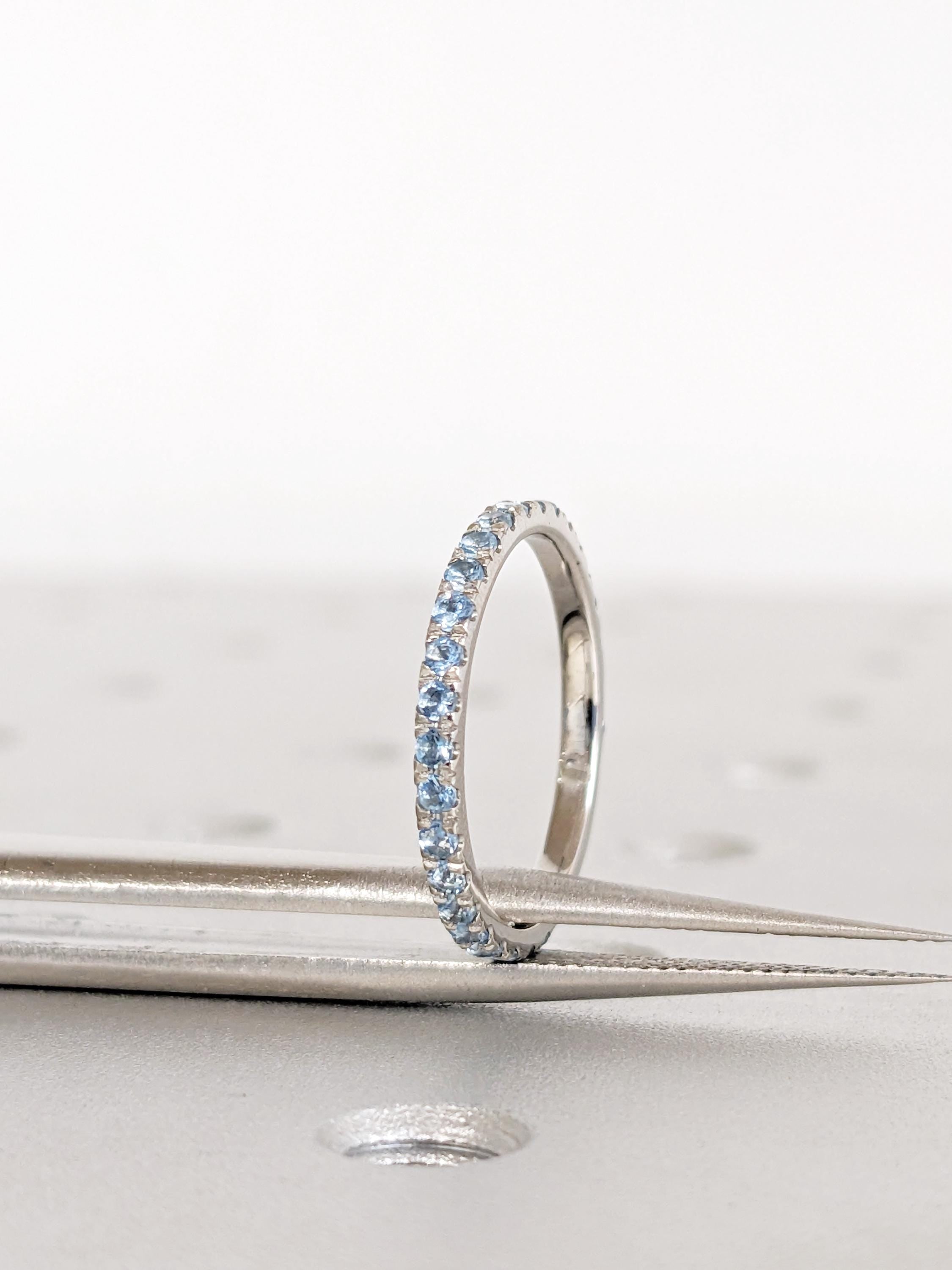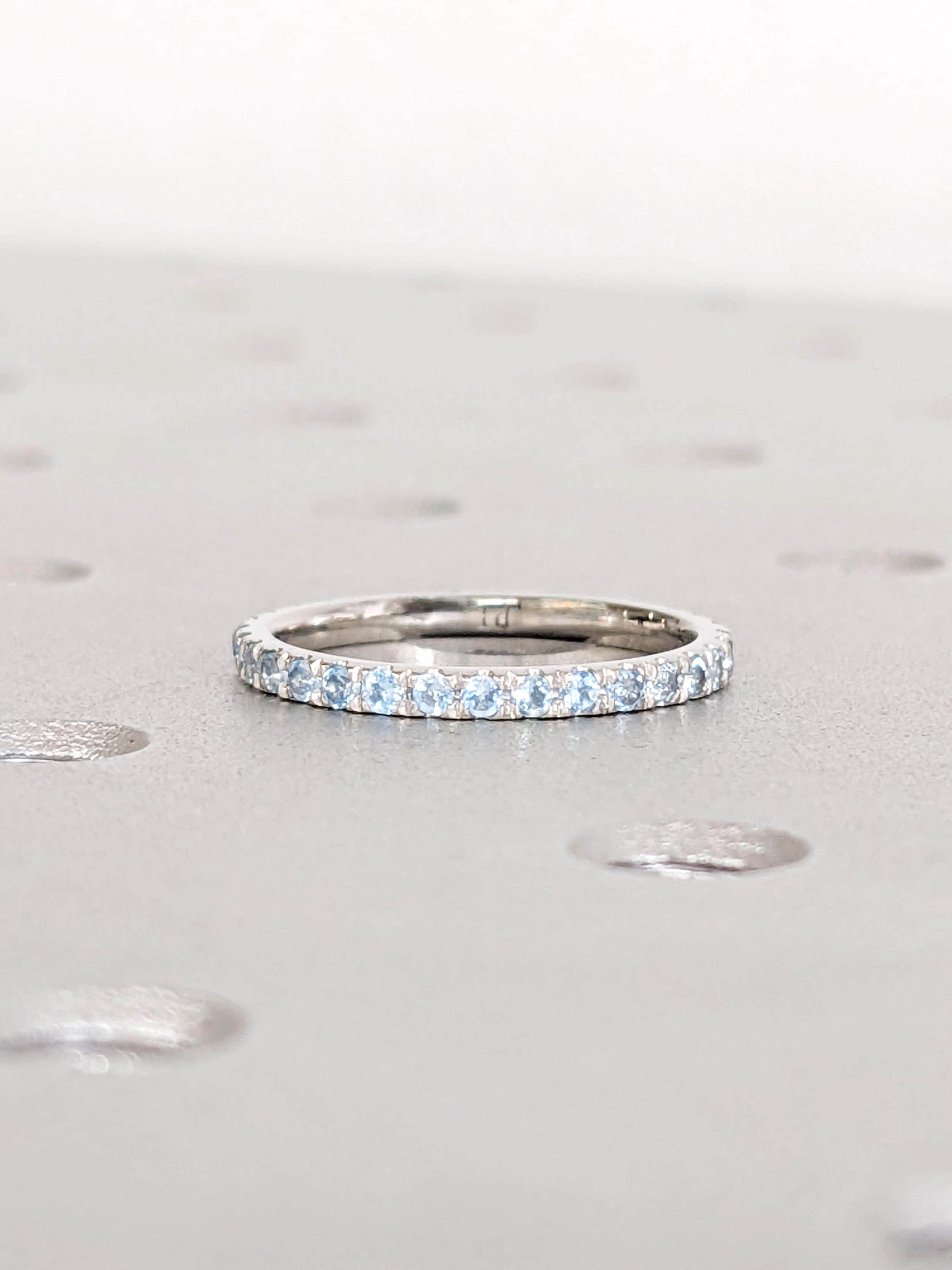 This Aquamarine wedding band brings a soft light-blue glow with round Aquamarine side stones set in a delicate pave band. The calm color and slim design make it a lovely choice for a wedding band, matching band, or everyday ring, adding a bright and elegant touch to any stack.