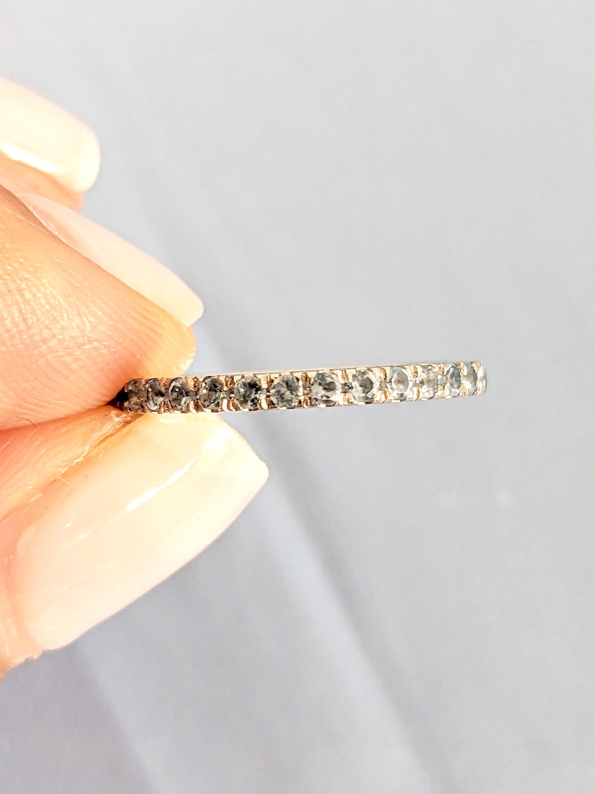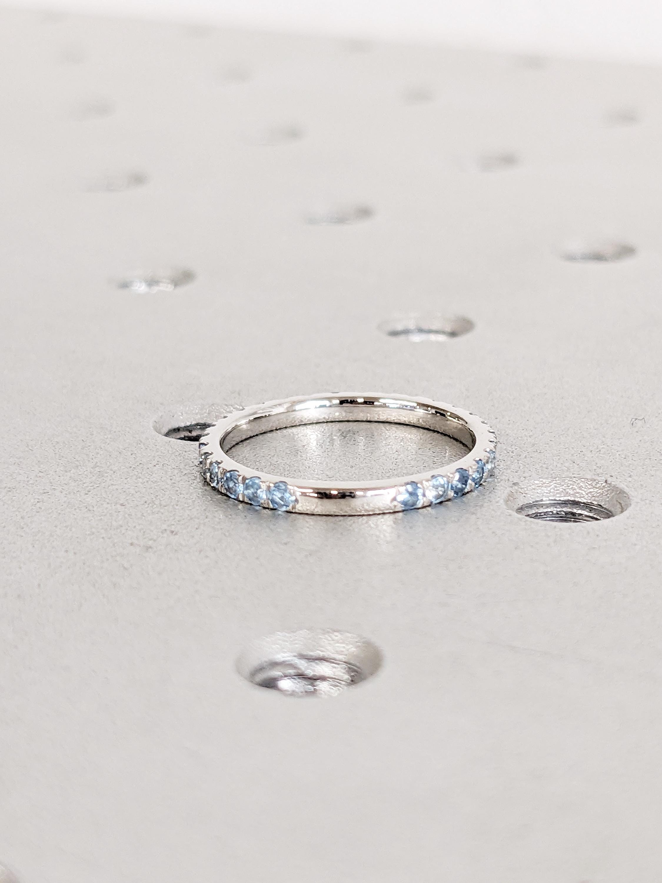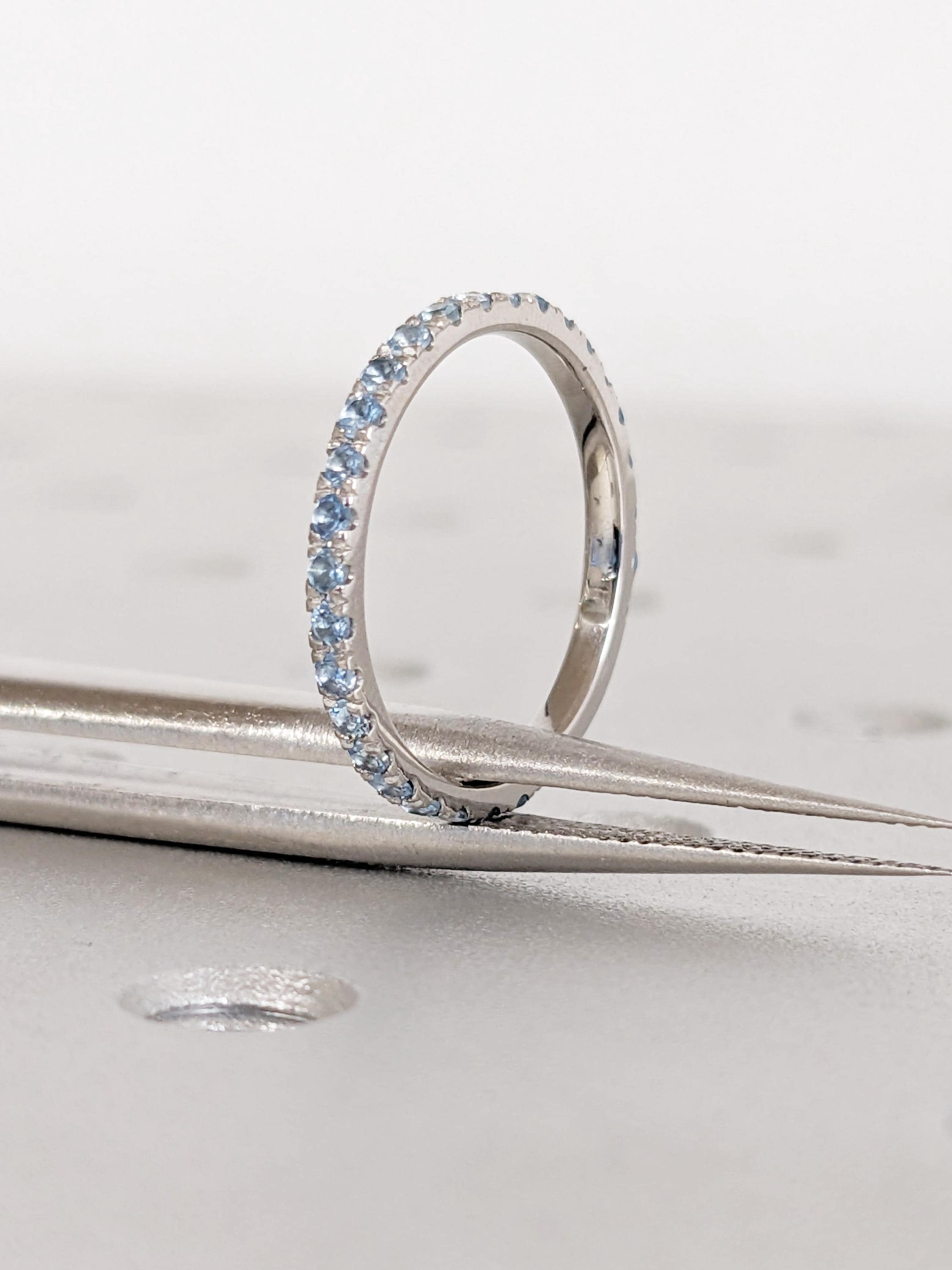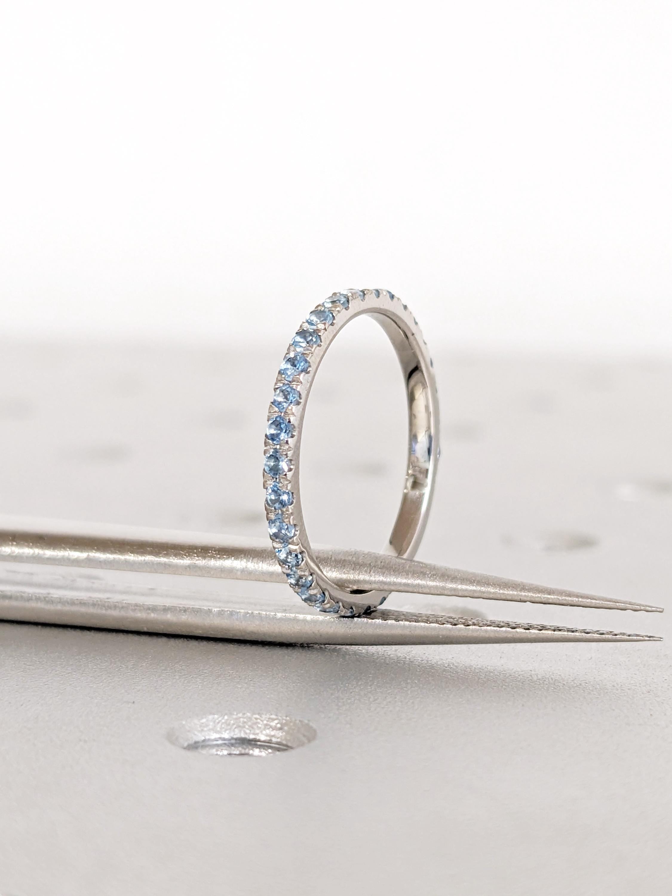 This Aquamarine wedding band brings a soft light-blue glow with round Aquamarine side stones set in a delicate pave band. The calm color and slim design make it a lovely choice for a wedding band, matching band, or everyday ring, adding a bright and elegant touch to any stack.