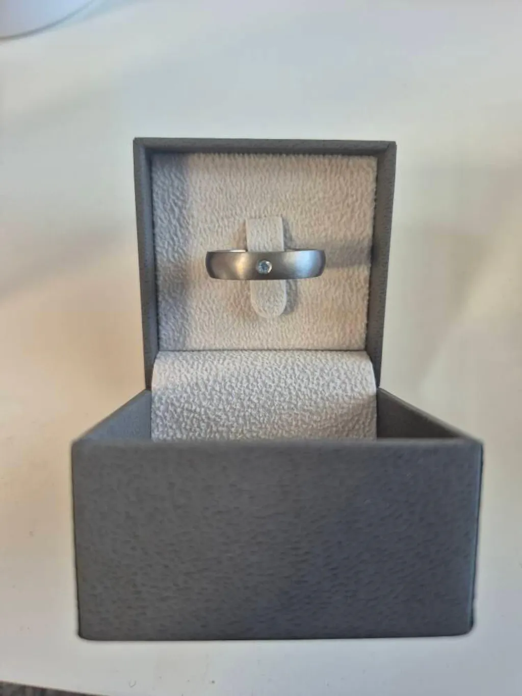 Expertly crafted from the finest titanium, this handmade dome wedding band features a sleek satin brushed finish with a flat top. Adorned with a stunning pretty gem, the ring offers a comfortable fit for lasting elegance.