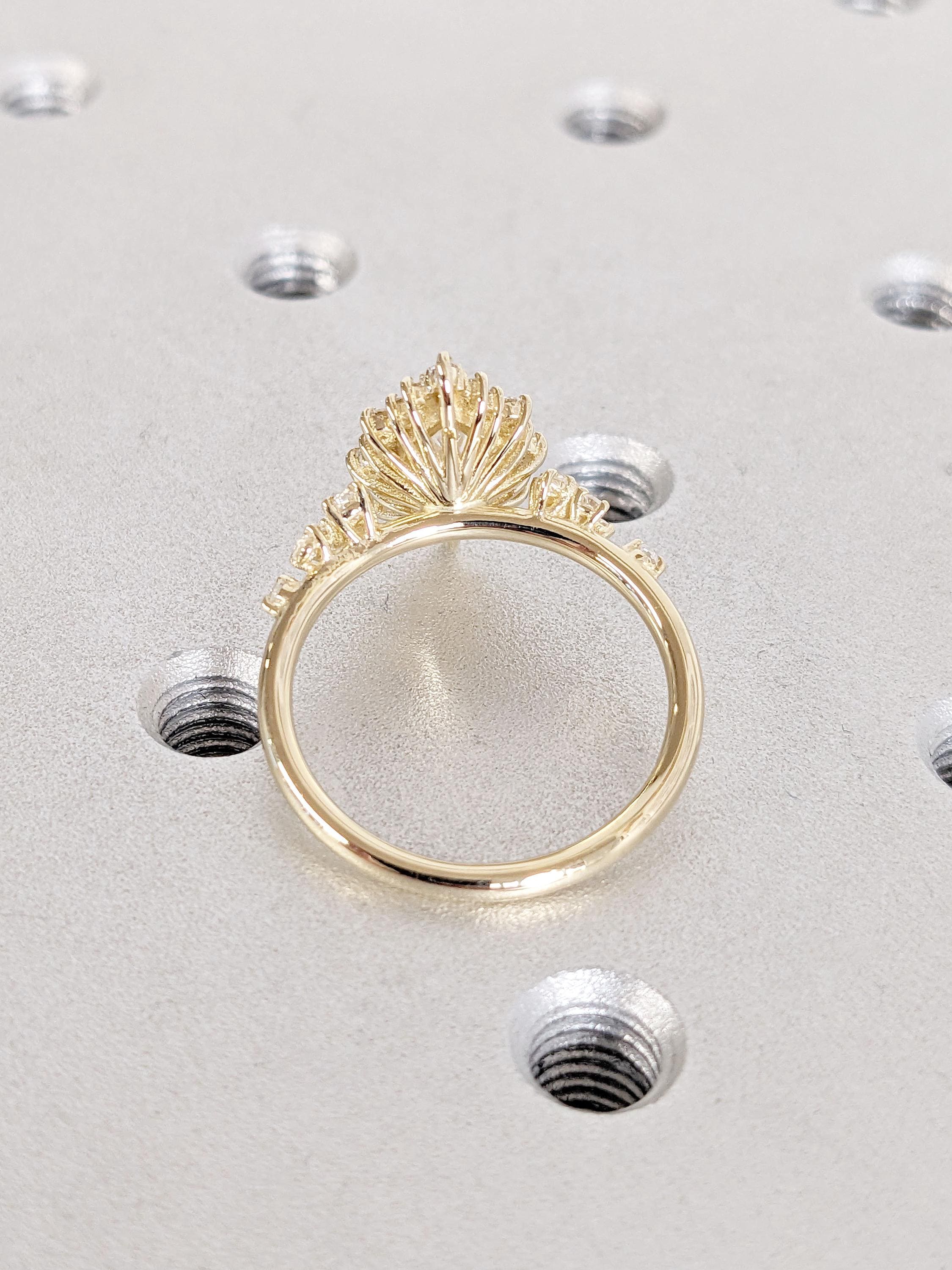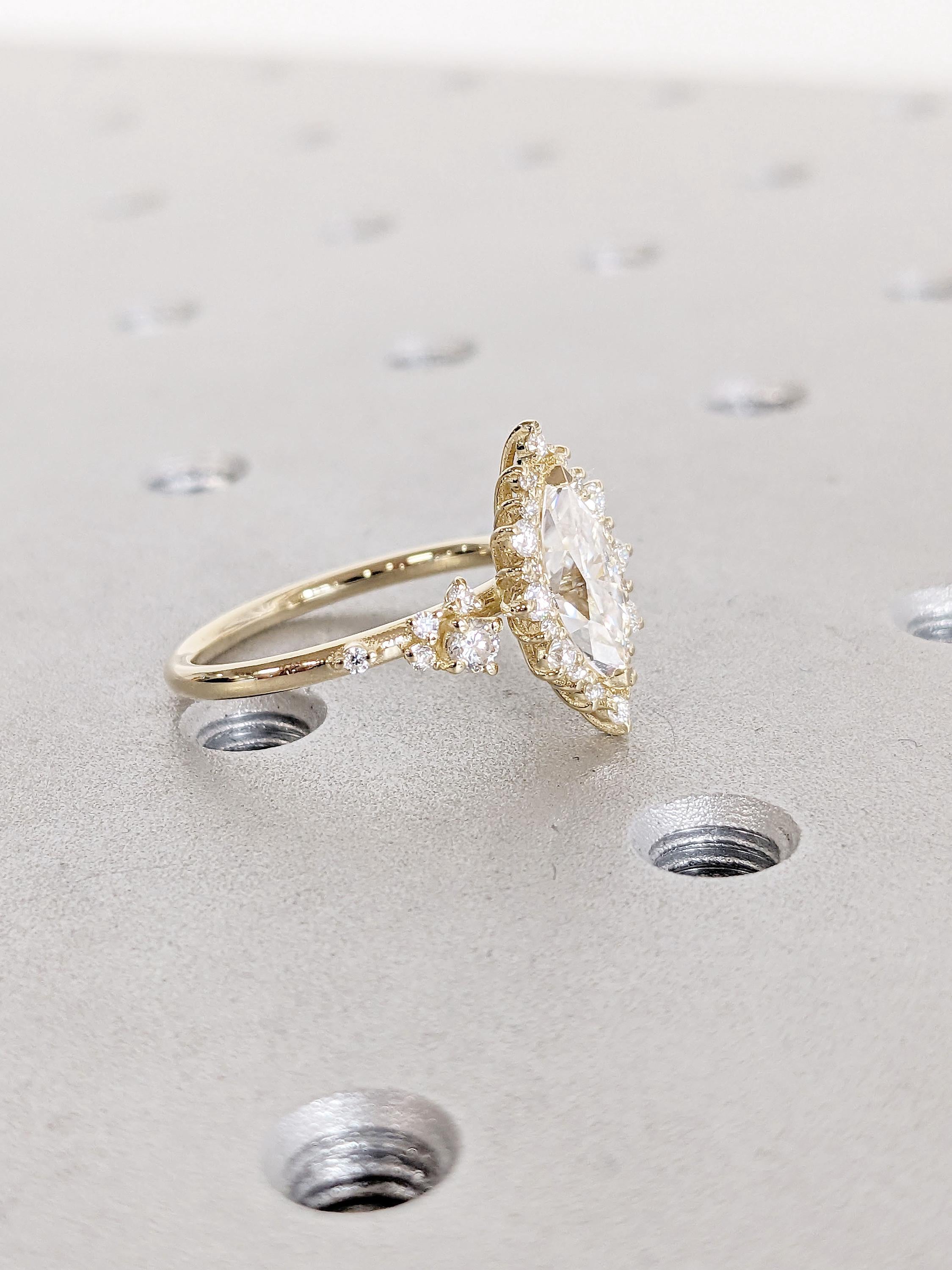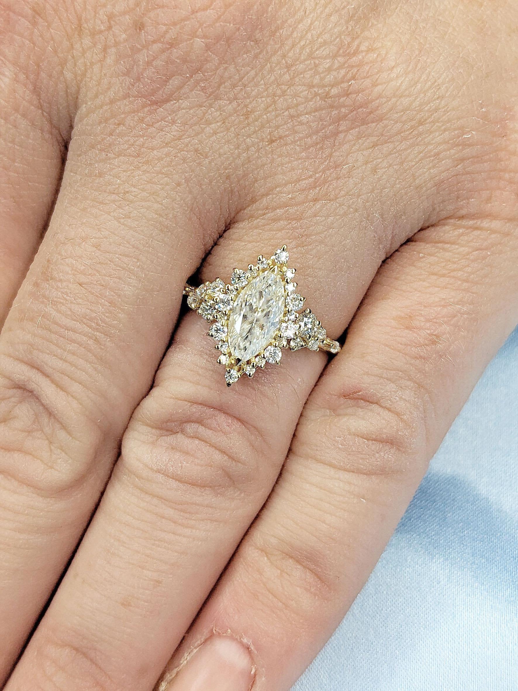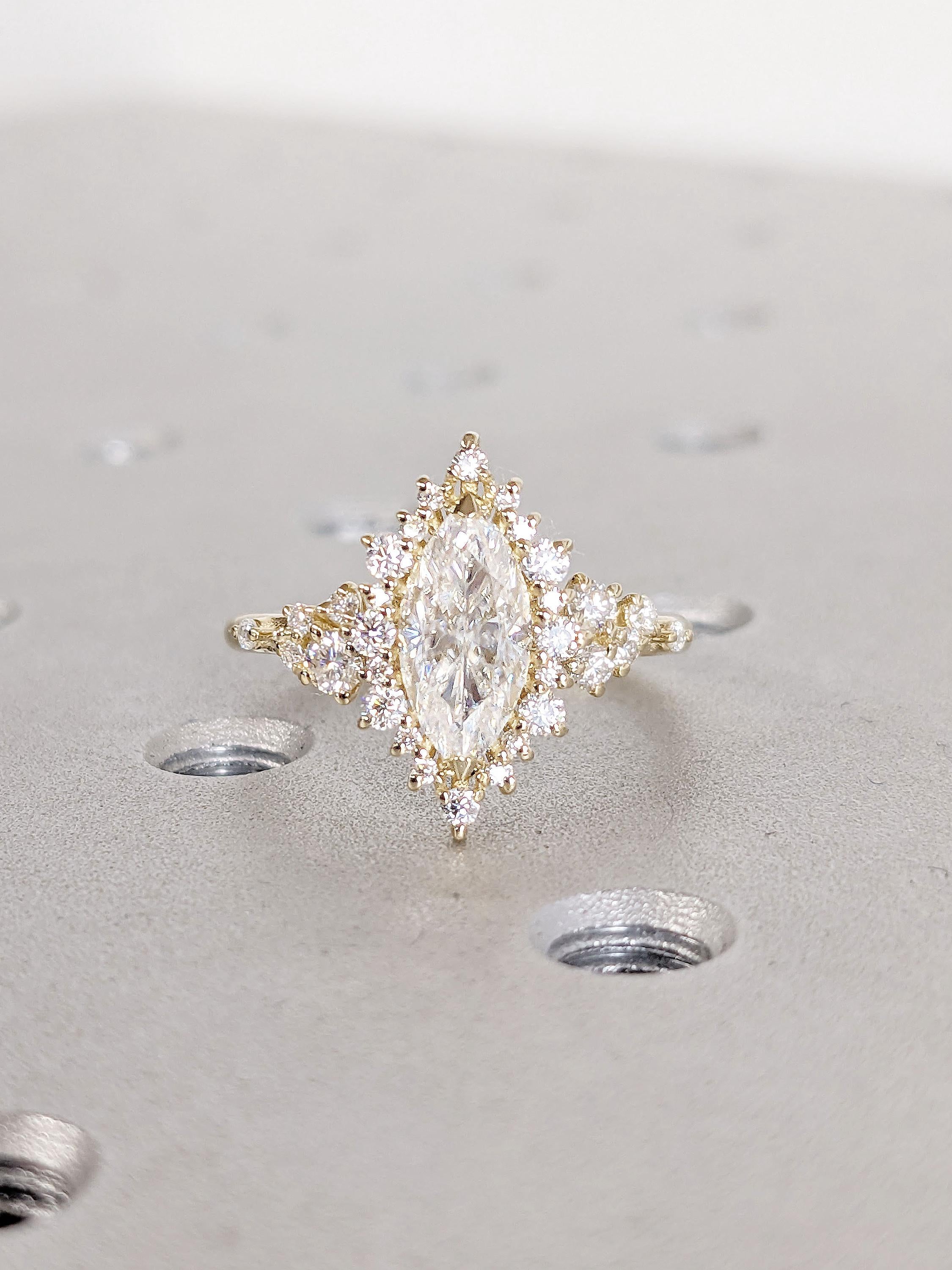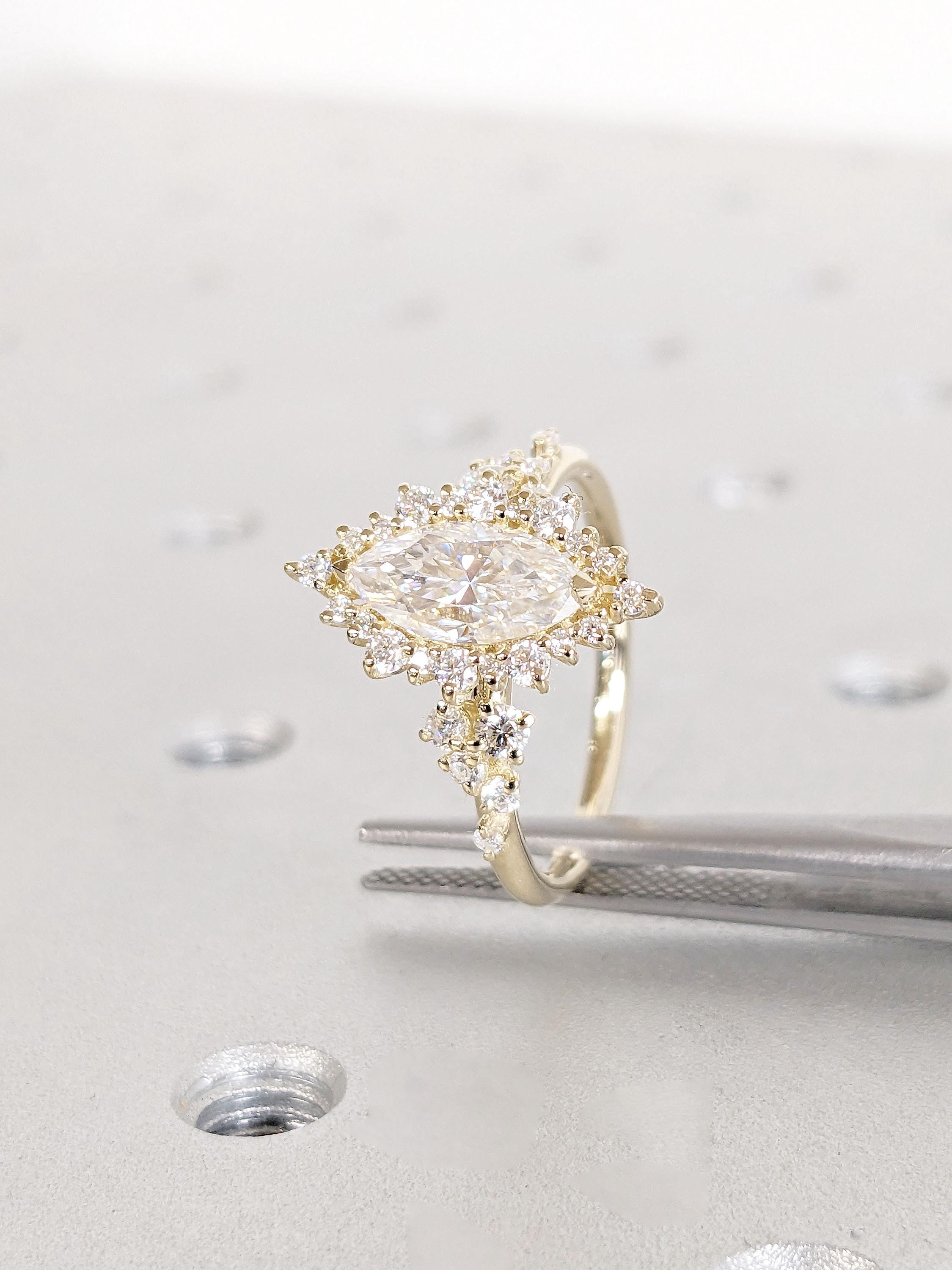Luxurious and regal, this statement ring features a marquise cut Moissanite center, with an intricate halo of sparkling side stones in various sizes held elegantly in prong setting that resembles a lotus leaf's veins. Accented by clusters of natural diamonds, lab diamonds or moissanites, drifting along the dainty band of 1.8mm width, like freshly fallen snow. A handmade masterpiece fit for the princess in you. Perfect for proposal, engagement, wedding anniversary or that special woman in your life.