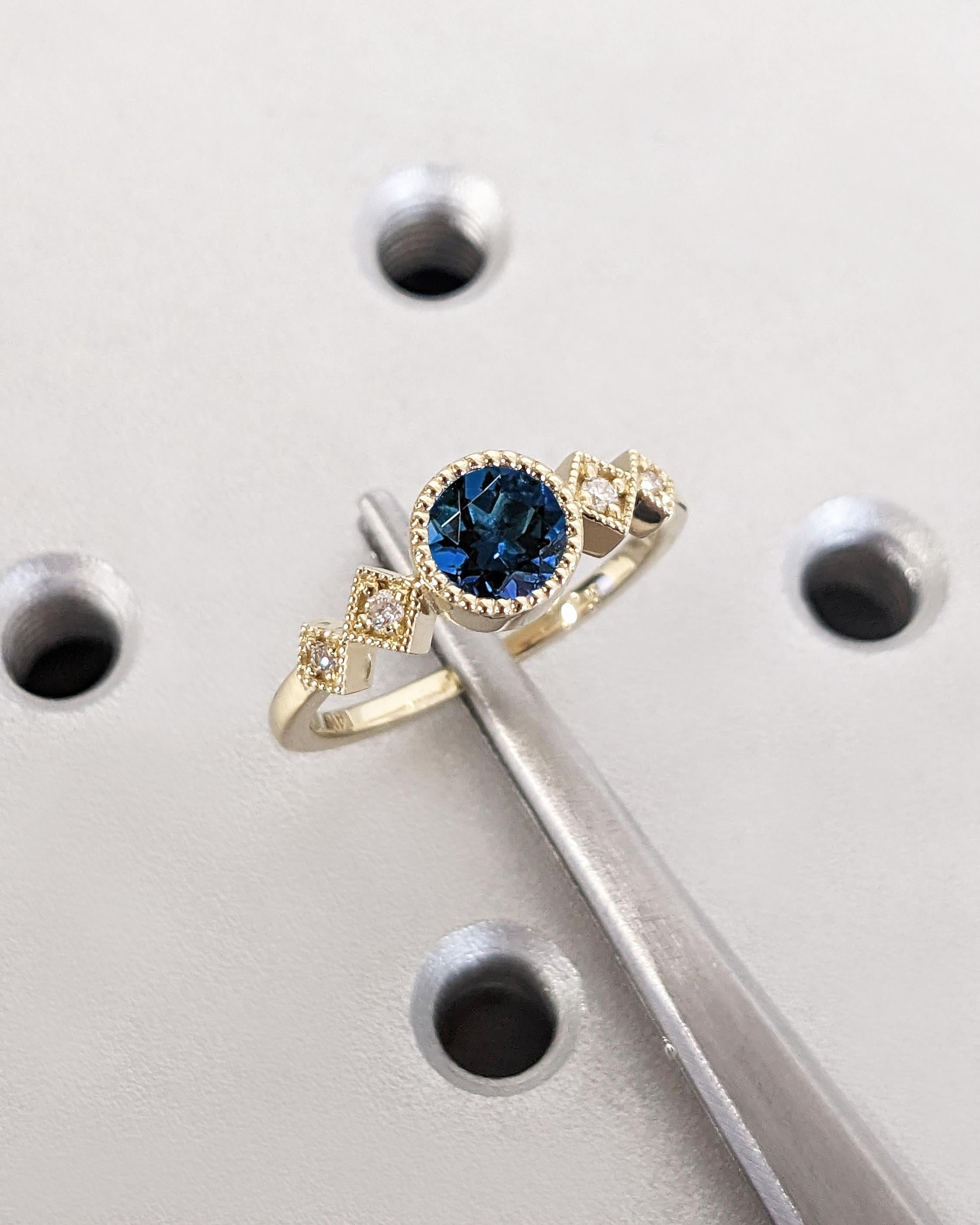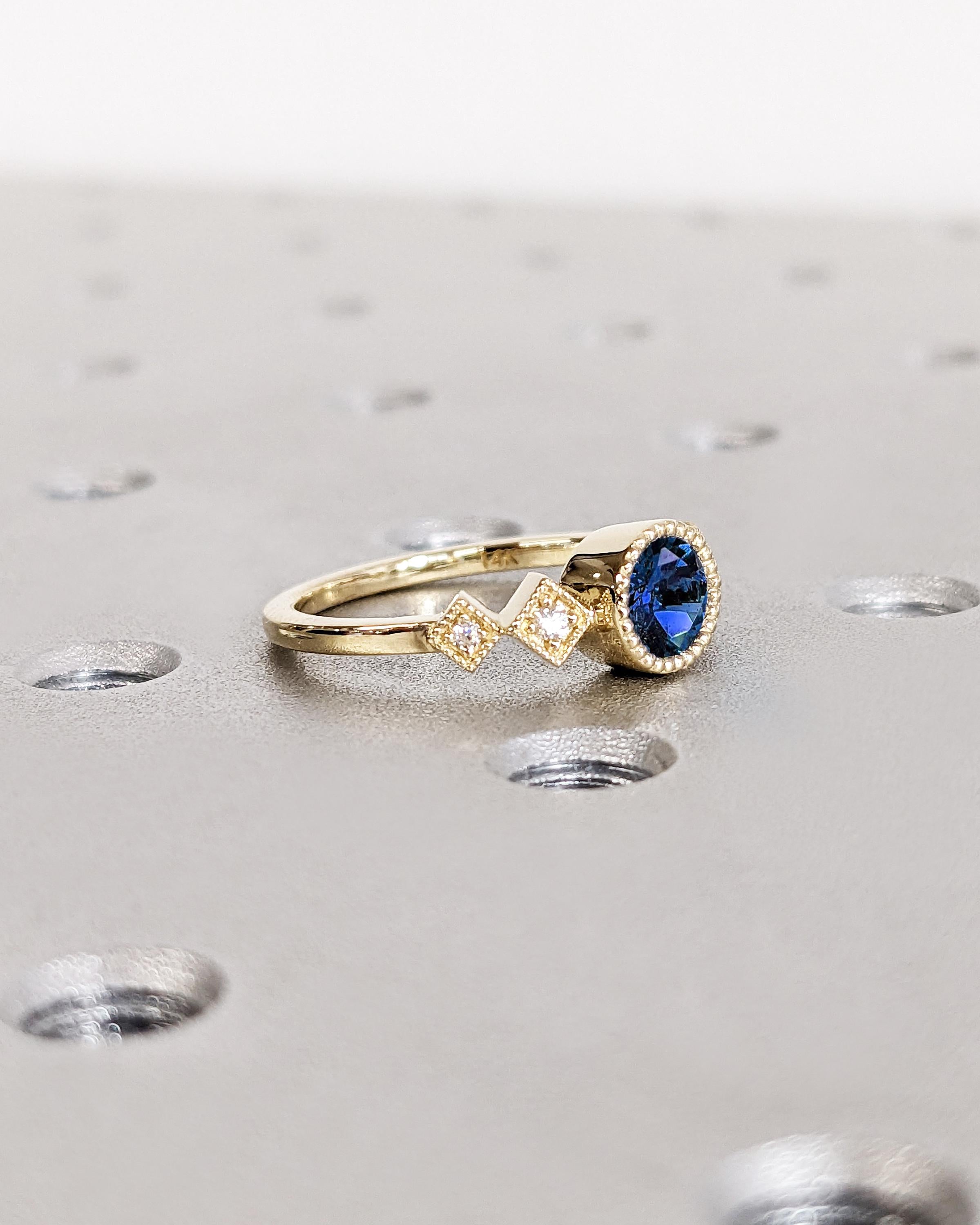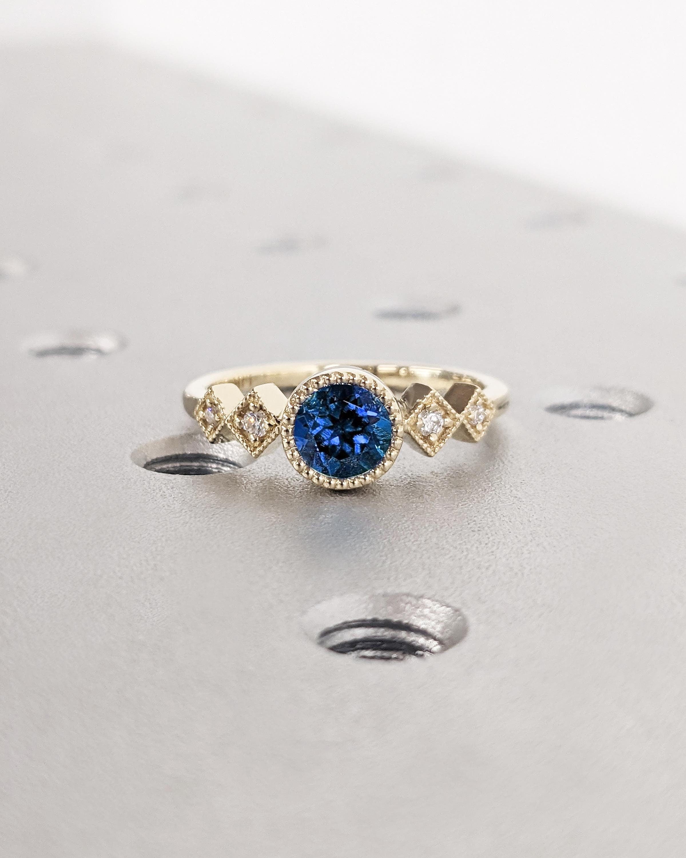Designed for the alternative bride, this engagement ring combines vintage charm with contemporary style. The centerpiece of this five-stone ring is a dazzling round-cut lab sapphire, securely held in a round bezel setting with exquisite milgrain detail. The band is adorned with four round-cut side stones, also bezel-set with matching milgrain detailing. Choose from natural diamonds, lab diamonds, or moissanites for the side stones. This design is a beautiful harmony of shapes, making it an exceptional choice for a modern yet timeless engagement ring.