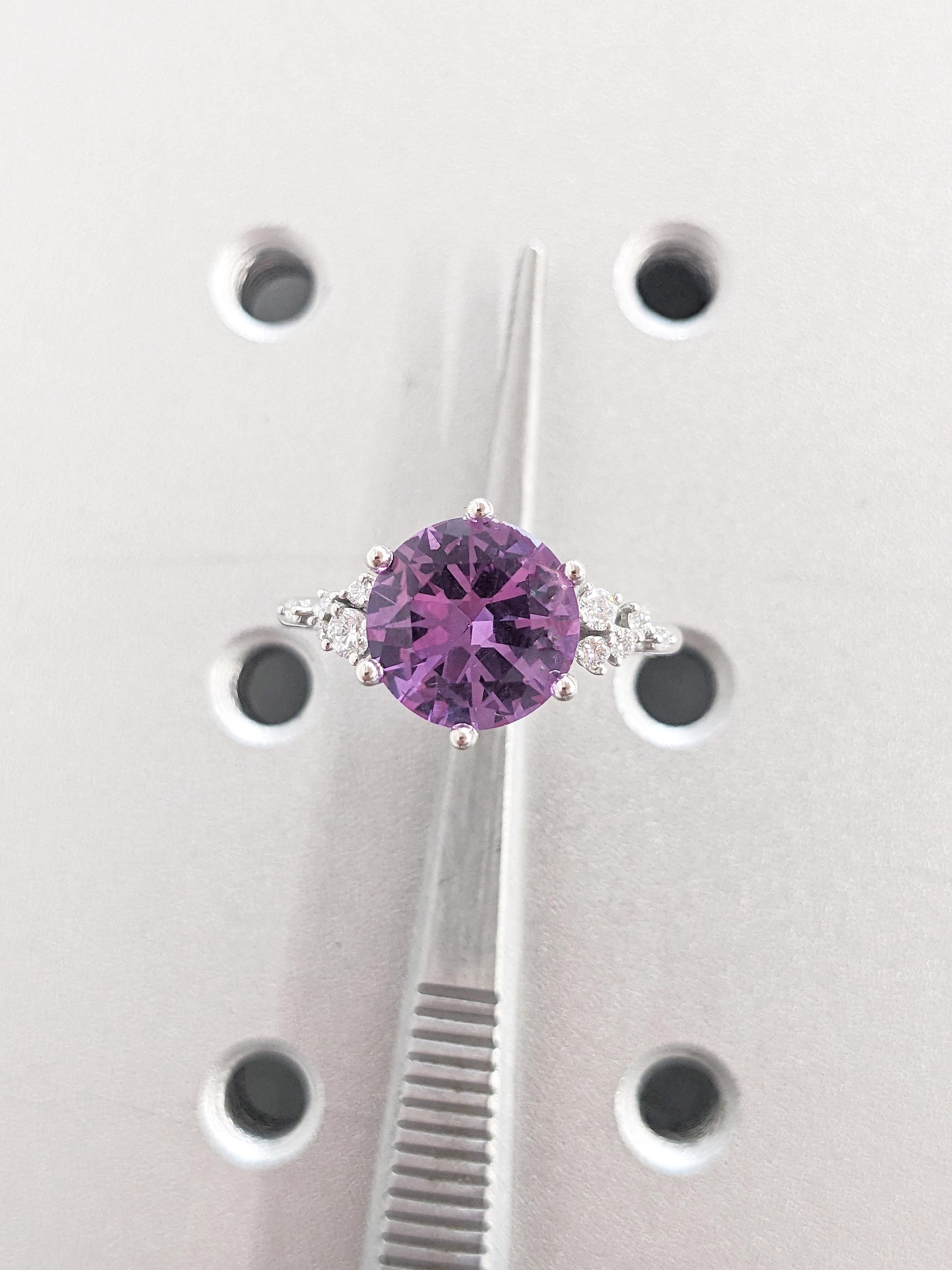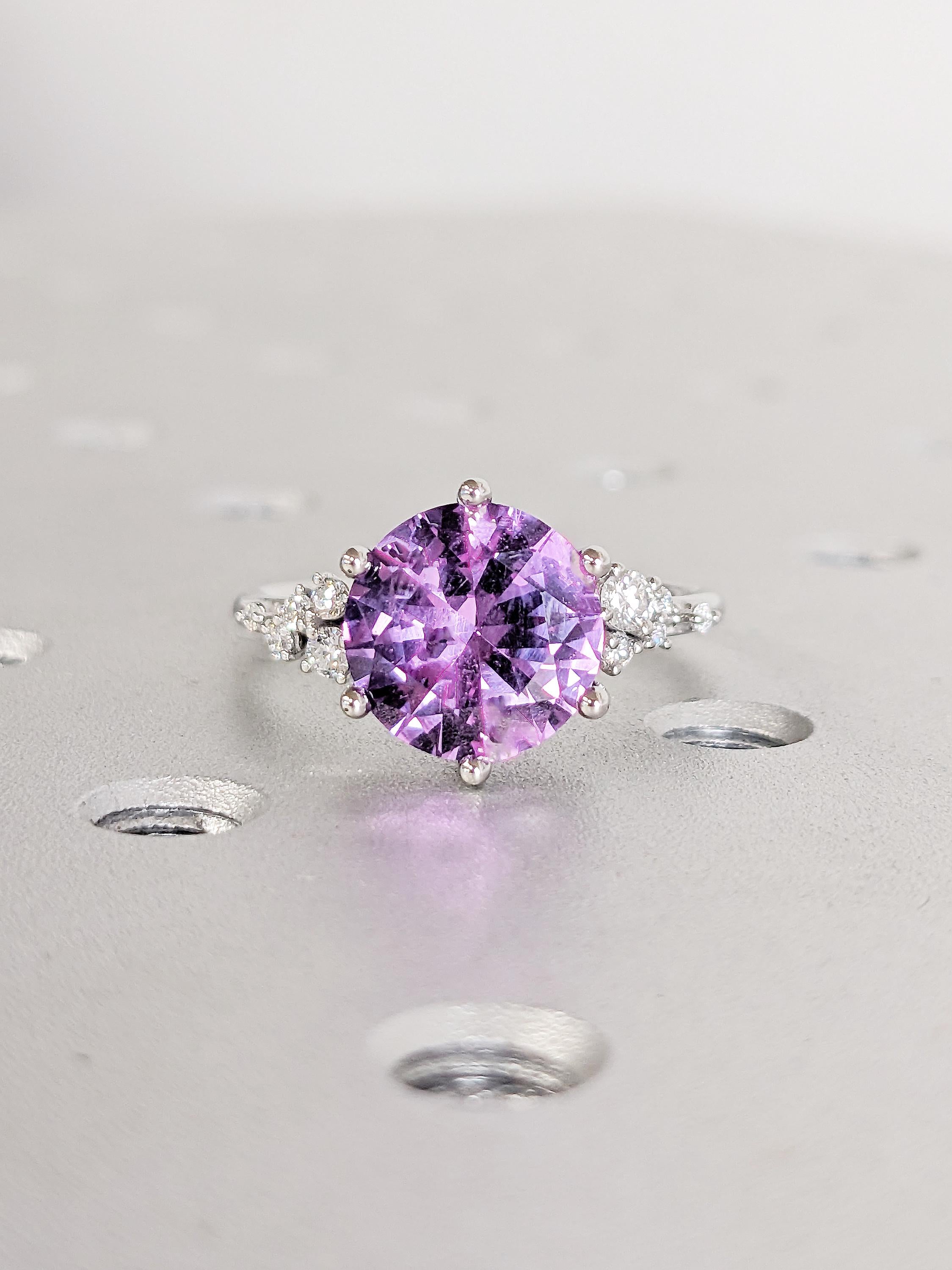 Celebrate your next chapter with our elegantly crafted engagement ring, featuring a captivating round cut Alexandrite in a prong setting. Accented by a cluster of Snowdrift Natural Diamonds, Lab-Grown Diamonds, or Moissanites, this meticulously handcrafted piece is a perfect symbol of your everlasting love.