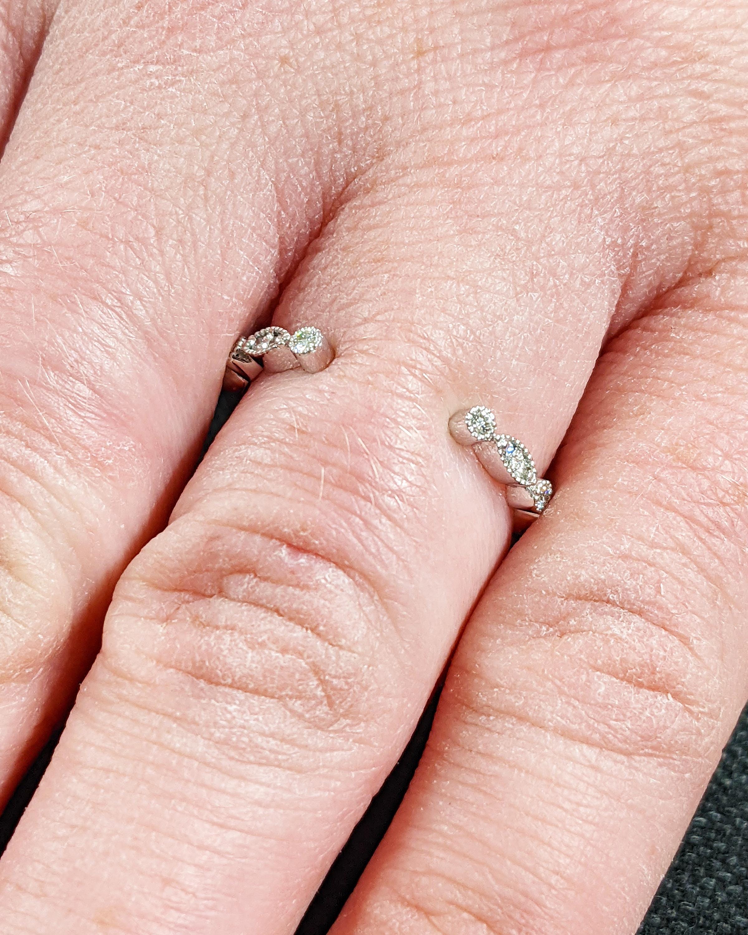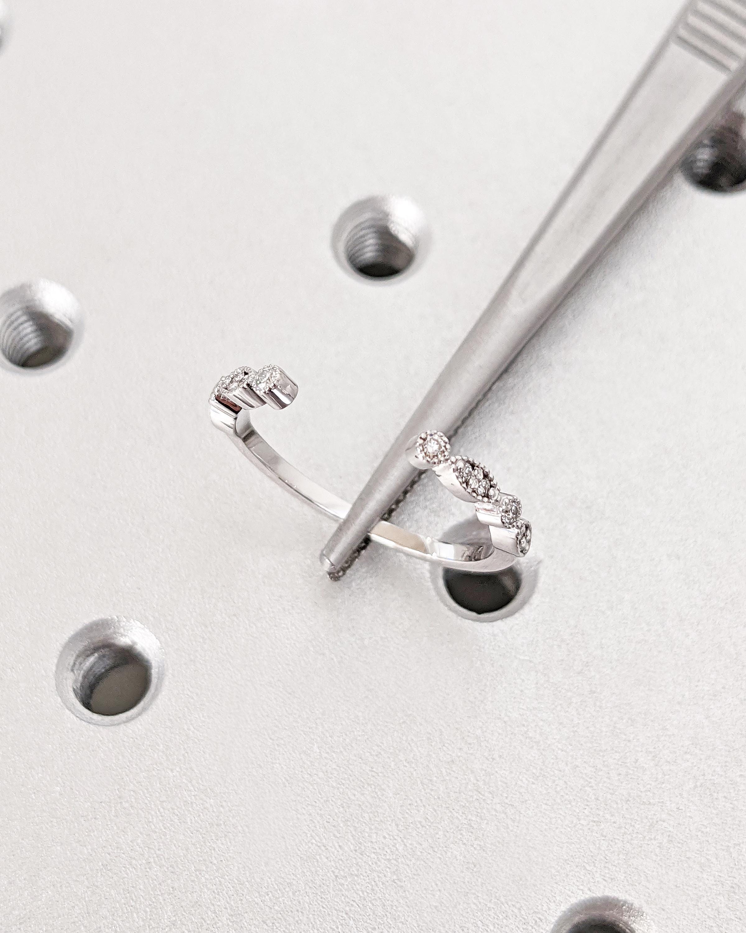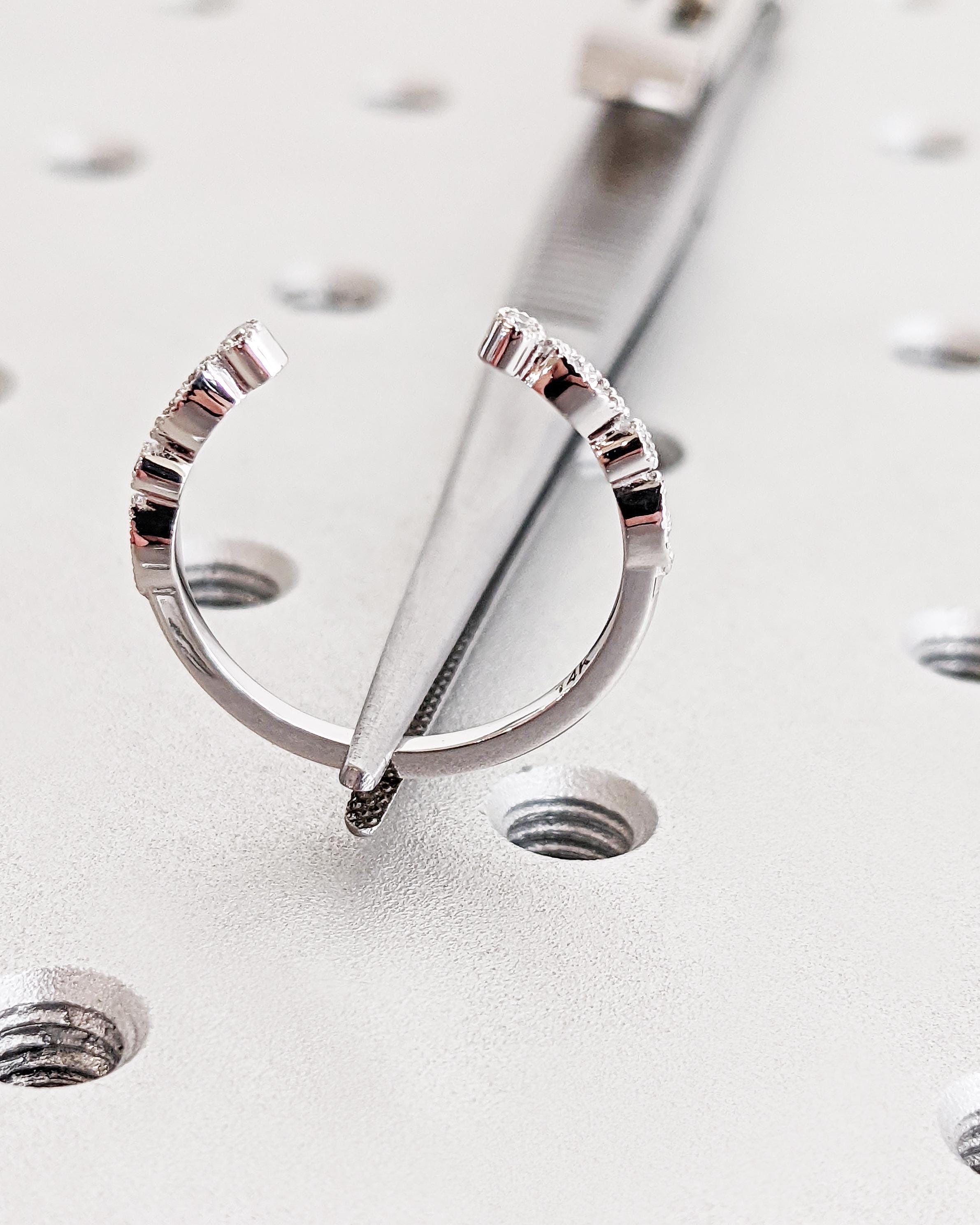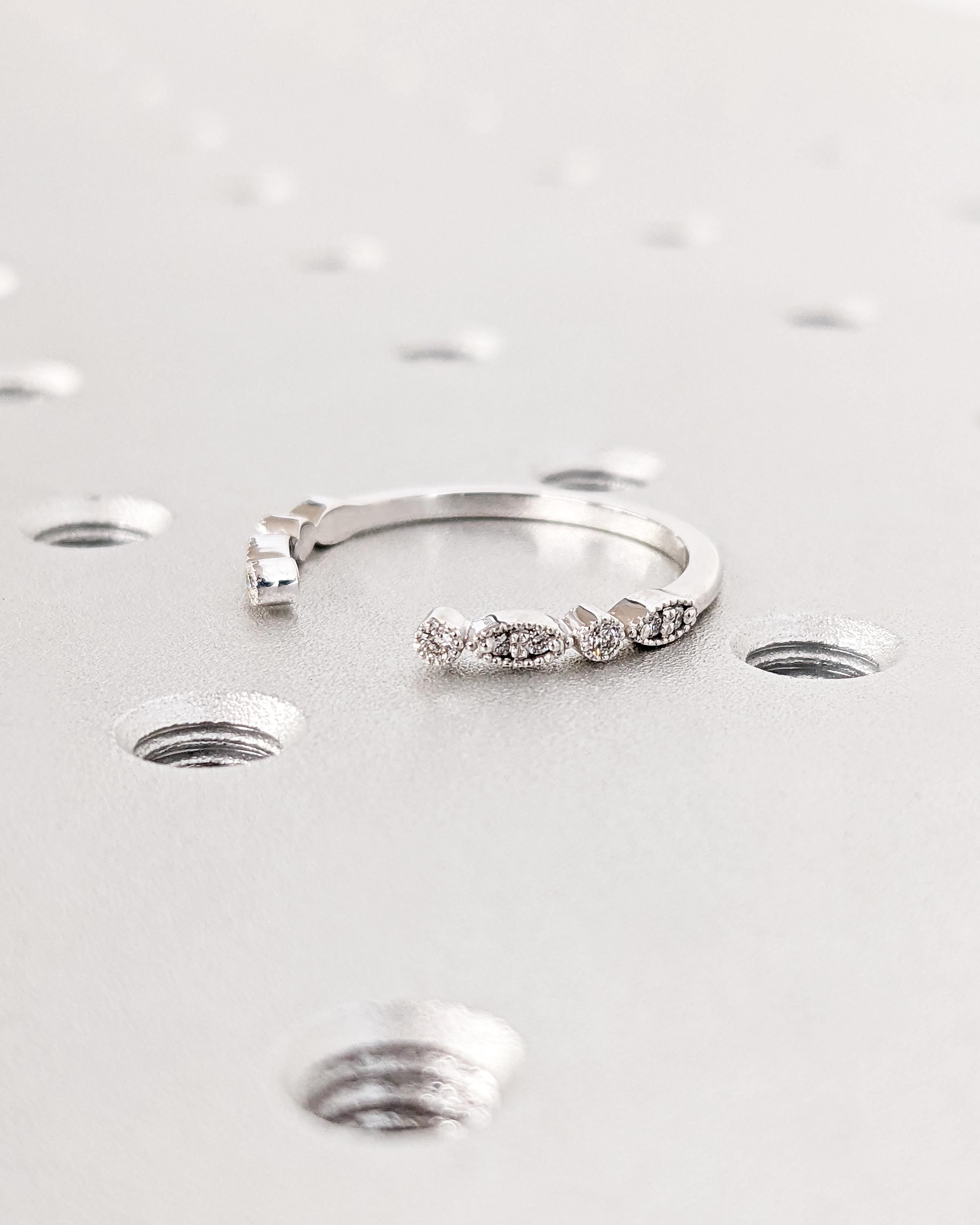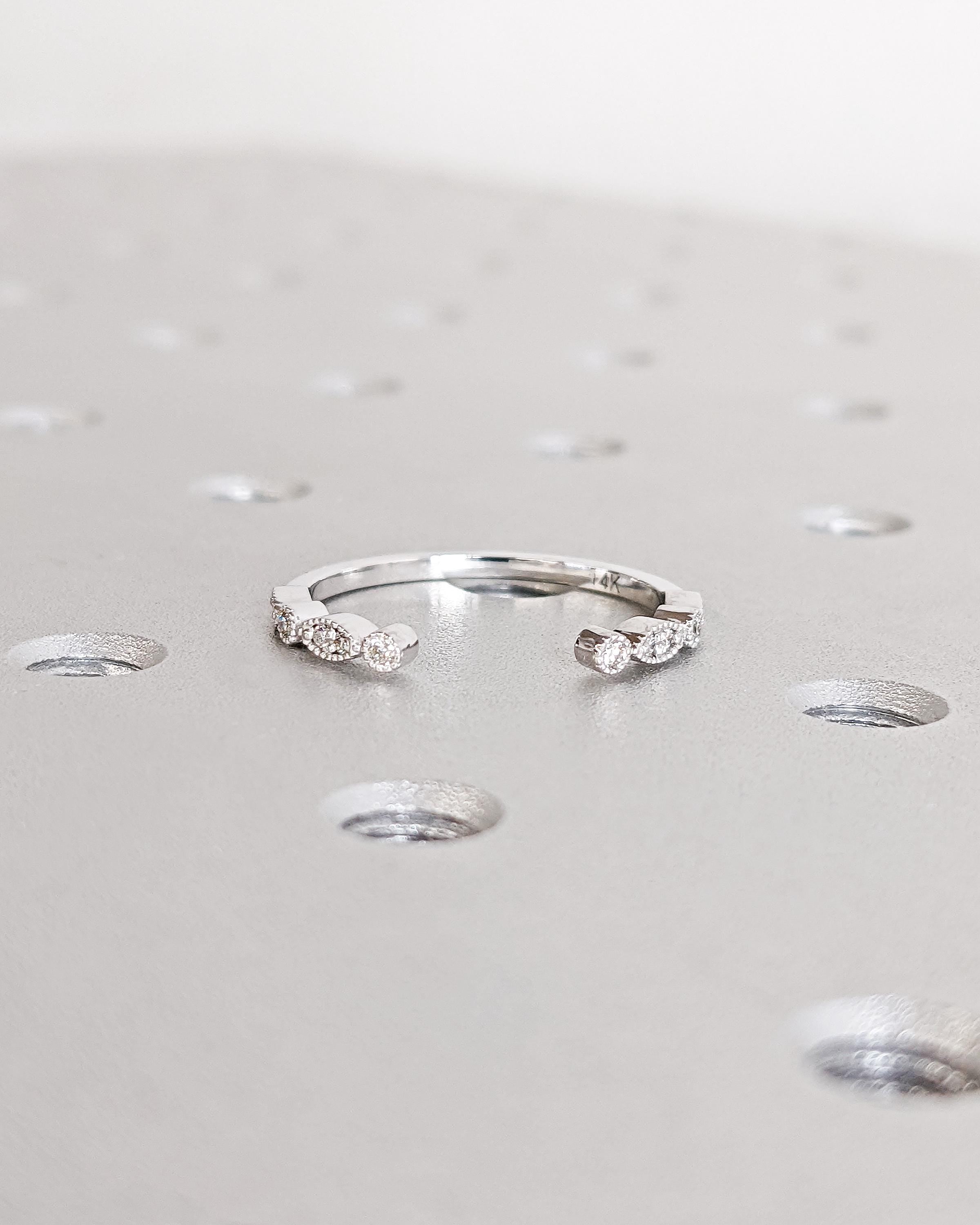 This beautifully detailed, art deco-inspired wedding band combines vintage charm with a modern feel. Its open band style is perfect for stacking with engagement rings or wearing on its own, while its slim 1.4mm width adds a dainty yet durable touch. Alternating marquise and round silhouettes are bordered with milgrain and set with small round stones, forming a graceful half eternity design. Choose between natural diamond, lab diamond or moissanite for your sparkle.