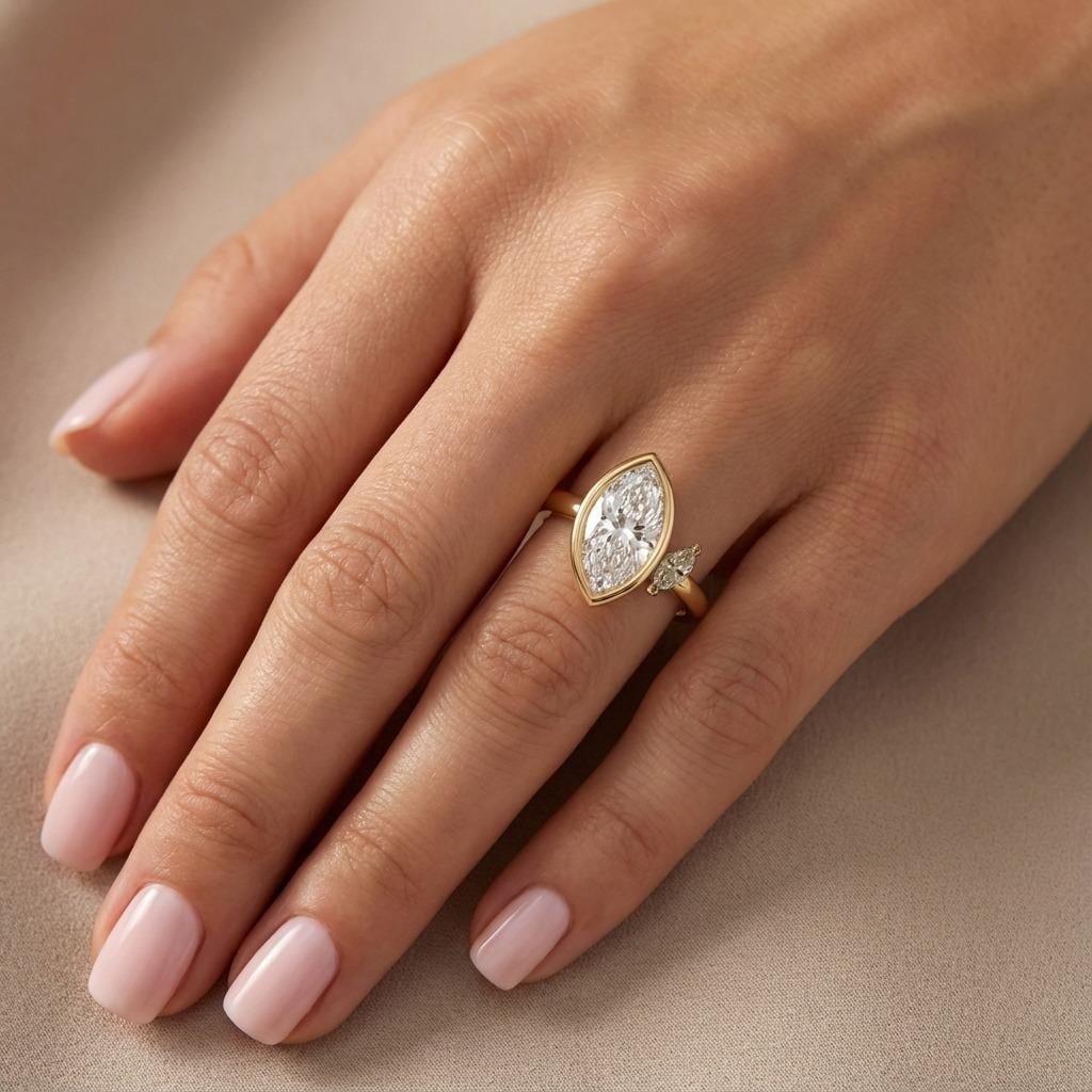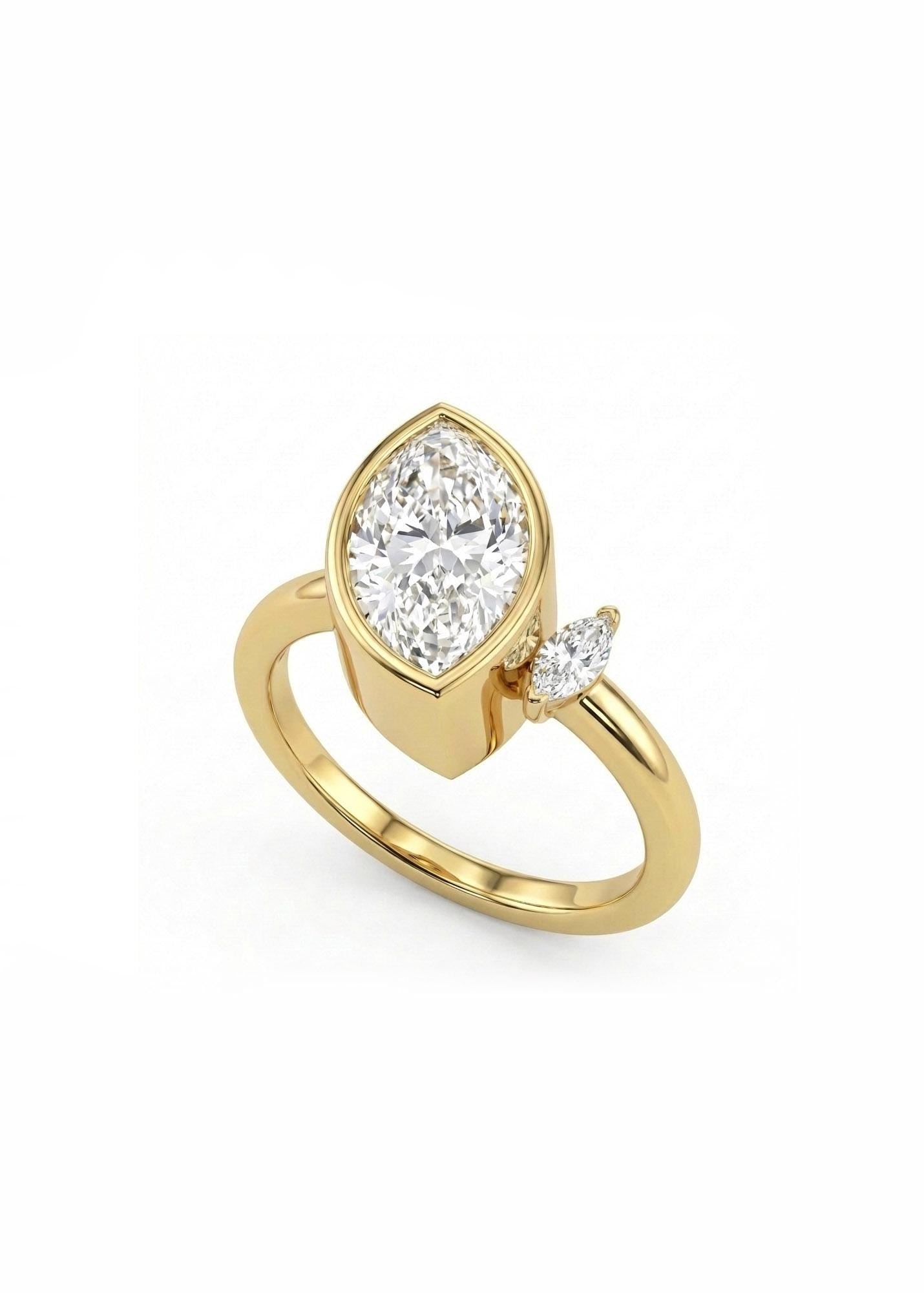 This distinctive ring pairs contrast and harmony through two striking gemstones. A bezel-set marquise cut Moissanite anchors the design with a sleek, modern profile, accented by a prong-set marquise cut side stones for an extra sparkle. The combination of settings highlights each stone’s unique character—clean and contemporary on one side, luminous and classic on the other.