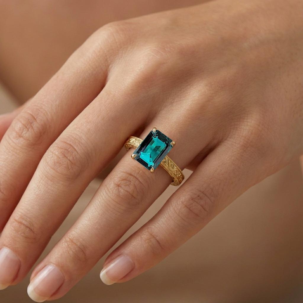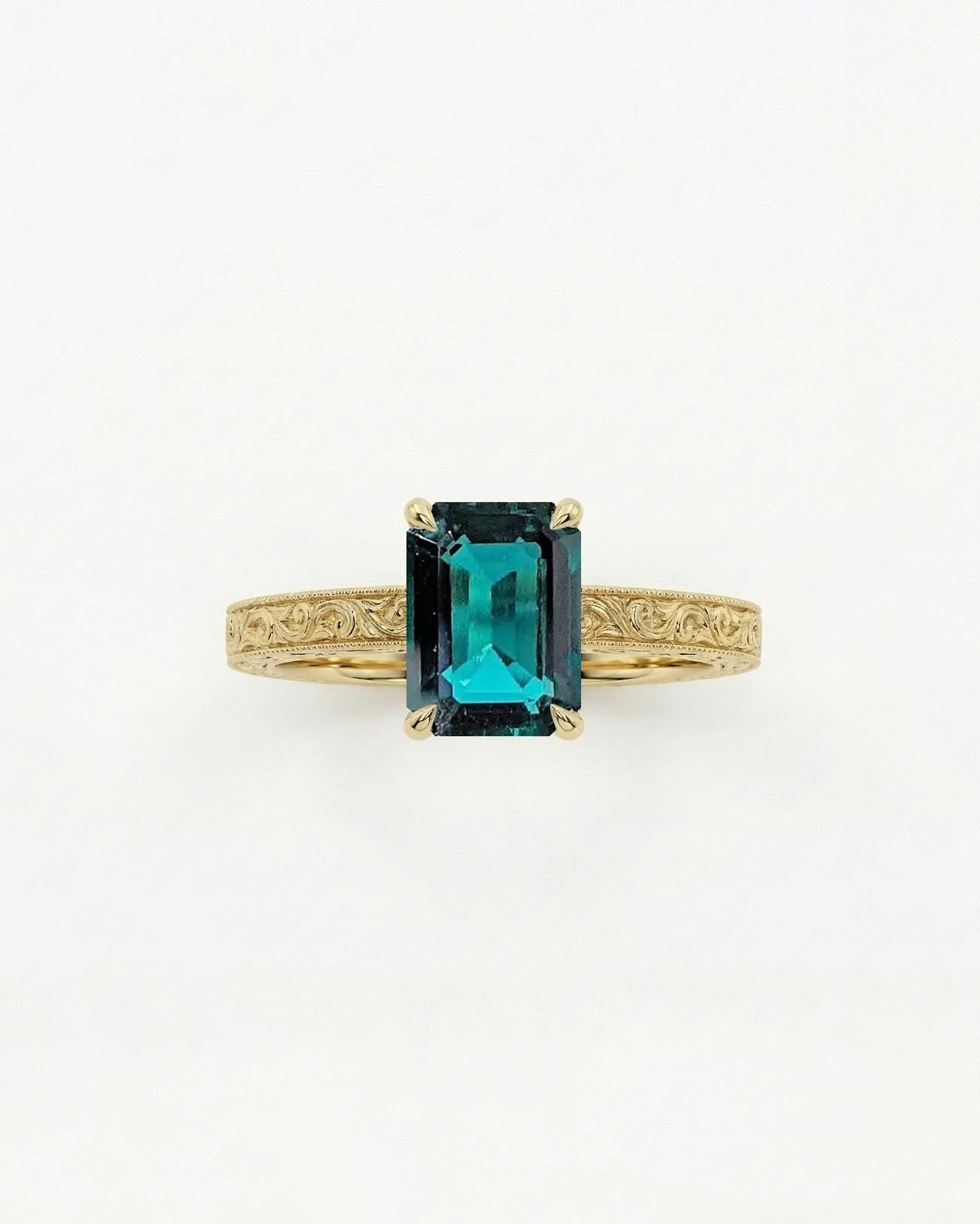 Make a statement of timeless elegance with our antique-inspired art deco ring, featuring an emerald cut Lab Emerald set in a secure basket setting. The intricate hand engraved details of undulating filigree waves on the gallery rail and milgrain edge square-shaped band adds a vintage touch, making this ring a stunning choice for any occasion.