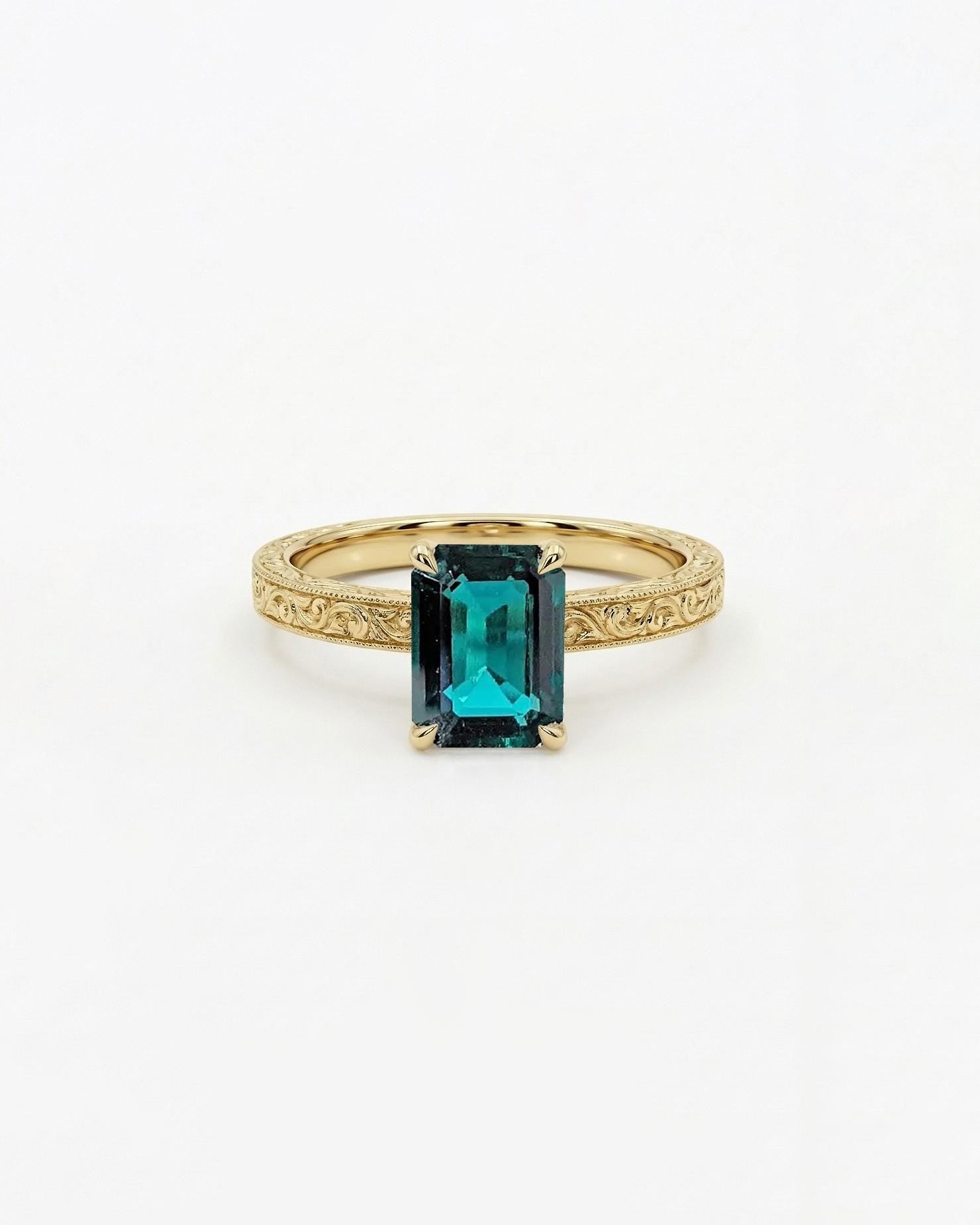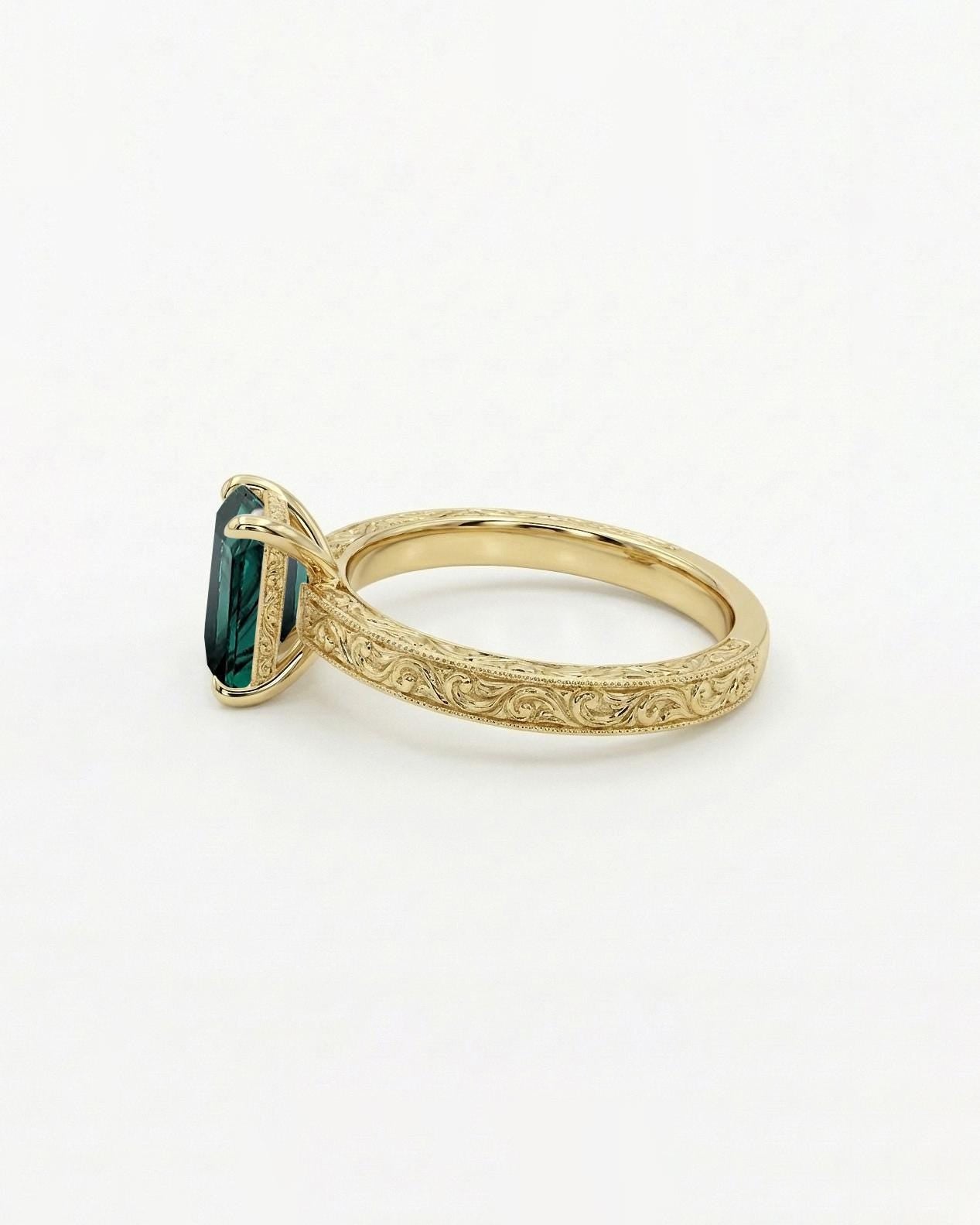 Art Deco Emerald Engagement Ring | 14k/18k Solid Gold Emerald cut Solitaire Ring | Filigree Wedding Band for Women | Talon Prong Setting