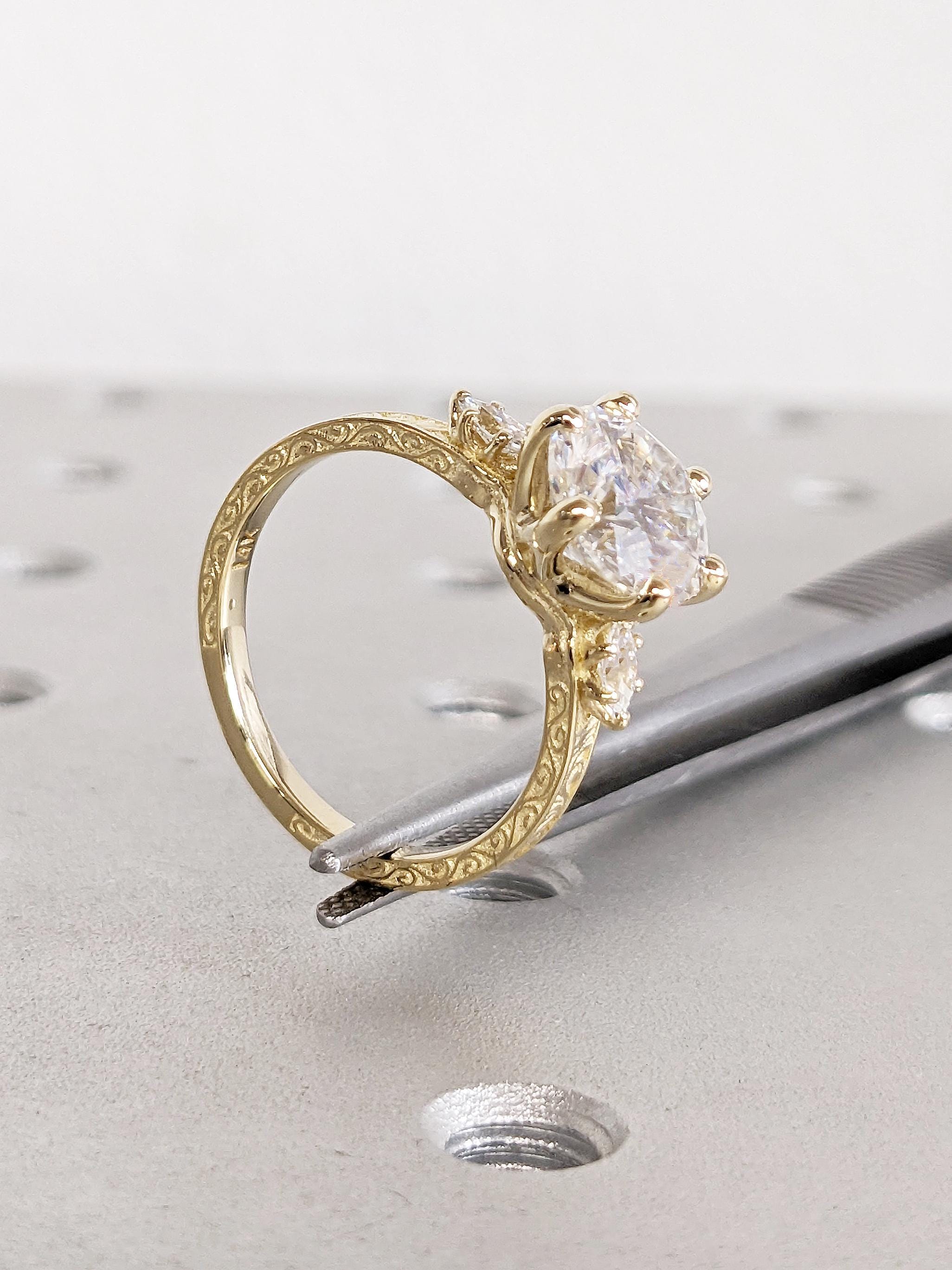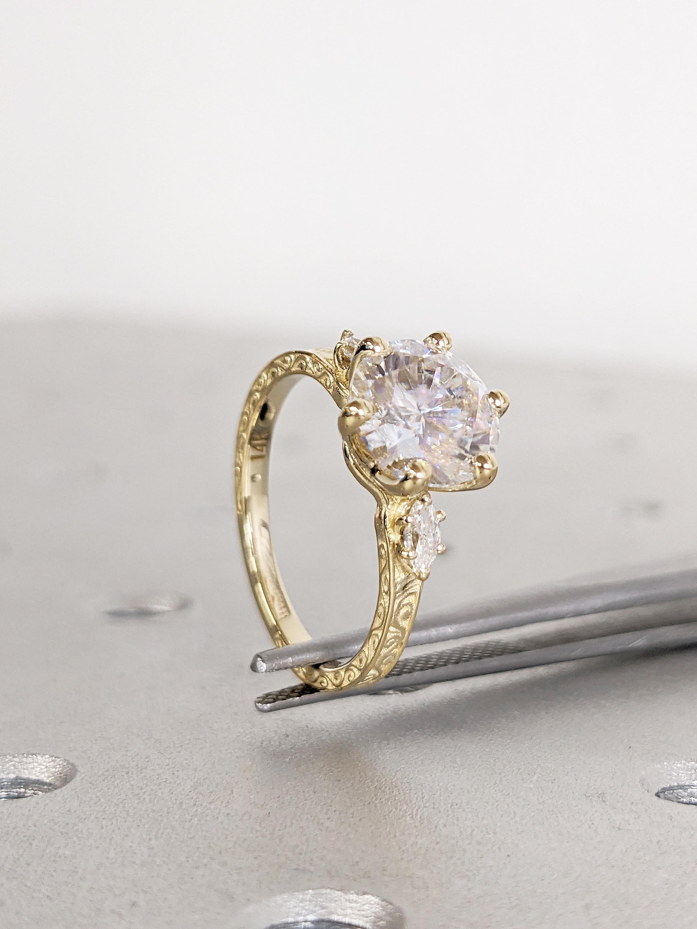Art Deco Lab Grown Diamond Ring, Filigree 14k Yellow Gold Wedding Ring, Round Marquise Cut Diamond Ring, Proposal Ring, Bridal Gift for Her