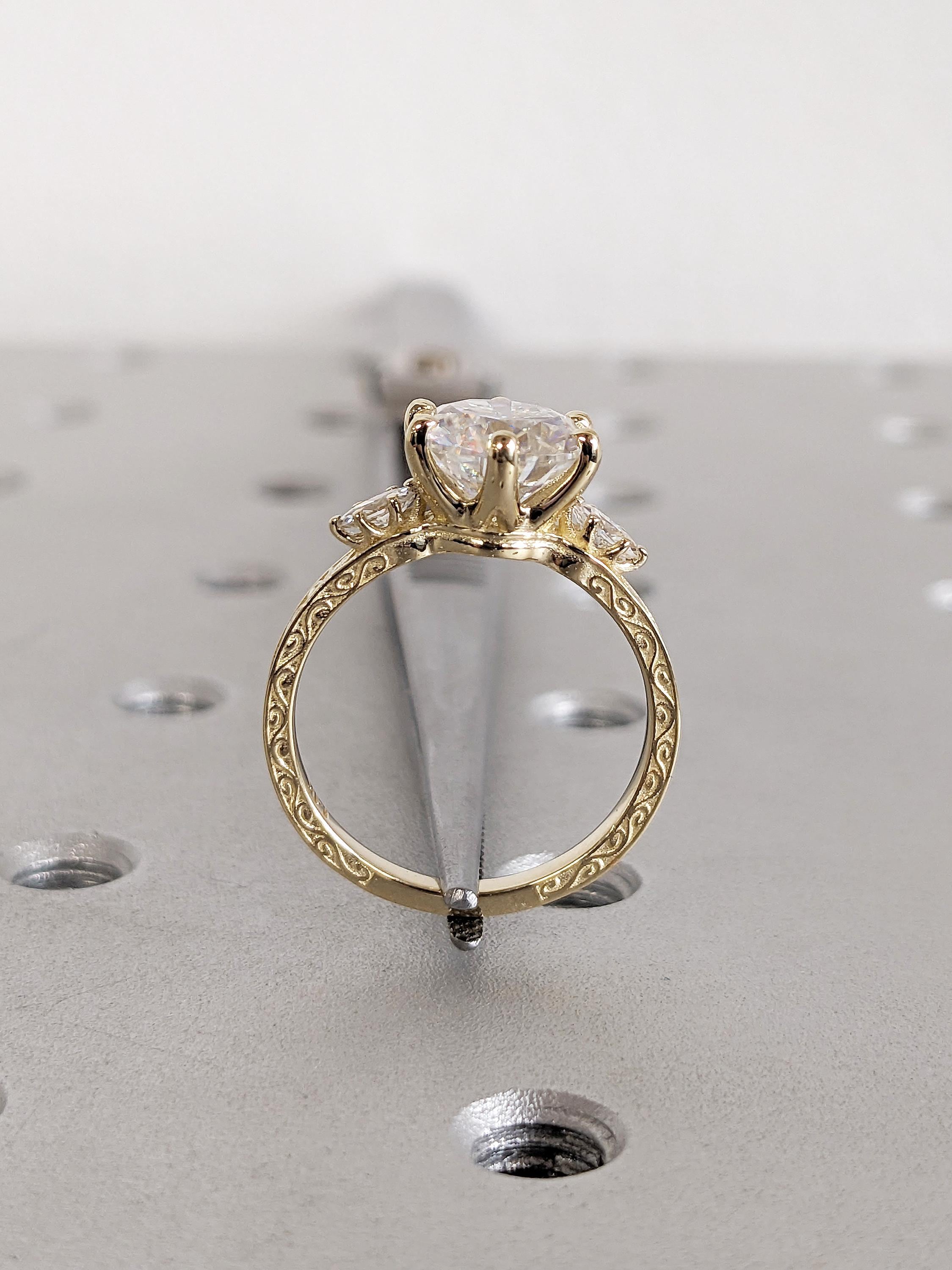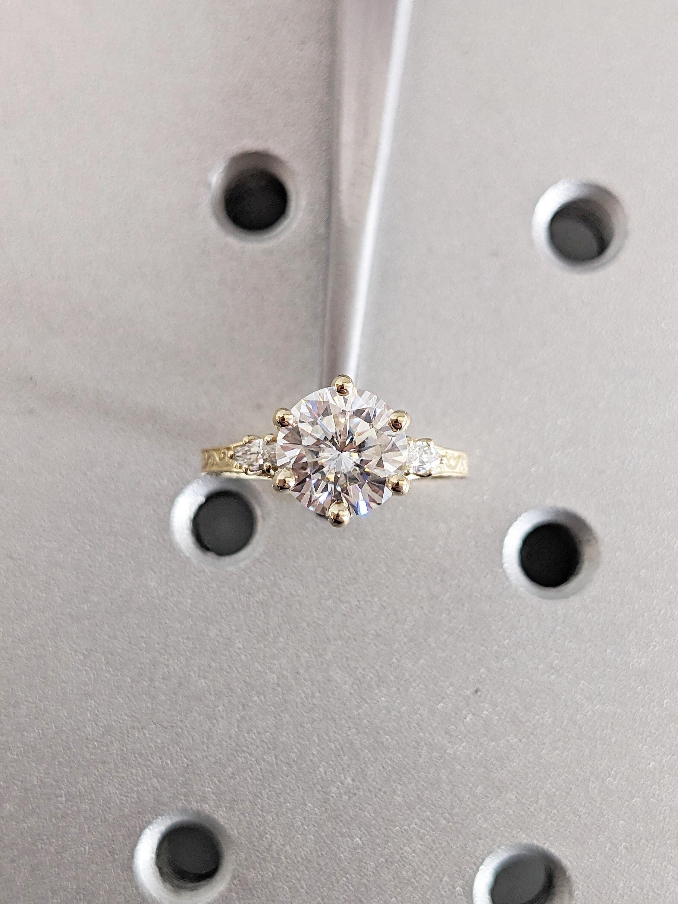 Presenting a stunning masterpiece: our vintage-inspired round-cut Lab Grown Diamond engagement ring in a prong setting. Customize it with your choice of marquise cut Natural Diamonds, Lab Grown Diamonds, or Moissanite side stones. Featuring exquisite undulating wave filigree, this remarkable piece offers a unique touch of elegance that endures through time.