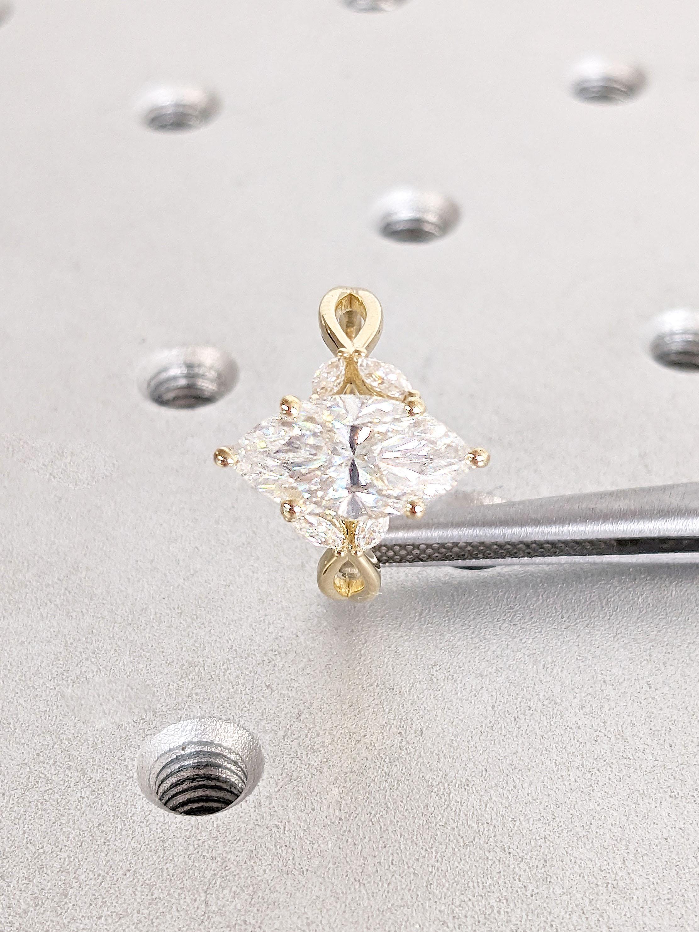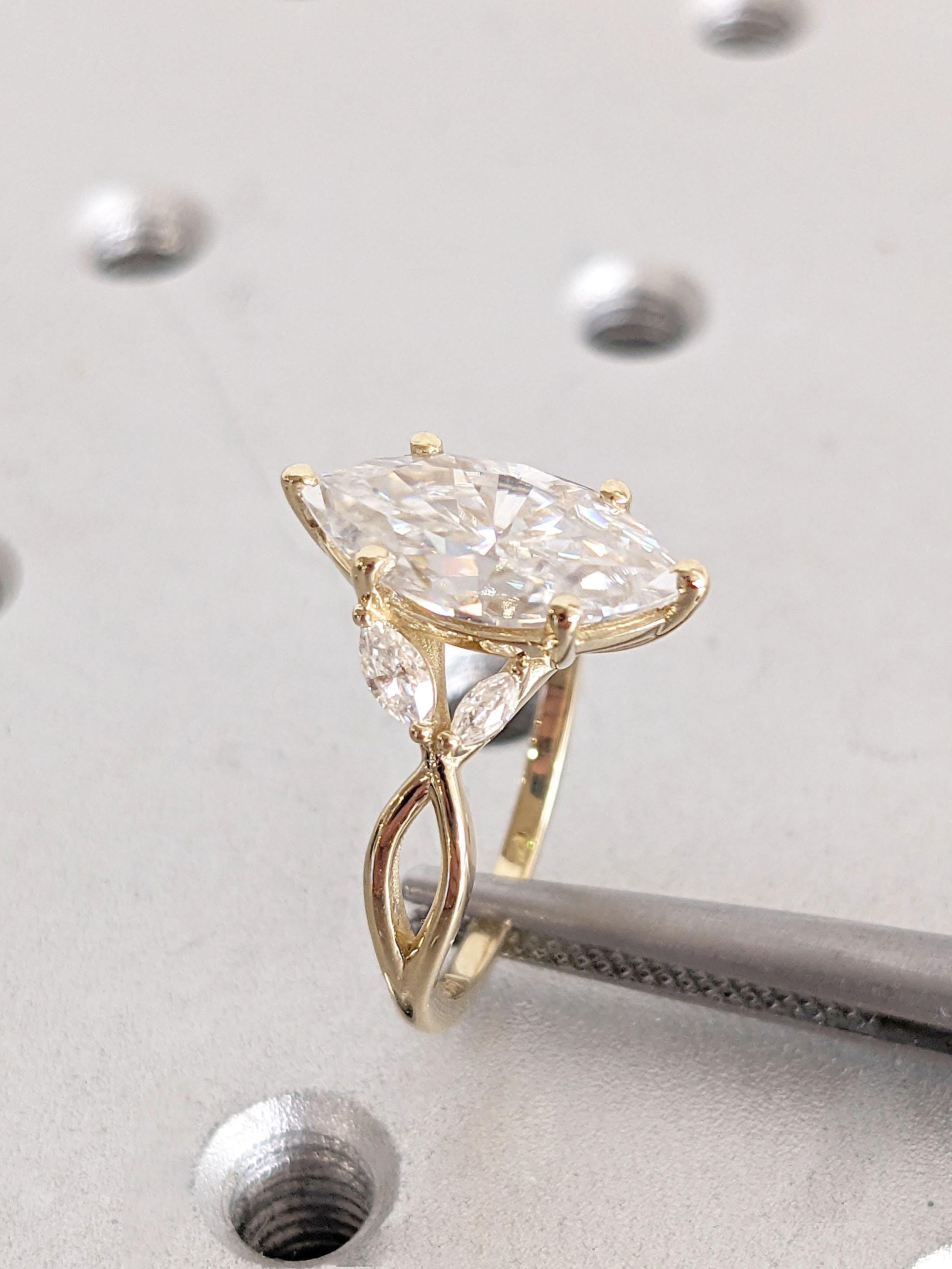 A nature inspired five stone ring, features marquise cut Moissanite main stone atop a beautiful trellis setting, accented by marquise cut side stones delicately arranged resembling leaves on an intertwining twig like band. An elegant blend between modern aesthetic with a rustic flair. This handmade ring is the perfect jewelry for engagement, weddings or simply a gift for that special woman in your life.