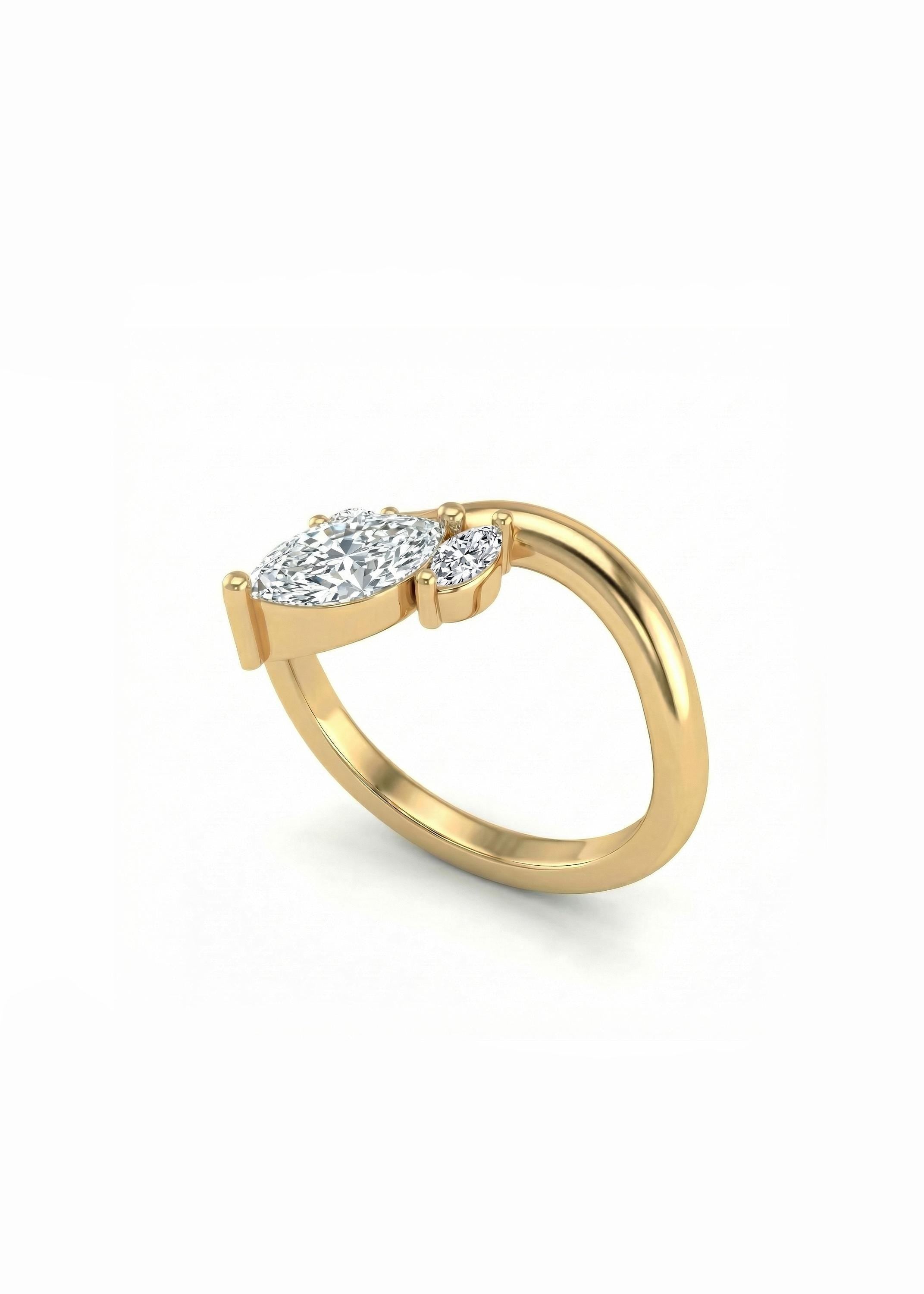 This graceful ring features a striking marquise cut Moissanite secured in a minimalist two-prong setting, allowing the center stone to appear light, open, and full of brilliance. Flanking the moissanite are thoughtfully placed round and marquise cut side stones, adding balance and subtle sparkle while enhancing the elongated silhouette of the center gem.