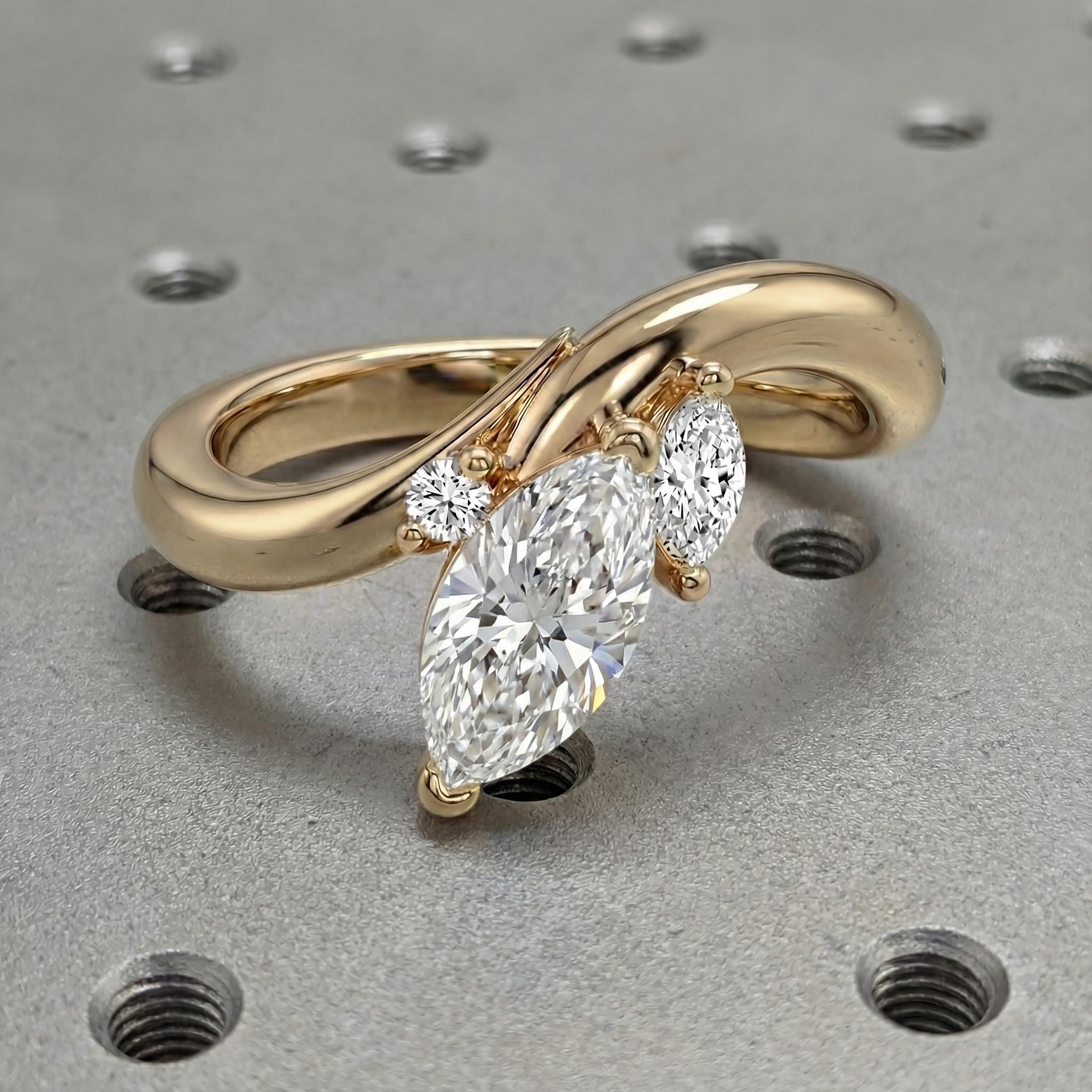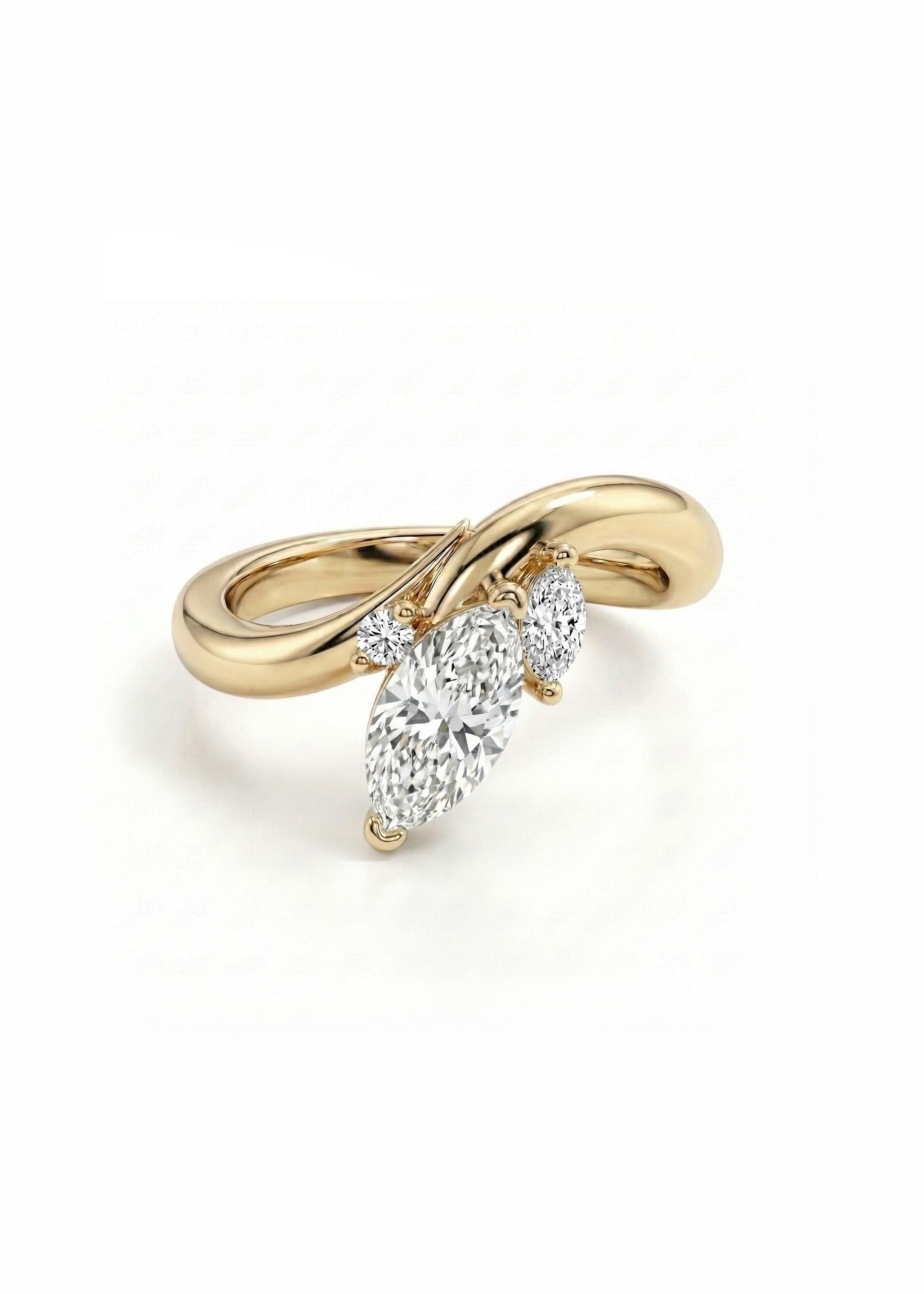 The band gently tapers on both sides in a soft, wavy contour, creating a sense of natural movement—almost like a flowing wave guiding the eye toward the center stone. This fluid design adds elegance and dimension, making the ring feel organic, dynamic, and effortlessly refined.