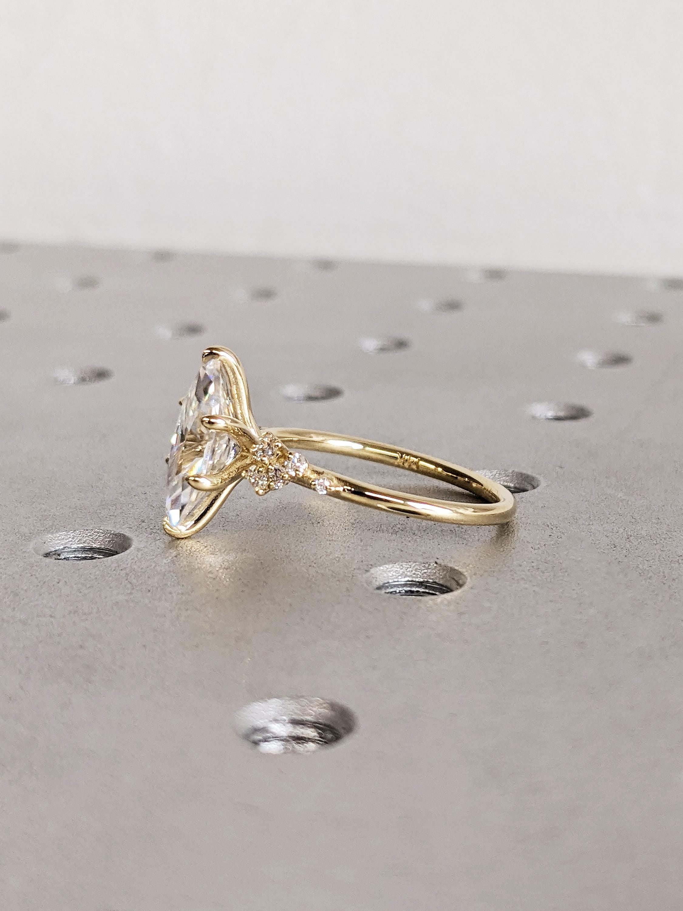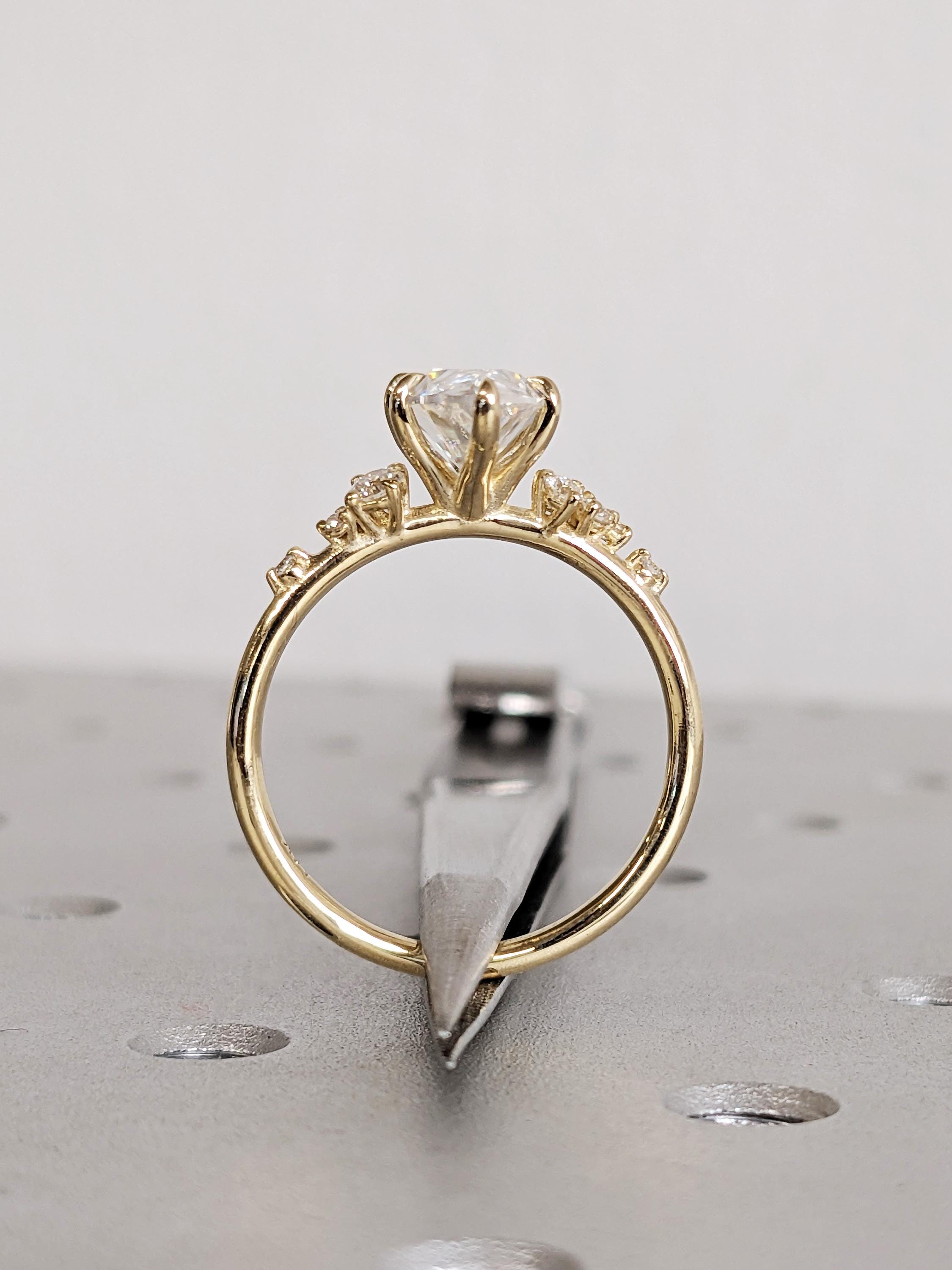 Celebrate the next chapter of your life with our elegantly designed engagement ring, showcasing a classic center stone and a delicate setting. Adorned by a cluster of exquisite Natural Diamond, Lab Diamond or Moissanite that glisten like freshly fallen snow, this meticulously handcrafted ring is the perfect symbol of your everlasting love.