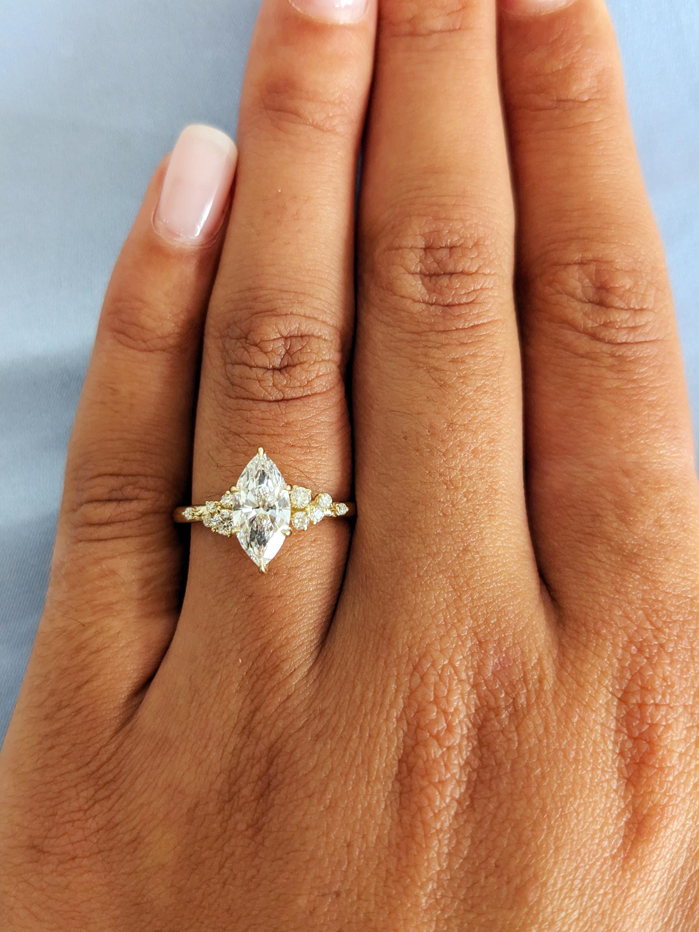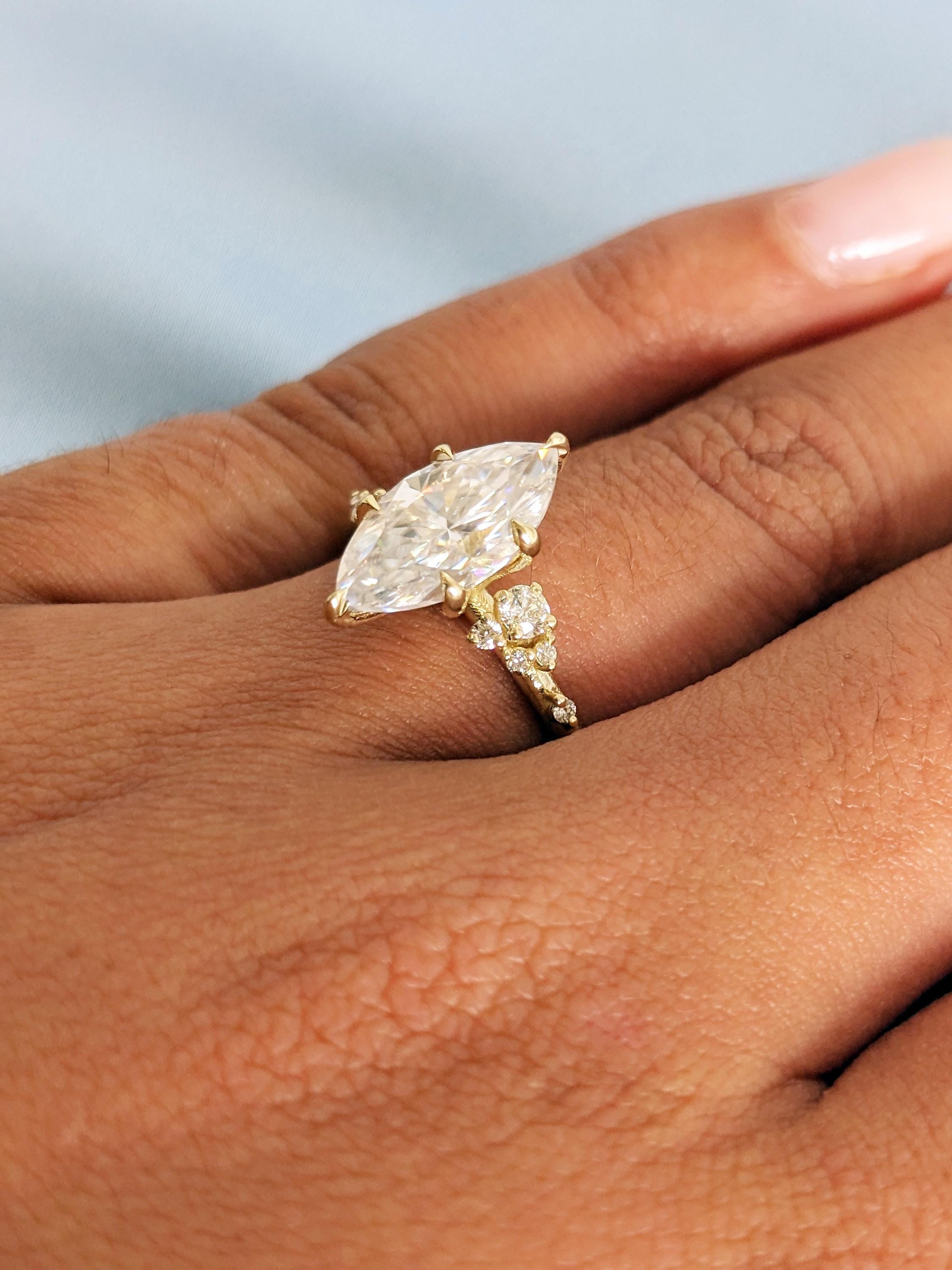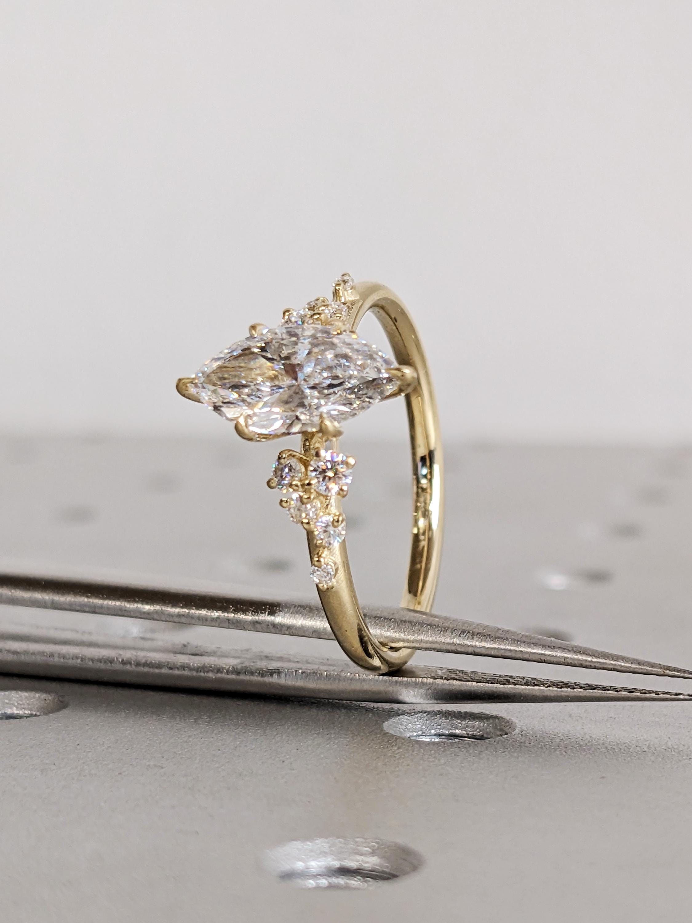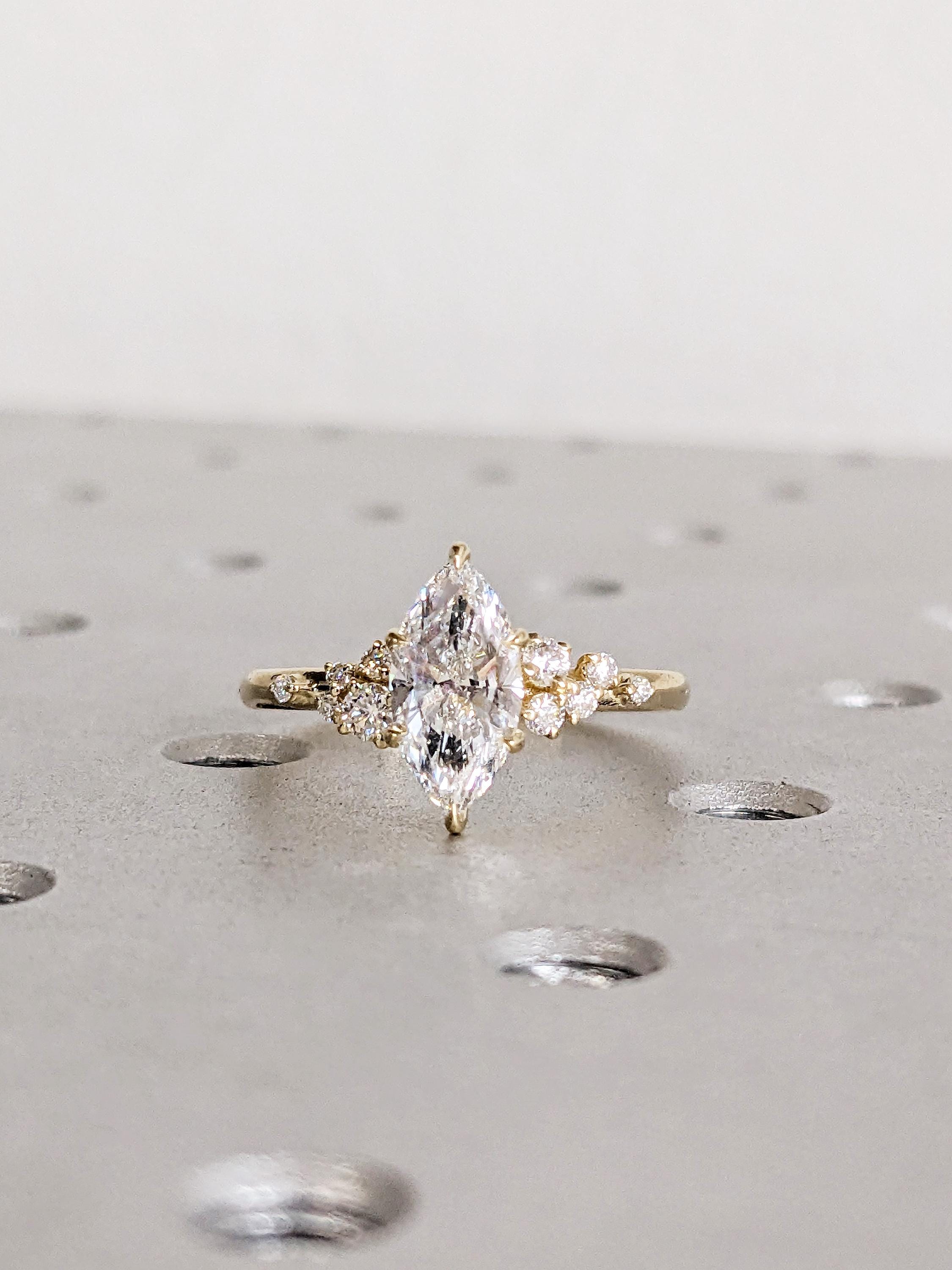 Art Deco Moissanite Marquise Cut Engagement Ring, 14K Gold Snowdrift Diamond Wedding Band, White Cluster Diamond, Proposal Ring For Her