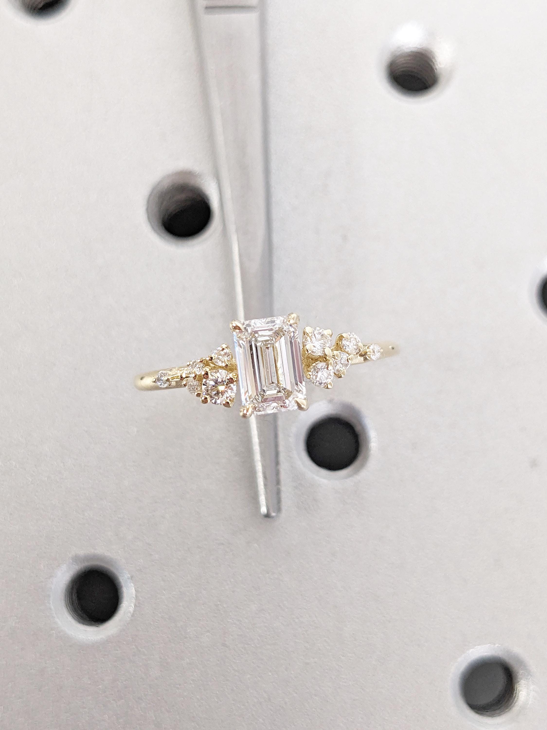 Begin the next chapter of your life with our elegantly crafted engagement ring, featuring a timeless Moissanite center stone in a delicate setting. Surrounded by a stunning snowdrift cluster of Natural Diamonds or Moissanites that shimmer like freshly fallen snow, this meticulously handcrafted piece serves as the perfect symbol of your enduring love.