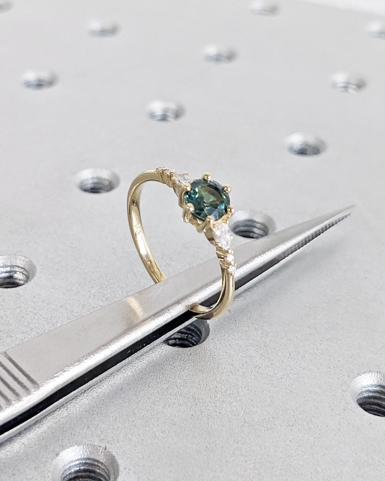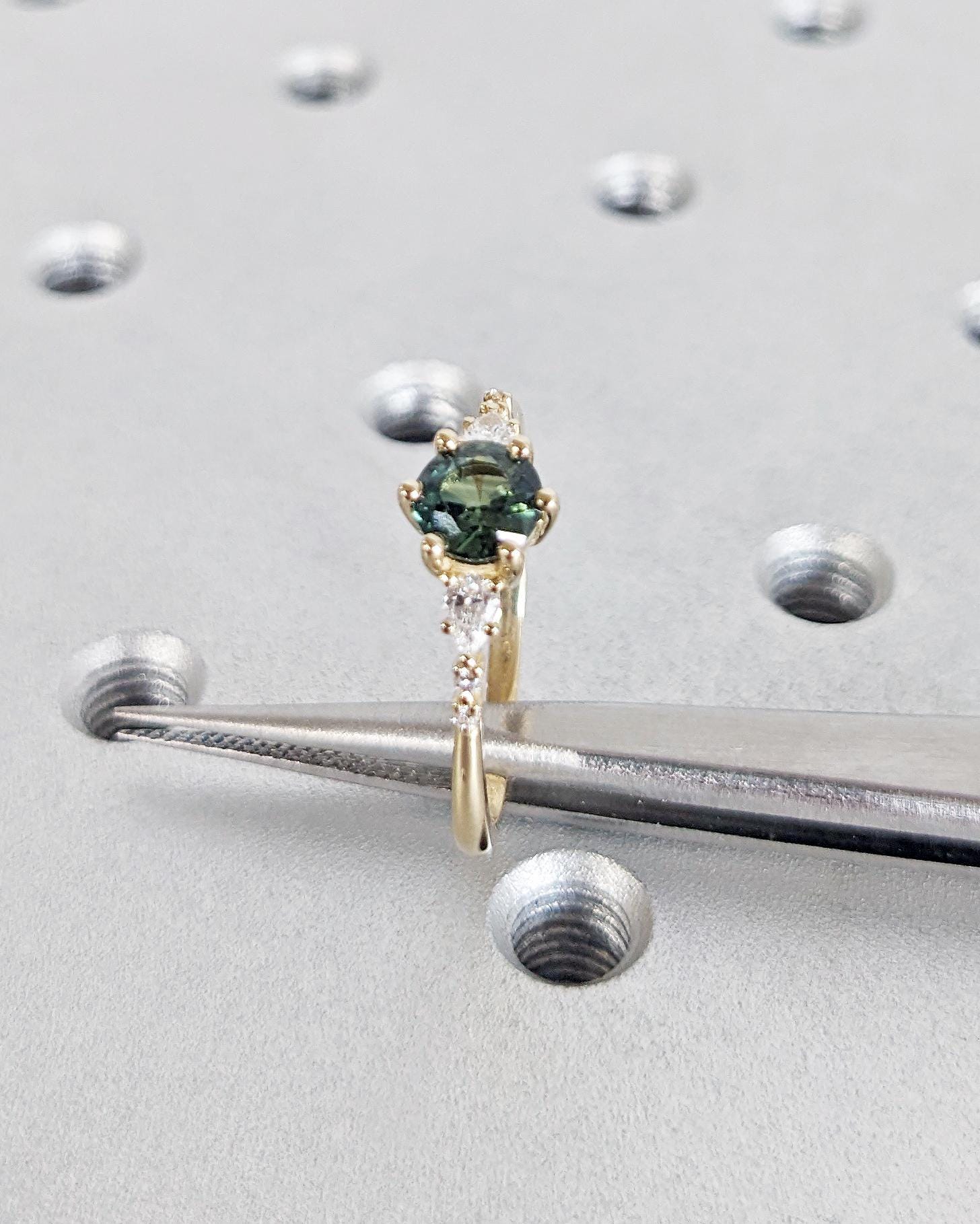 Delicate and elegant, this prong set statement ring features a round cut Sapphire center, adorned with your choice of natural diamonds, lab grown diamonds or moissanites in pear and round cut, on a thin tapered band of 1.6mm width. With its gorgeous hue of blue/green shade center gemstone, this minimalist yet luxurious ring is a heirloom worthy jewelry to cherish.