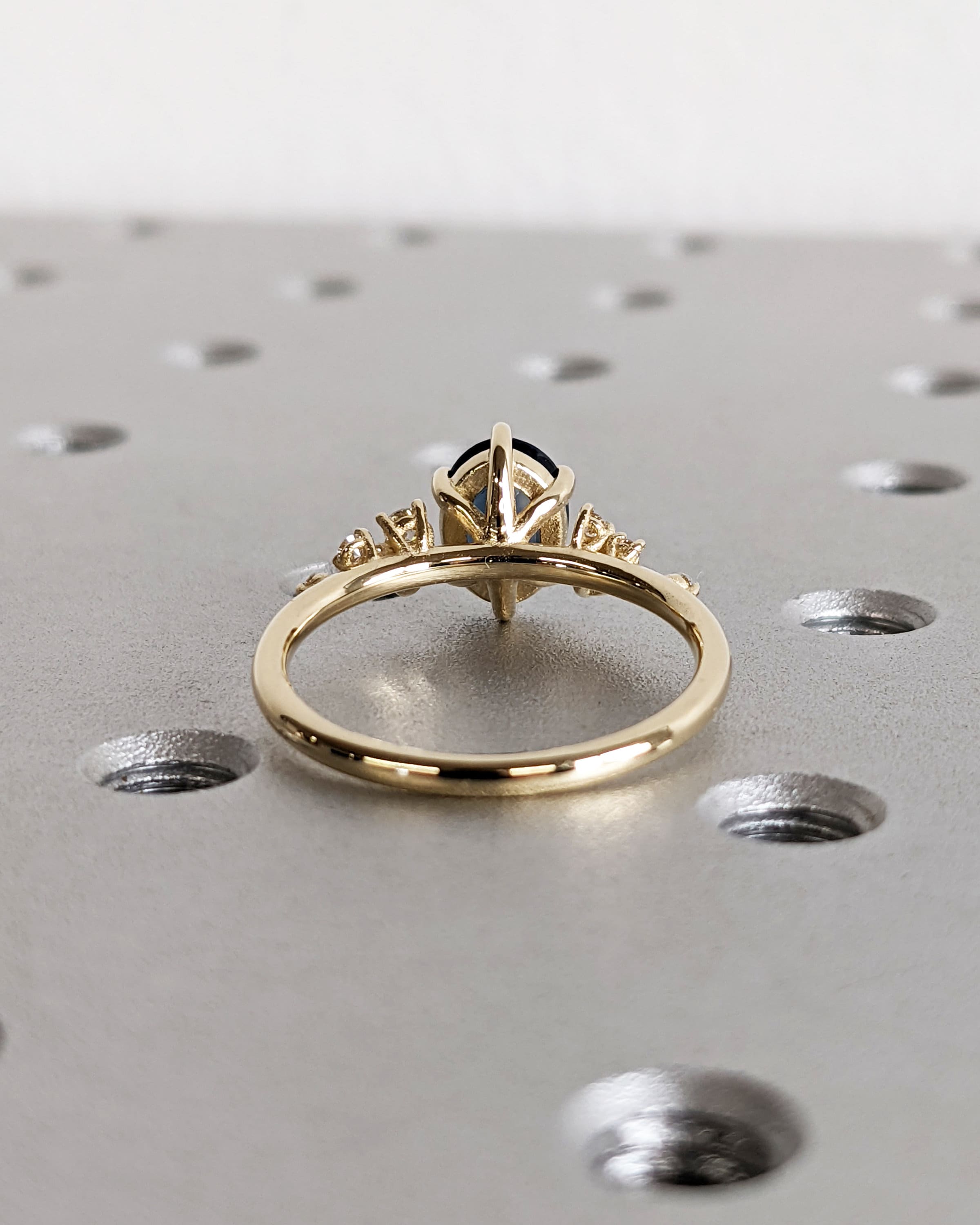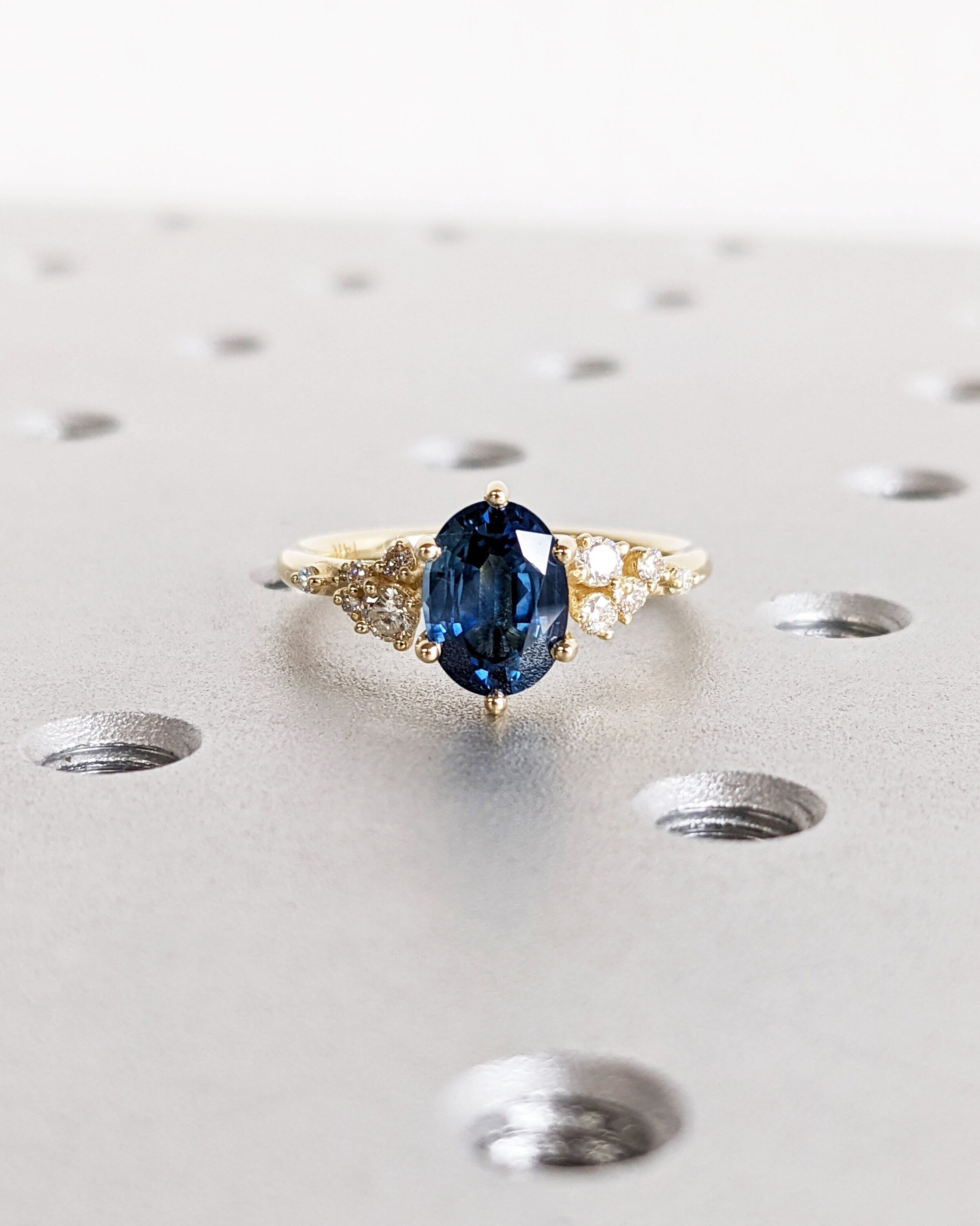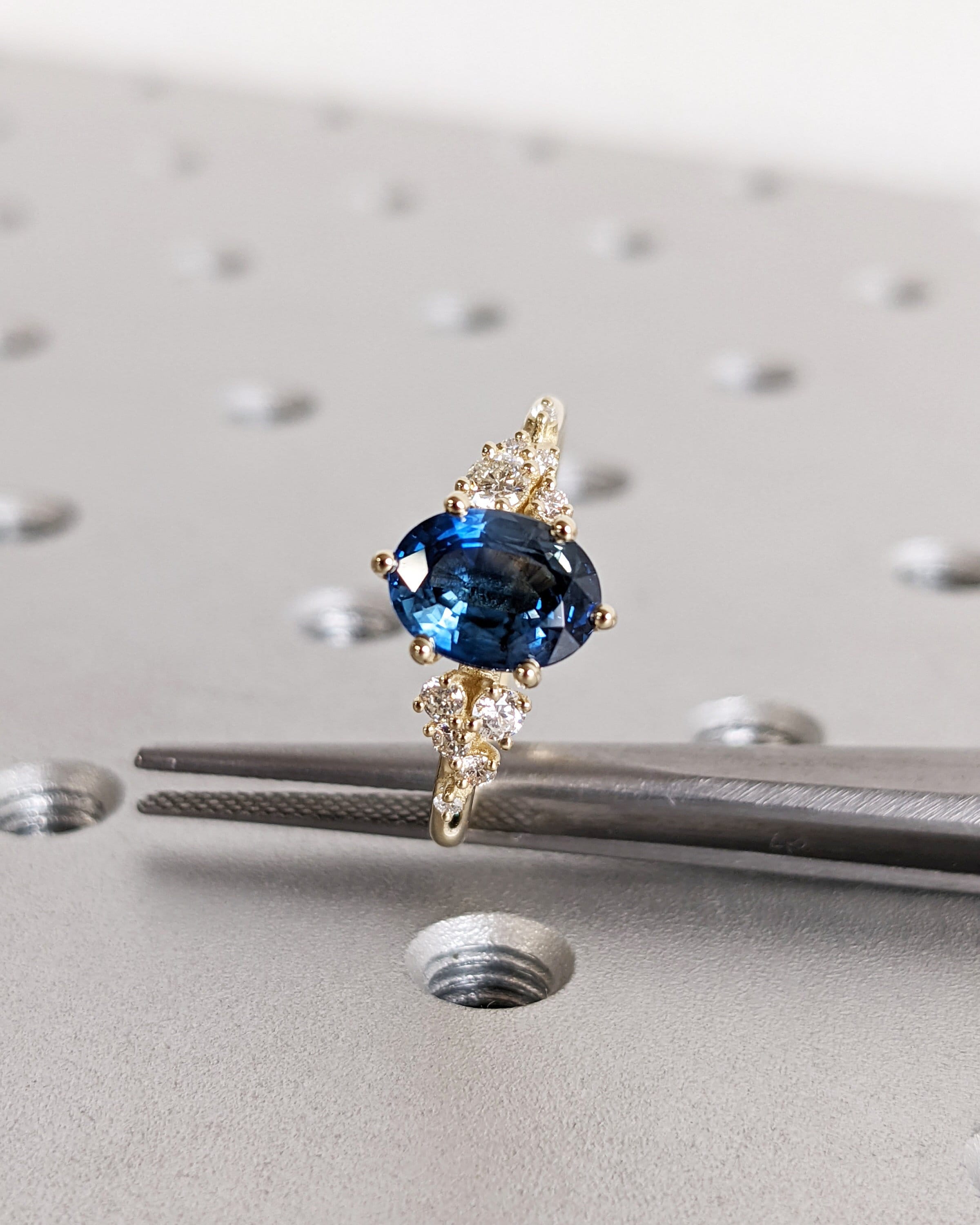 Embrace luxury and style with our oval sapphire ring, featuring enchanting deep blue tones that captivate the beholder. Nestled in a delicate six-prong setting, the ring is adorned with a unique snowdrift cluster, glistening with moissanites or diamonds, mirroring the elegance of freshly fallen snow.