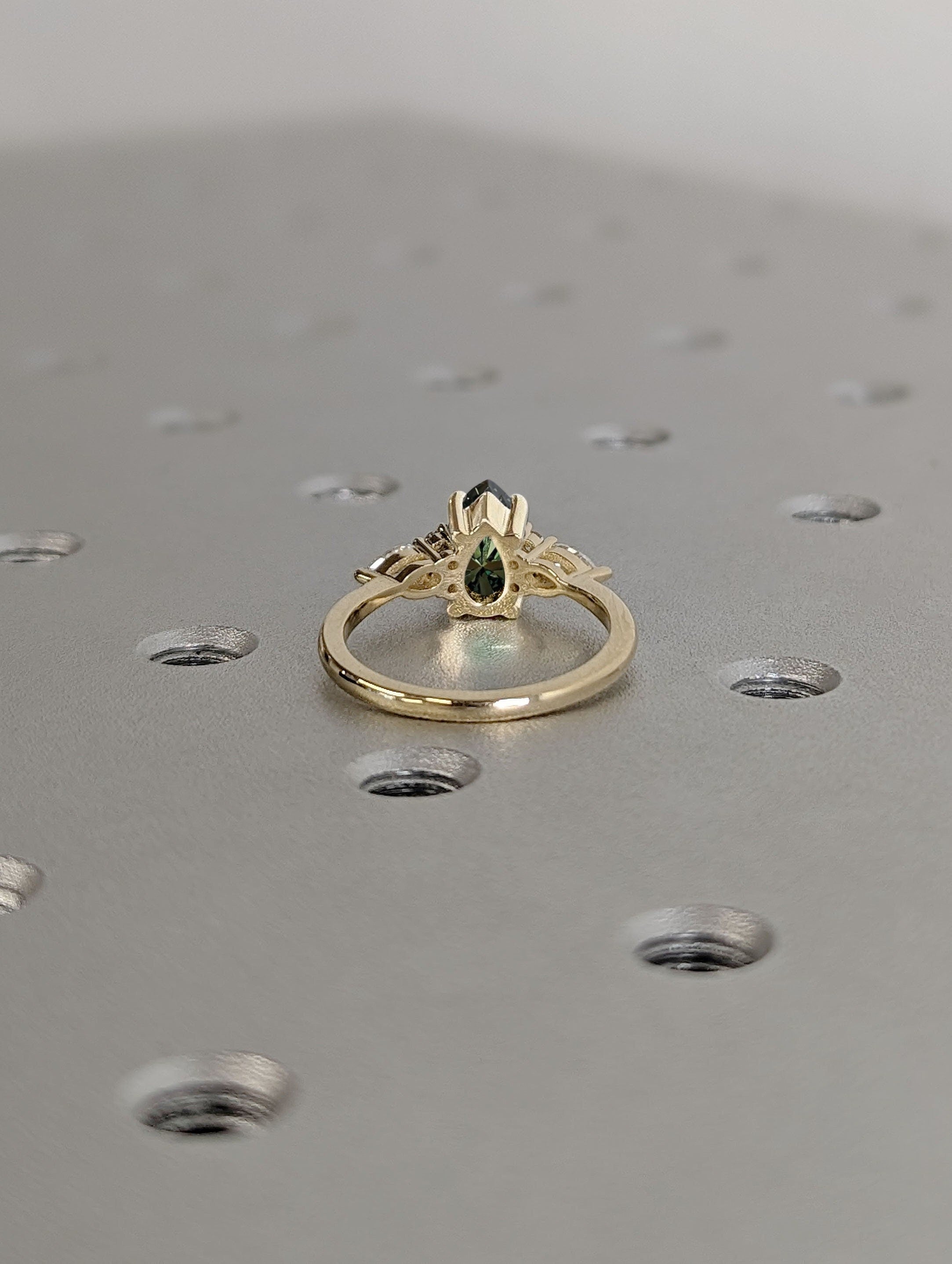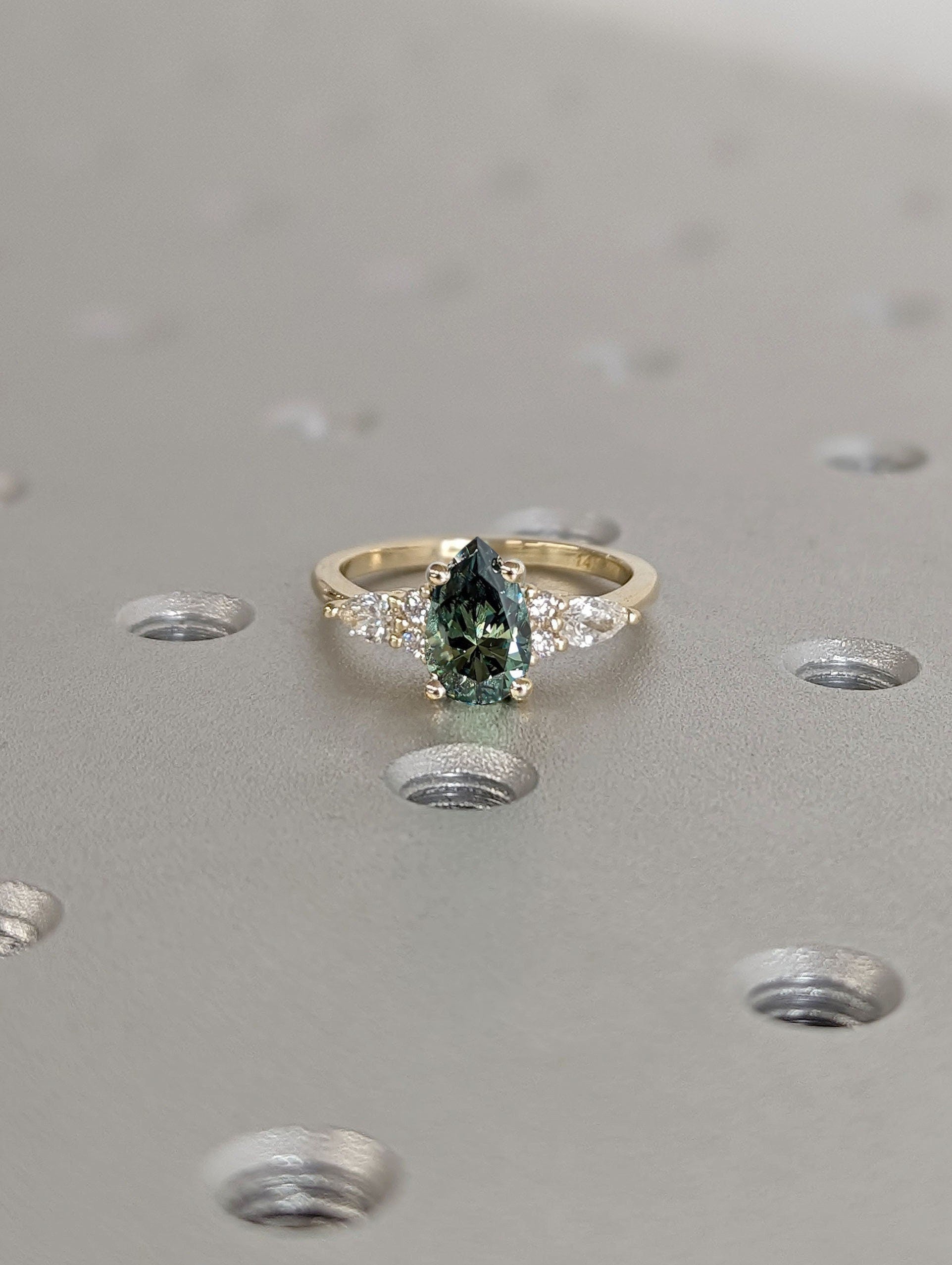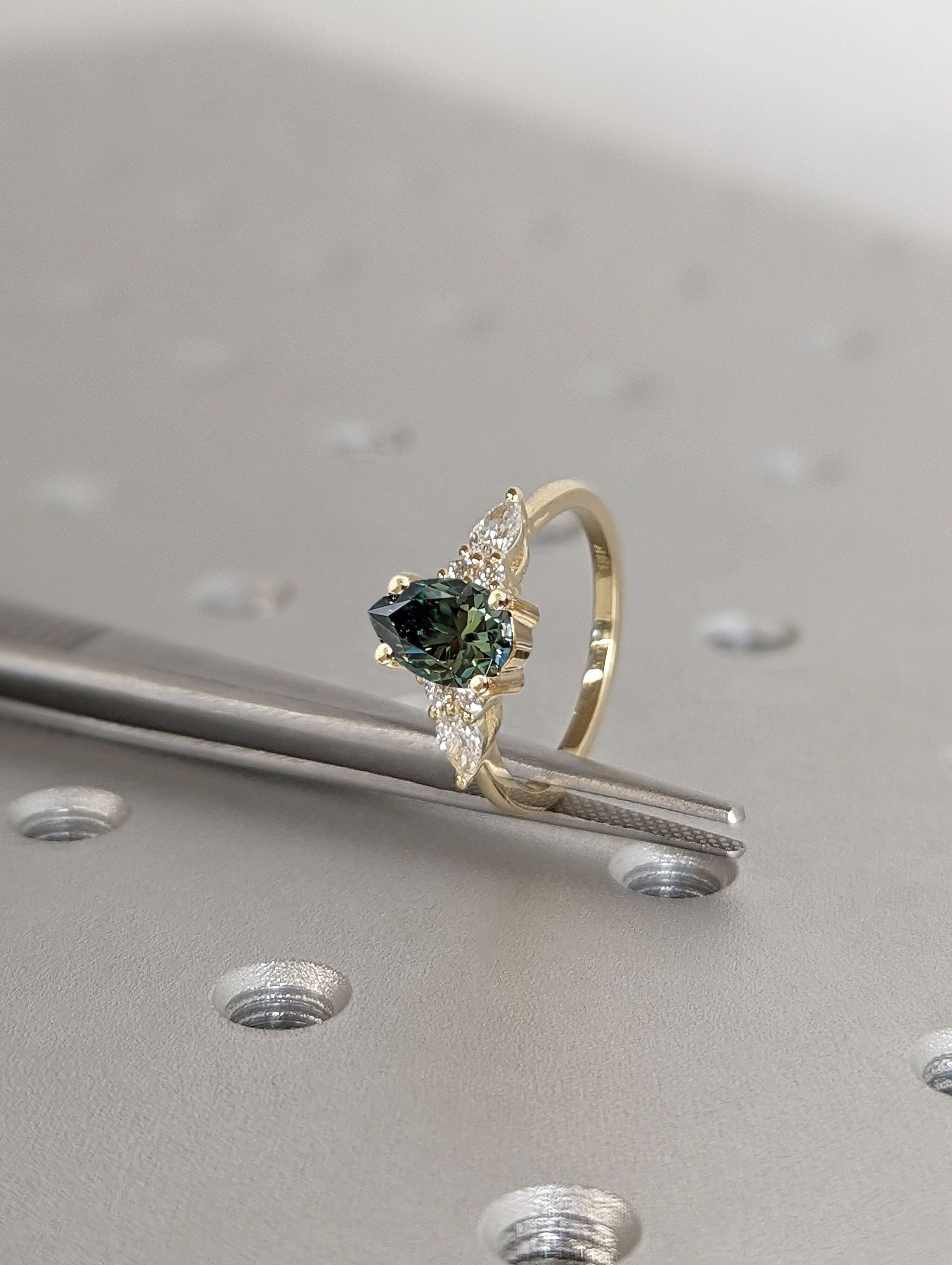 This ornate, vintage-inspired art deco ring features a prong center setting with pear cut Moissanite, highlighted by prong set moissanites OR diamond on a delicate gold band. With its calming green hue that represent prosperity, growth and tranquility, this handcrafted statement piece jewelry makes a great gift for any occasion.