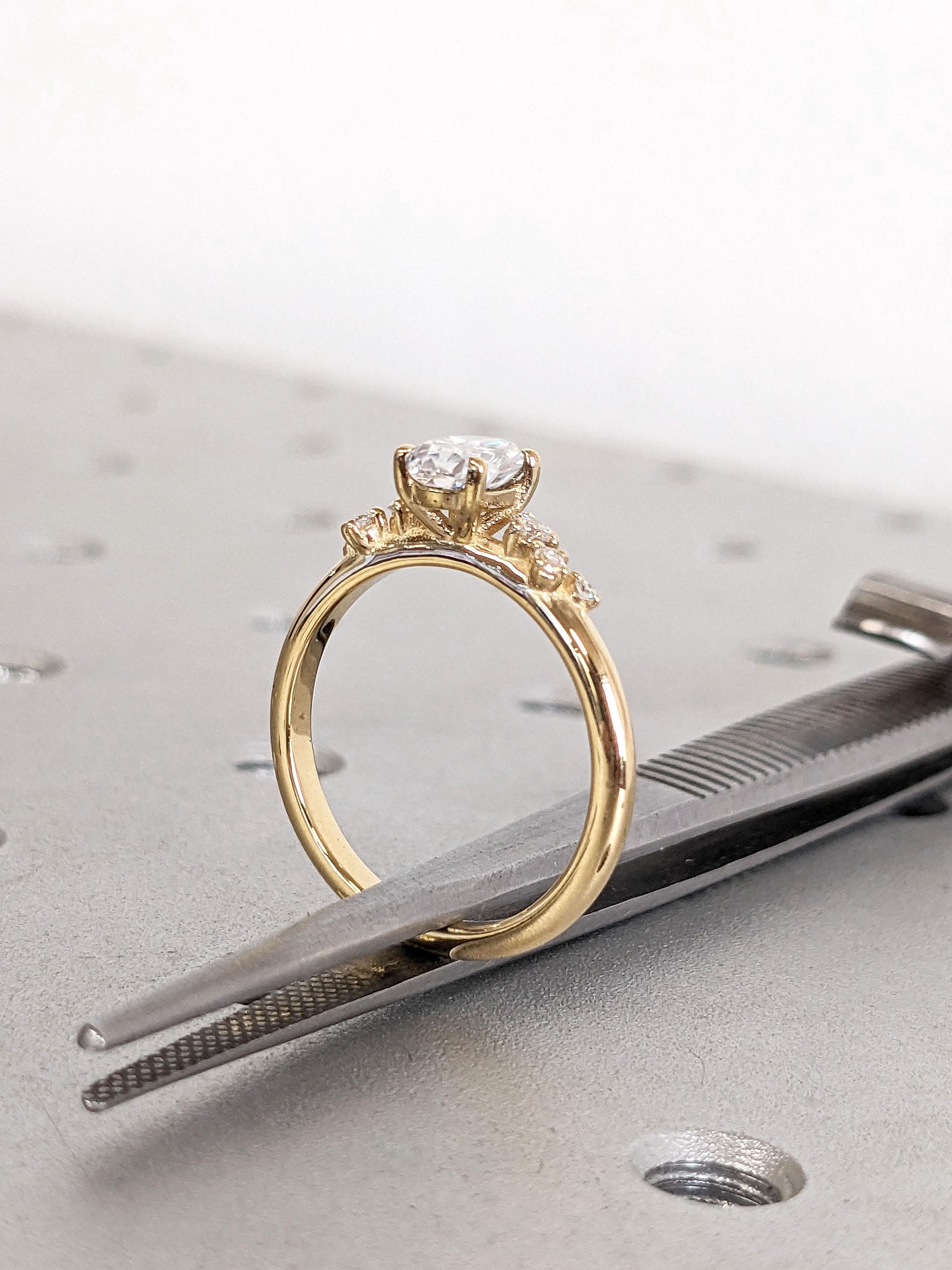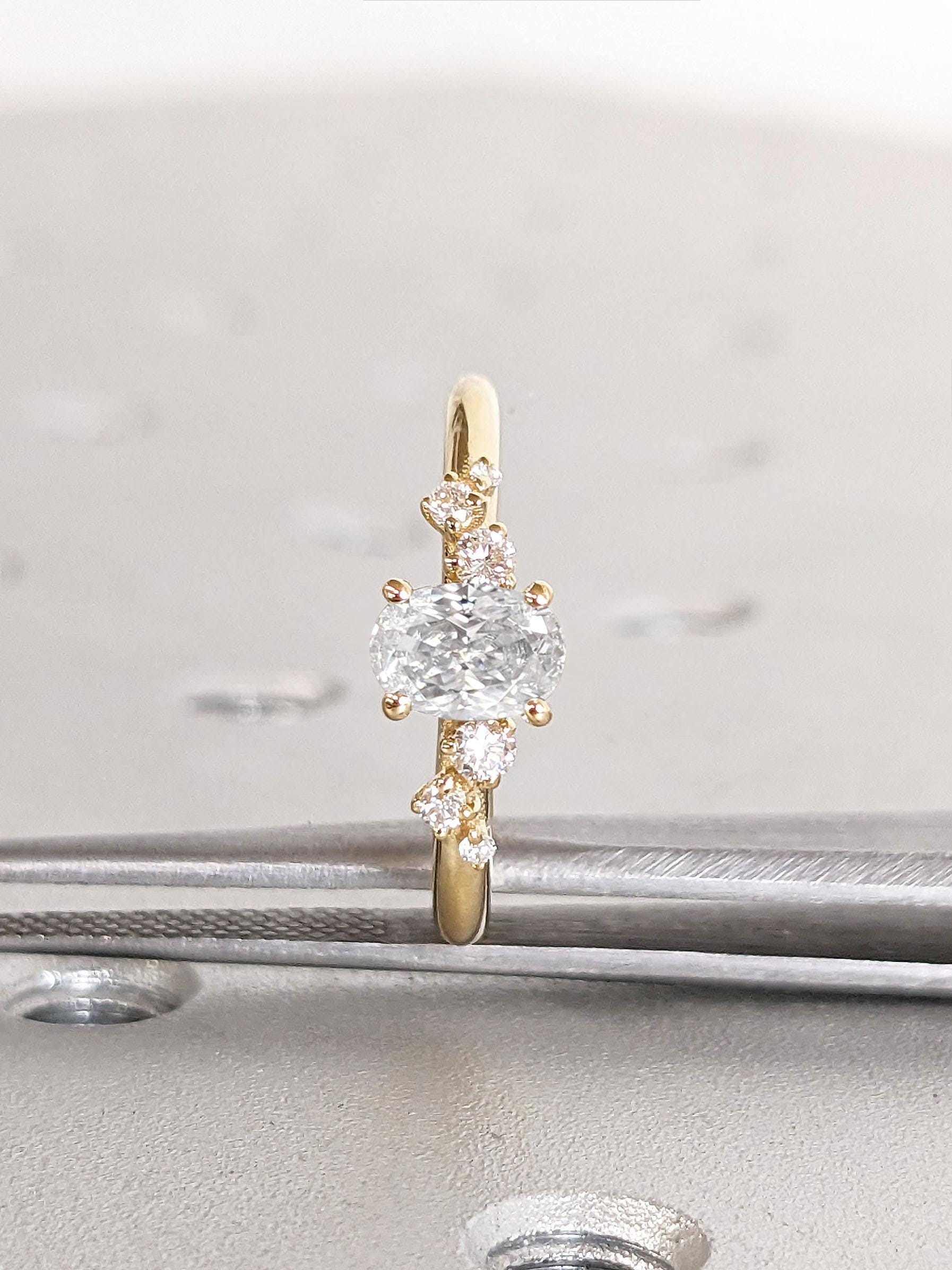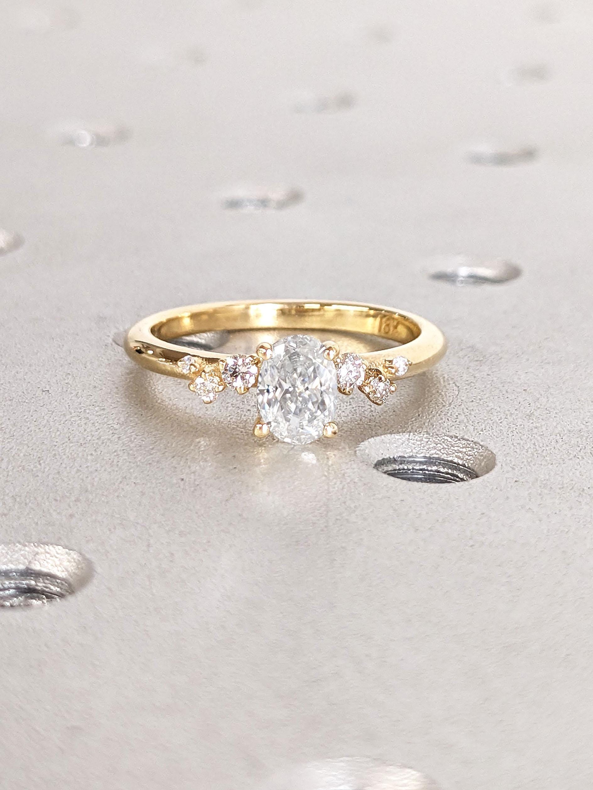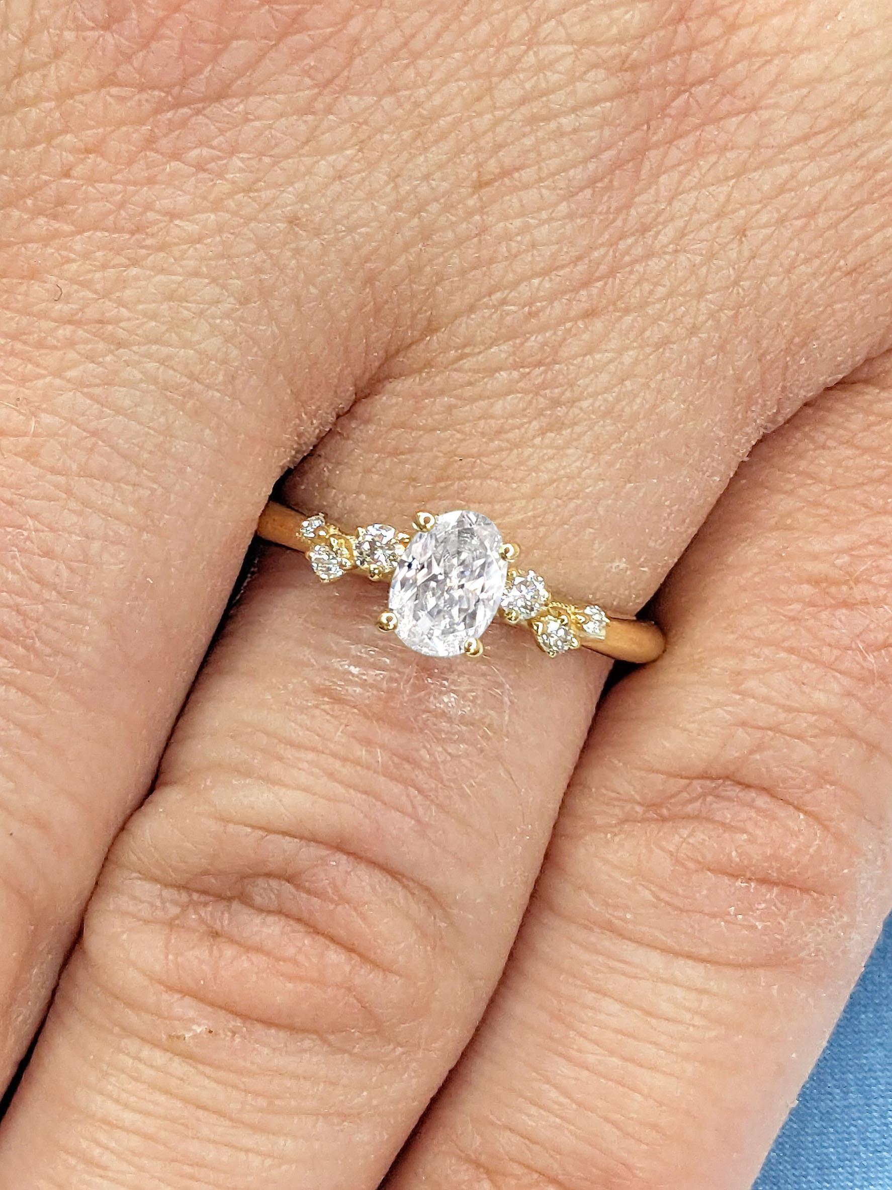 A timeless design featuring an oval cut Moissanite focal stone, accented by round cut side stones cluster, elegantly set in a snowdrift pattern on a 2mm width band. The tiny side stones are available in either natural diamonds, lab diamonds or moissanites. This unique handmade jewelry is a wonderful gift for any special occasion such as engagement, wedding anniversary or birthday.