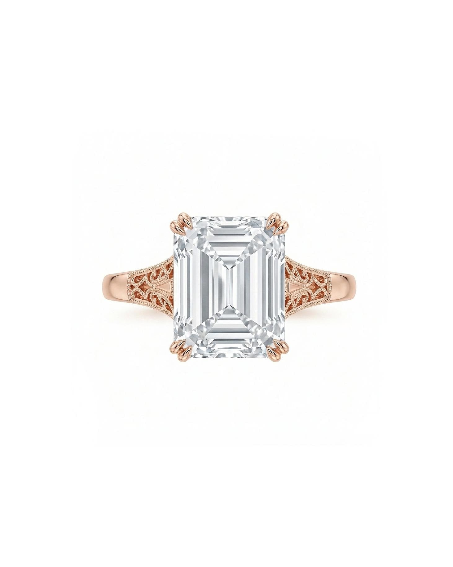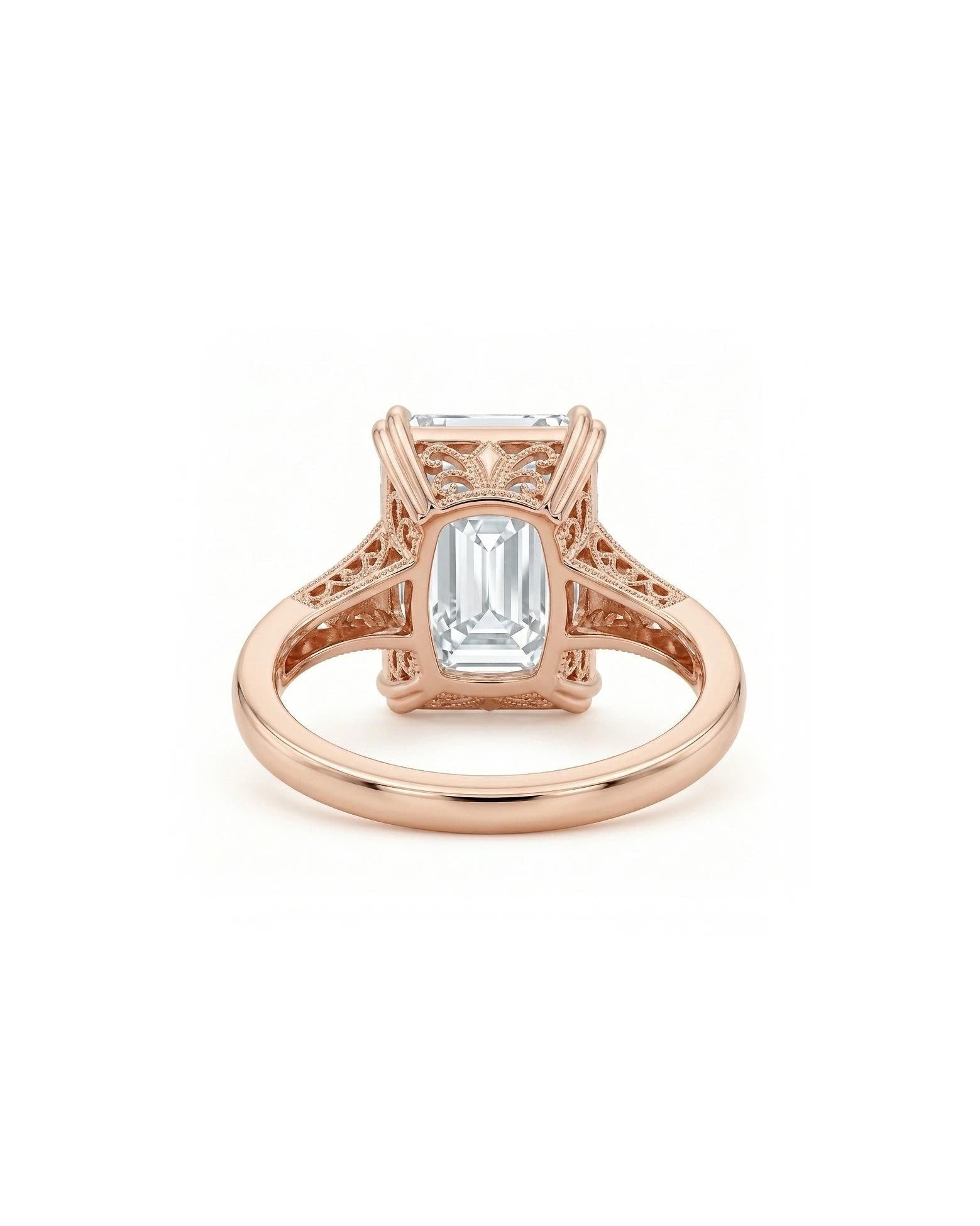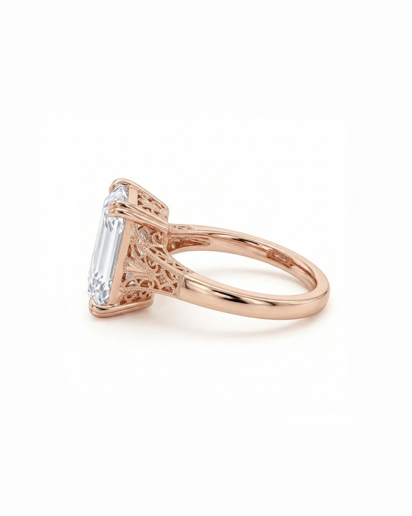 Art Deco Rose Gold Filigree Wedding Ring: Certified VS1 Lab Created Diamond, Emerald cut Solitaire
