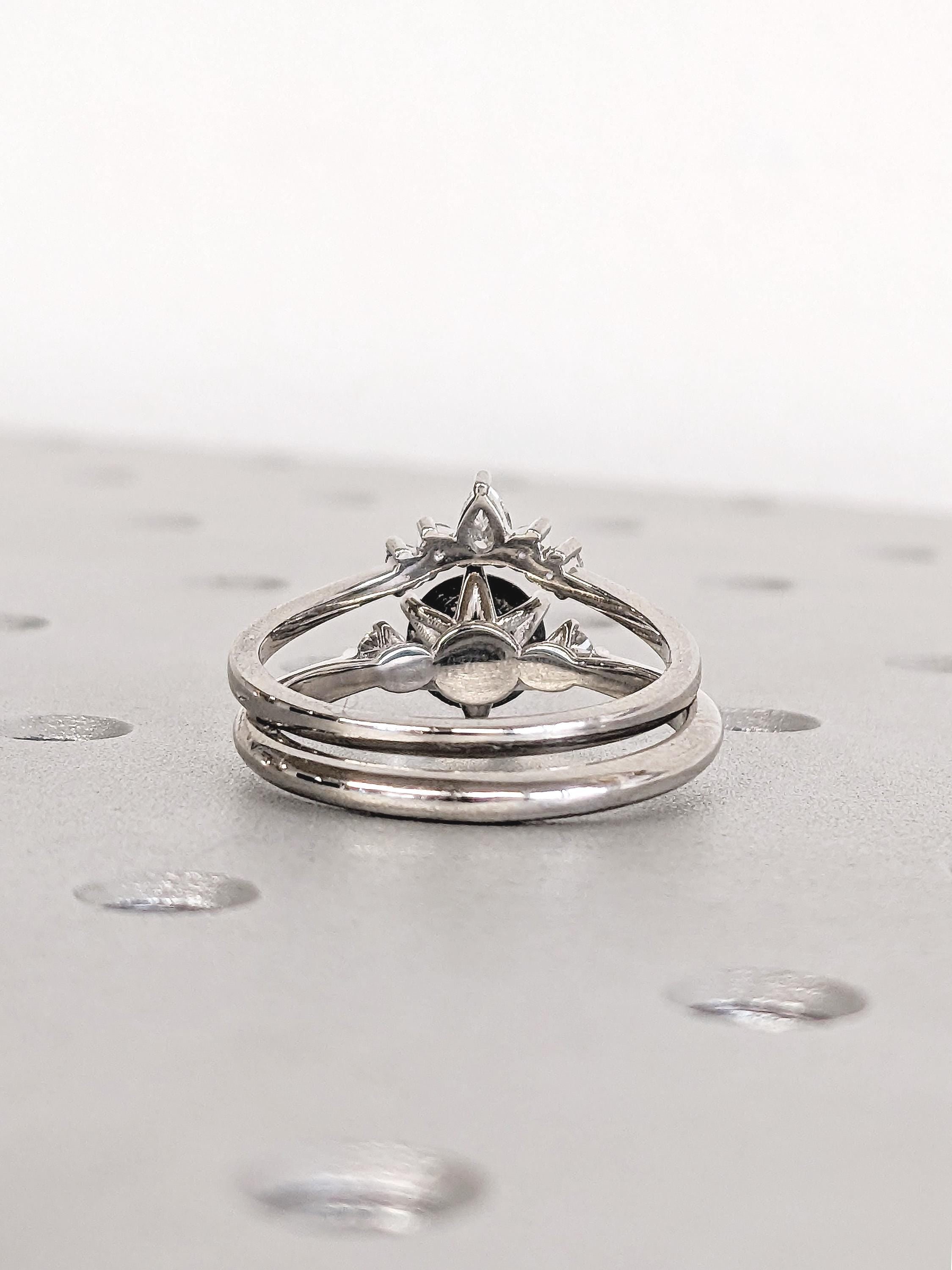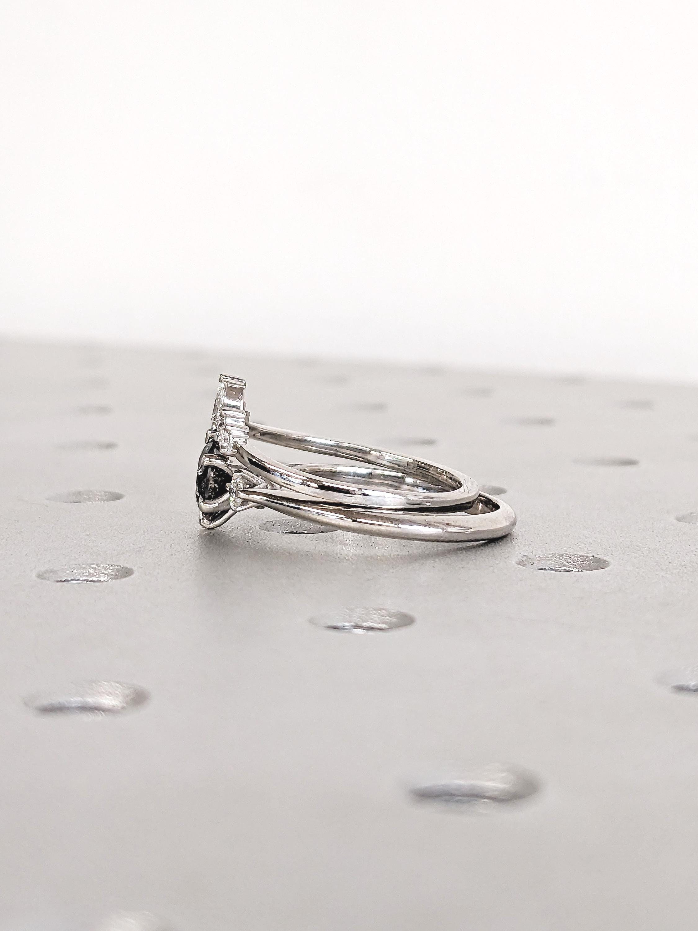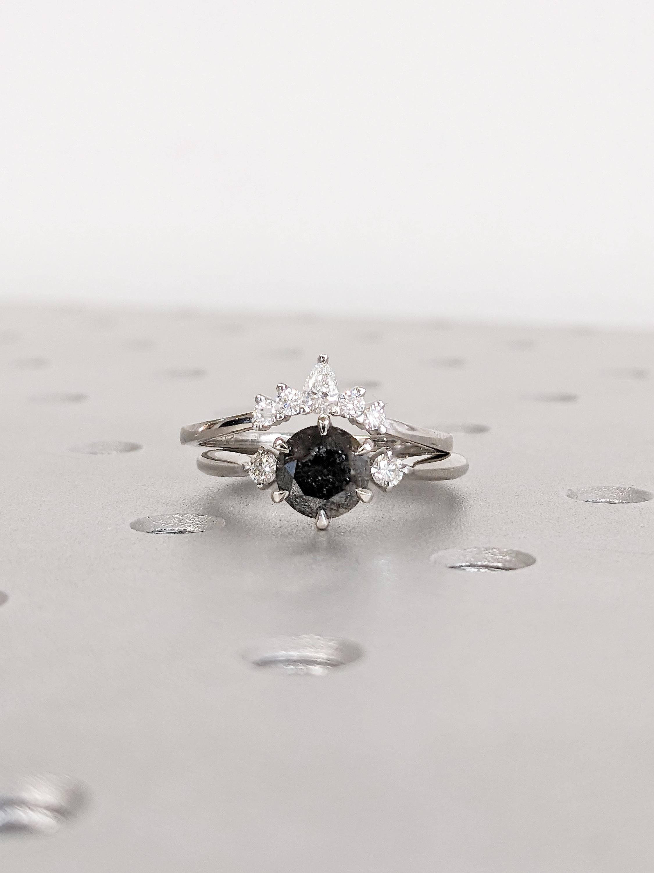 This Salt and Pepper Diamond bridal set features a striking round center stone framed by a radiant cluster of natural diamond side stones, creating a bold yet romantic look. The engagement ring’s unique galaxy-like diamond pairs beautifully with the sleek matching band, enhancing its sparkle and structure. Together, they form a modern, artful set perfect for a bride who loves a blend of character, brilliance, and contemporary elegance.