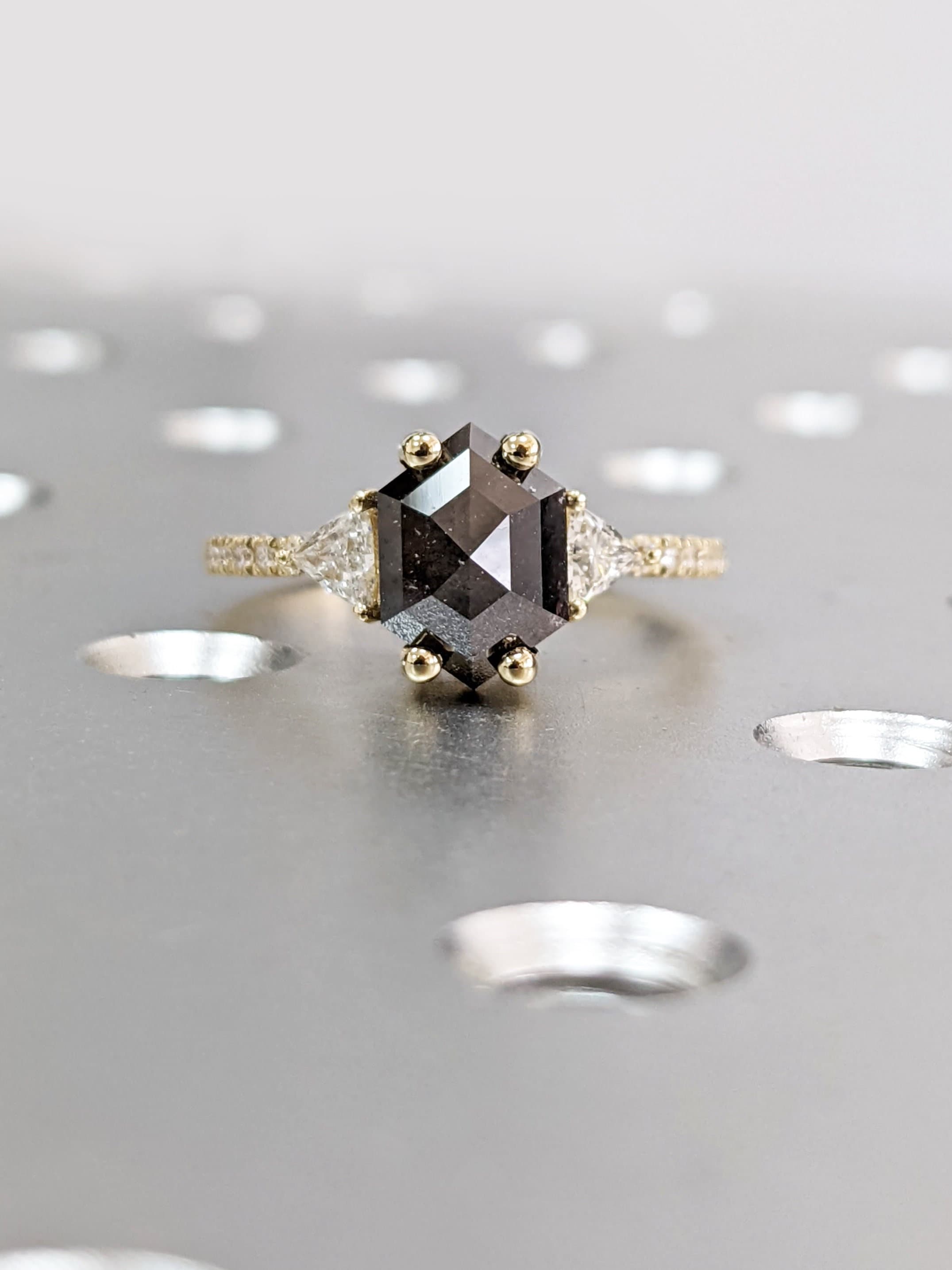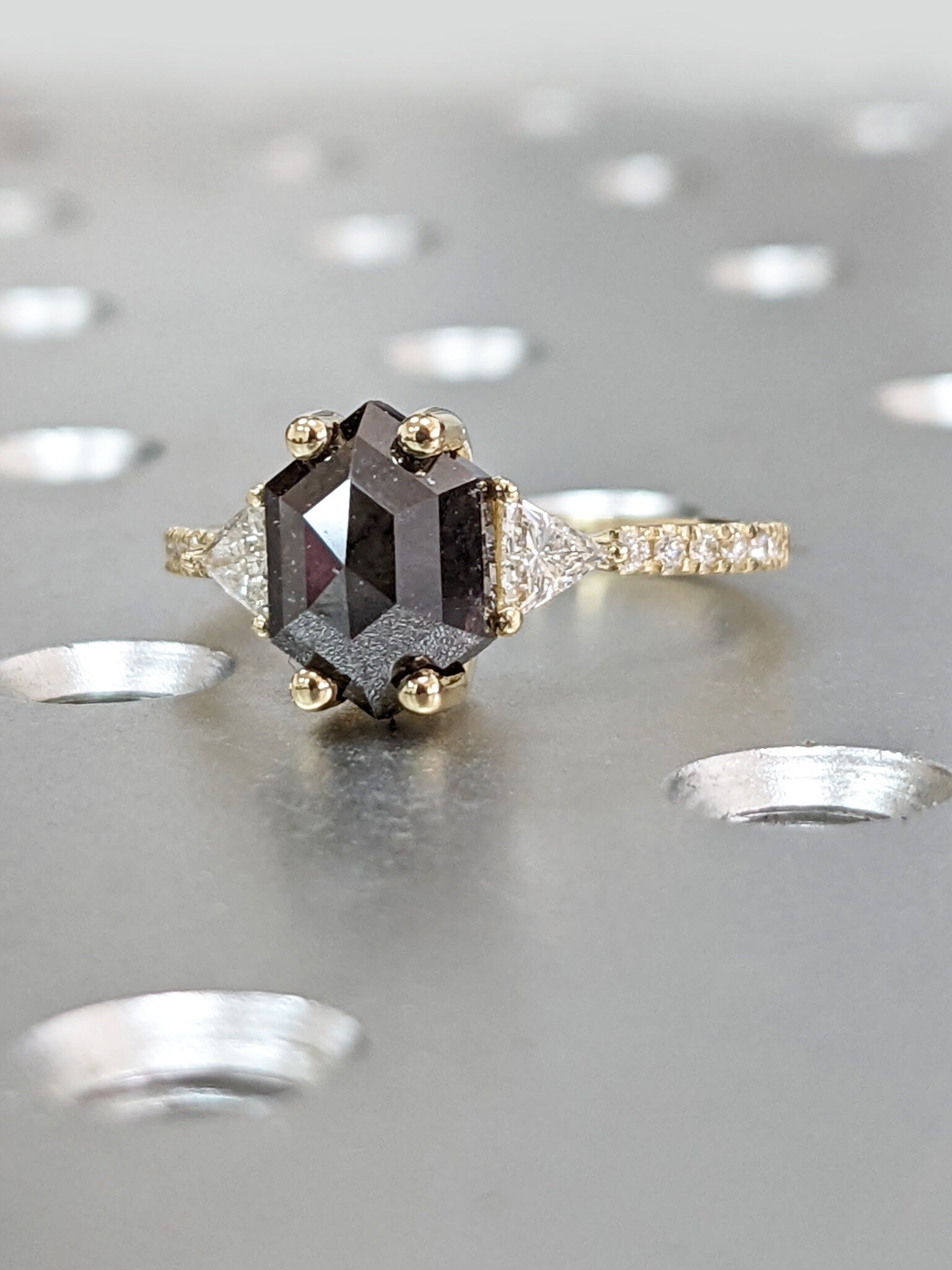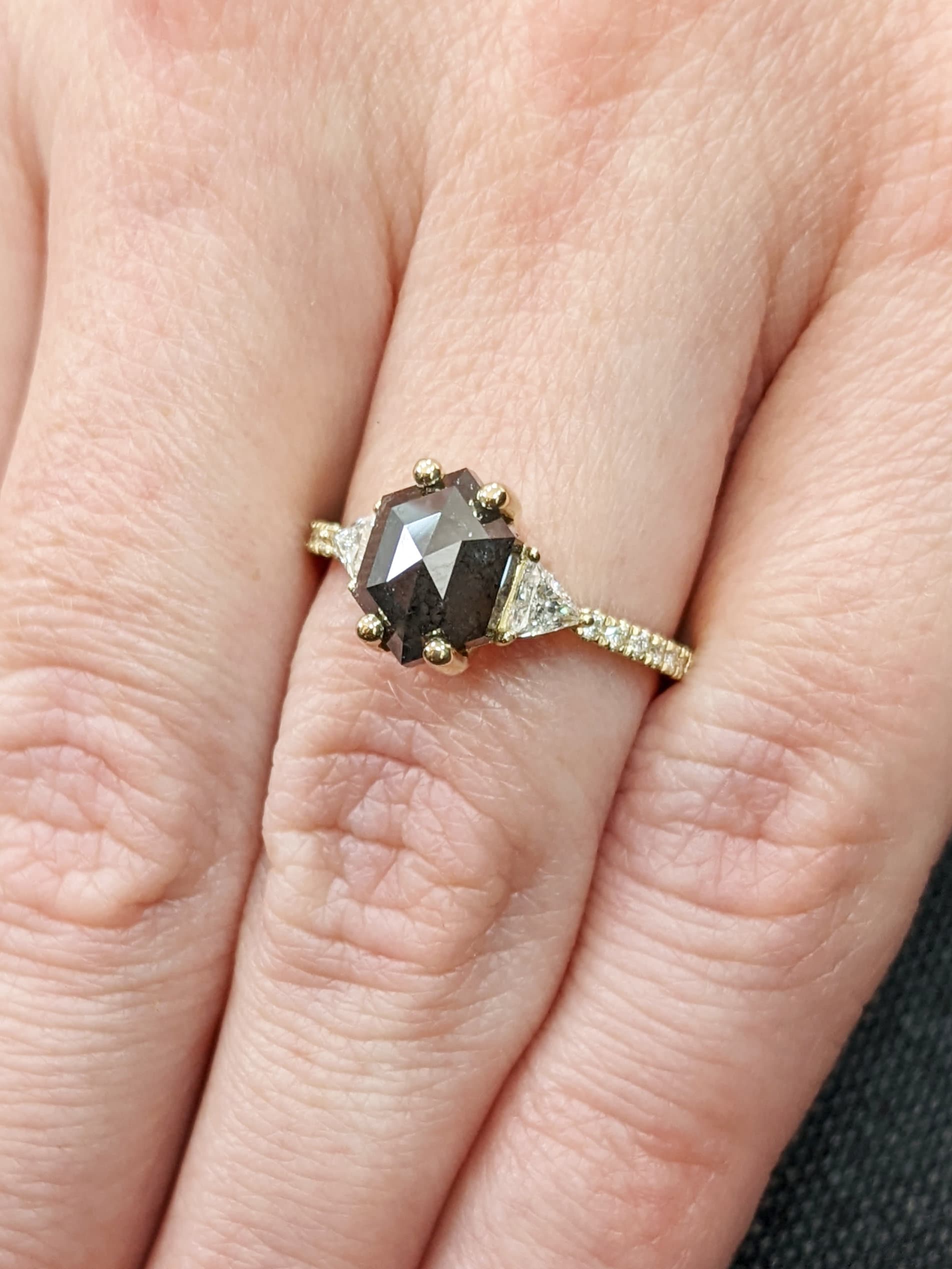 ONE-OF-A-KIND Hexagon salt and pepper diamond, a trillion enhanced diamond ring that is just pure uniqueness, nothing that has ever been seen before.