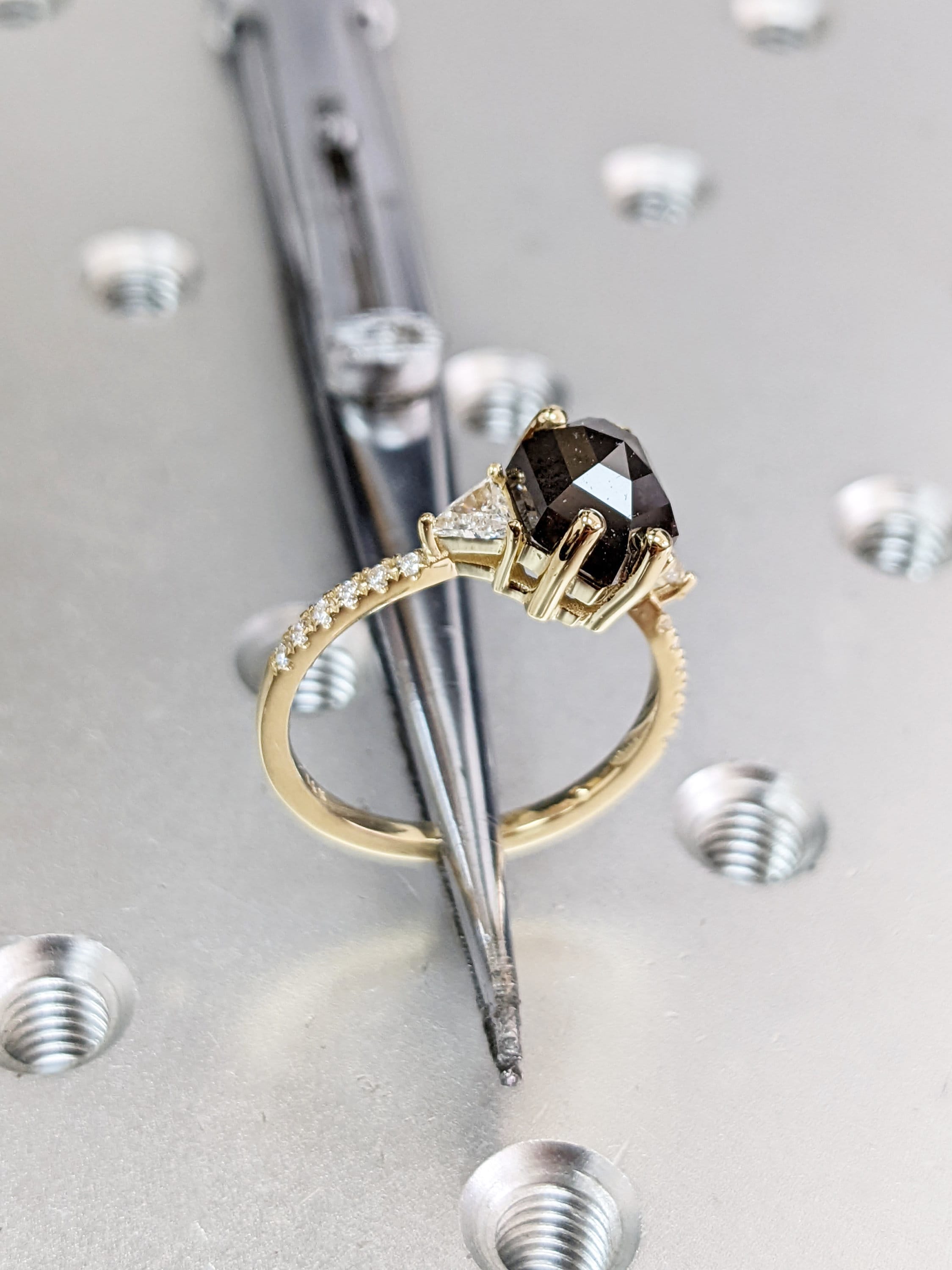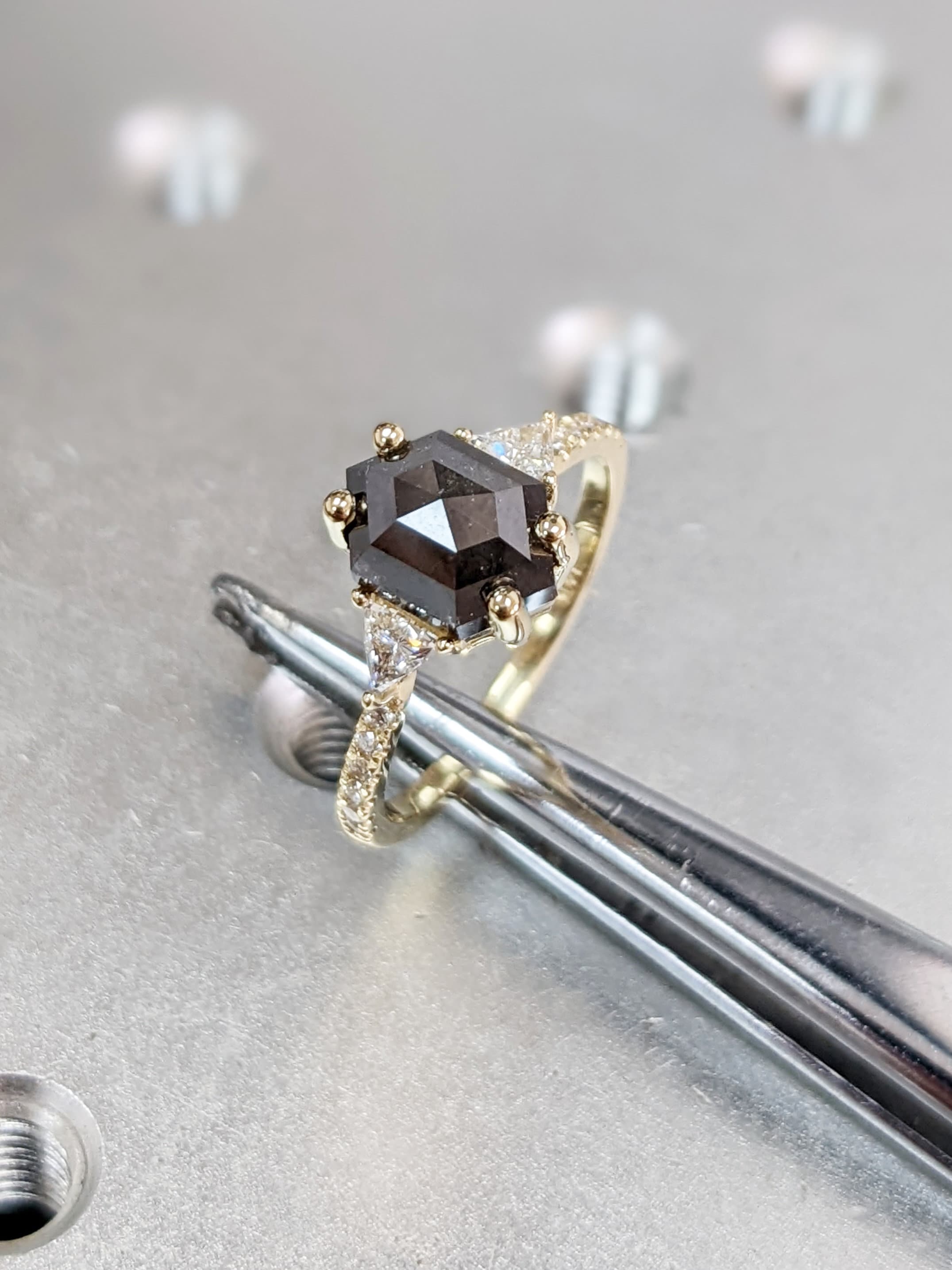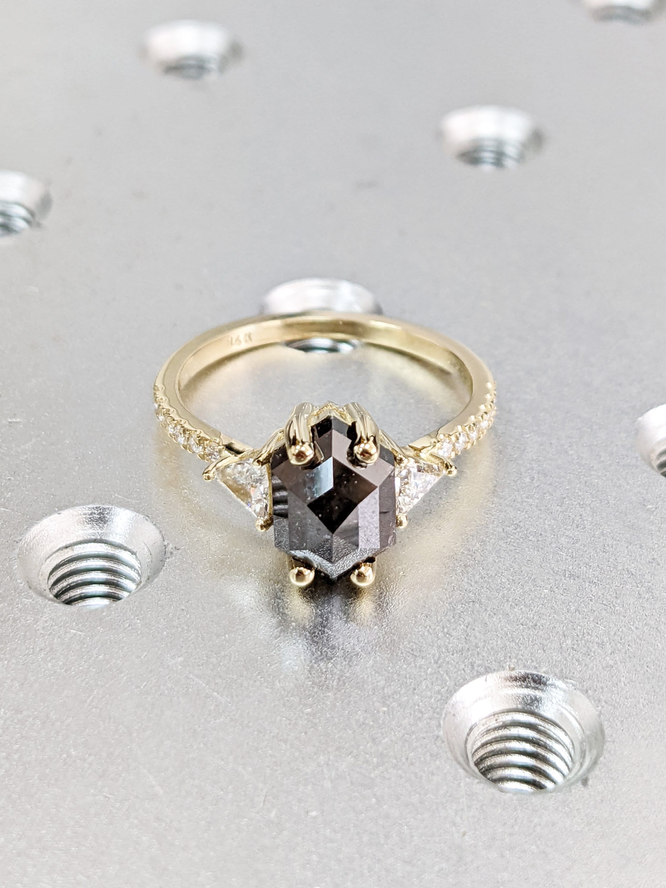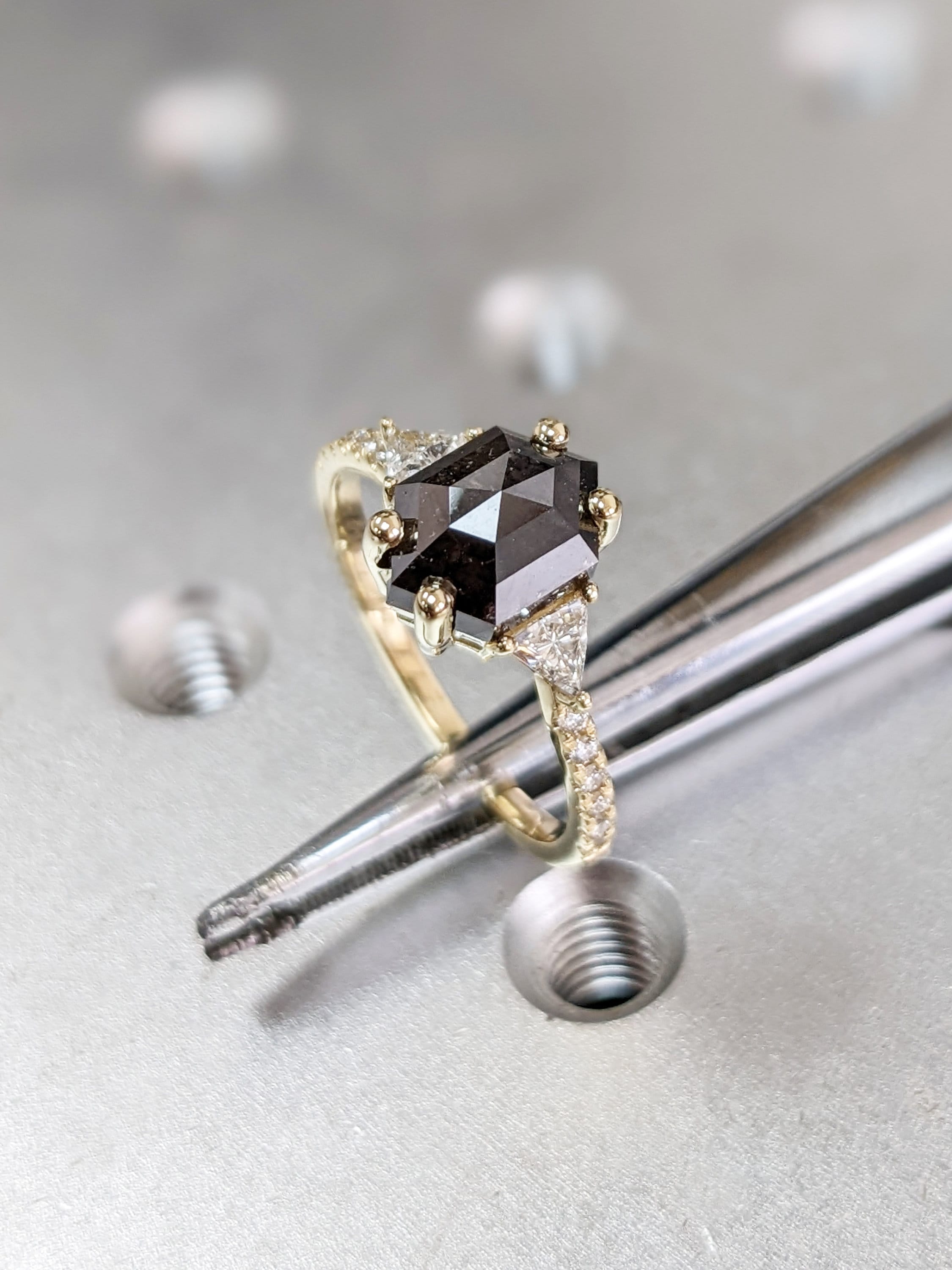 ONE-OF-A-KIND Hexagon salt and pepper diamond, a trillion enhanced diamond ring that is just pure uniqueness, nothing that has ever been seen before.