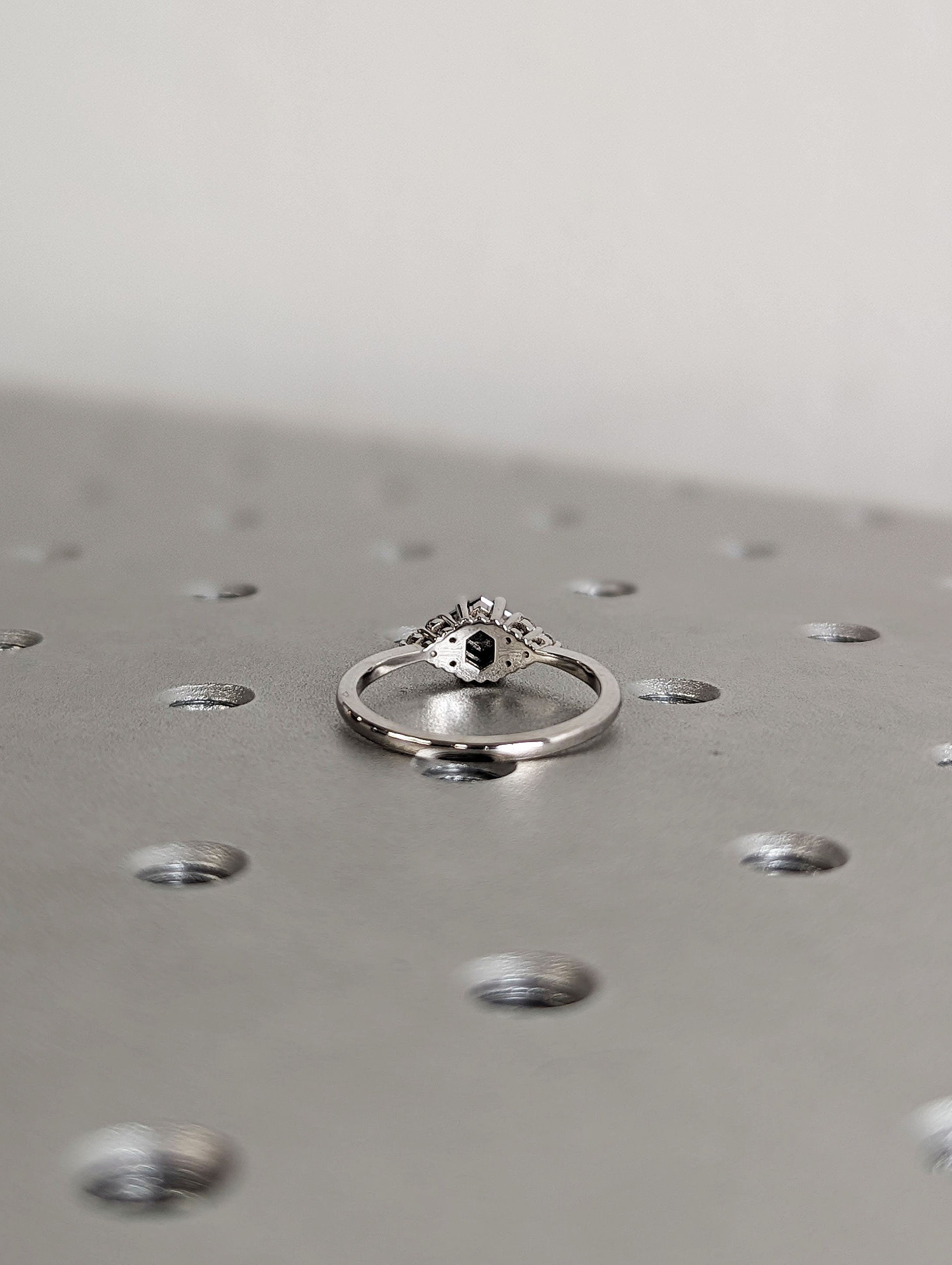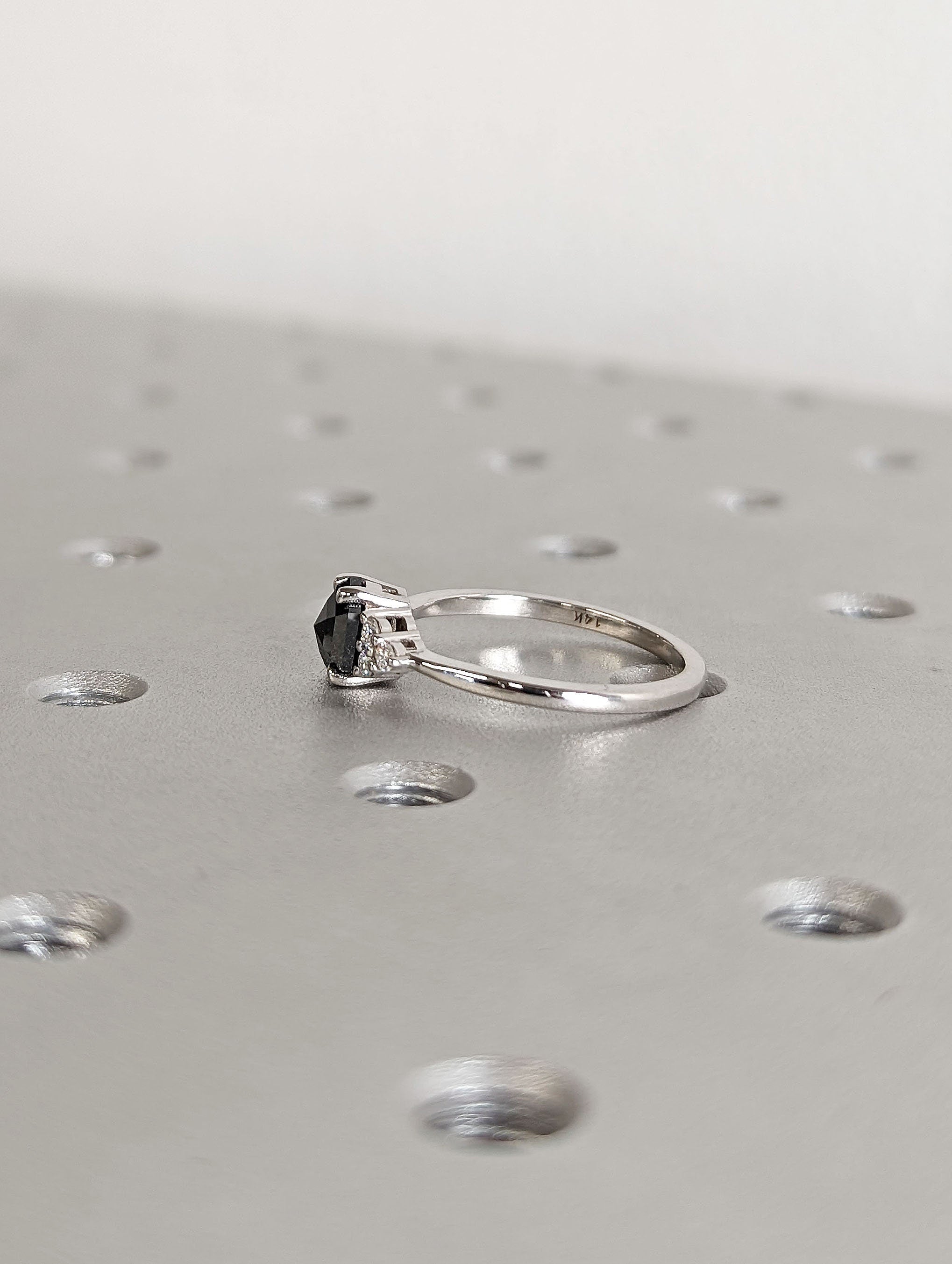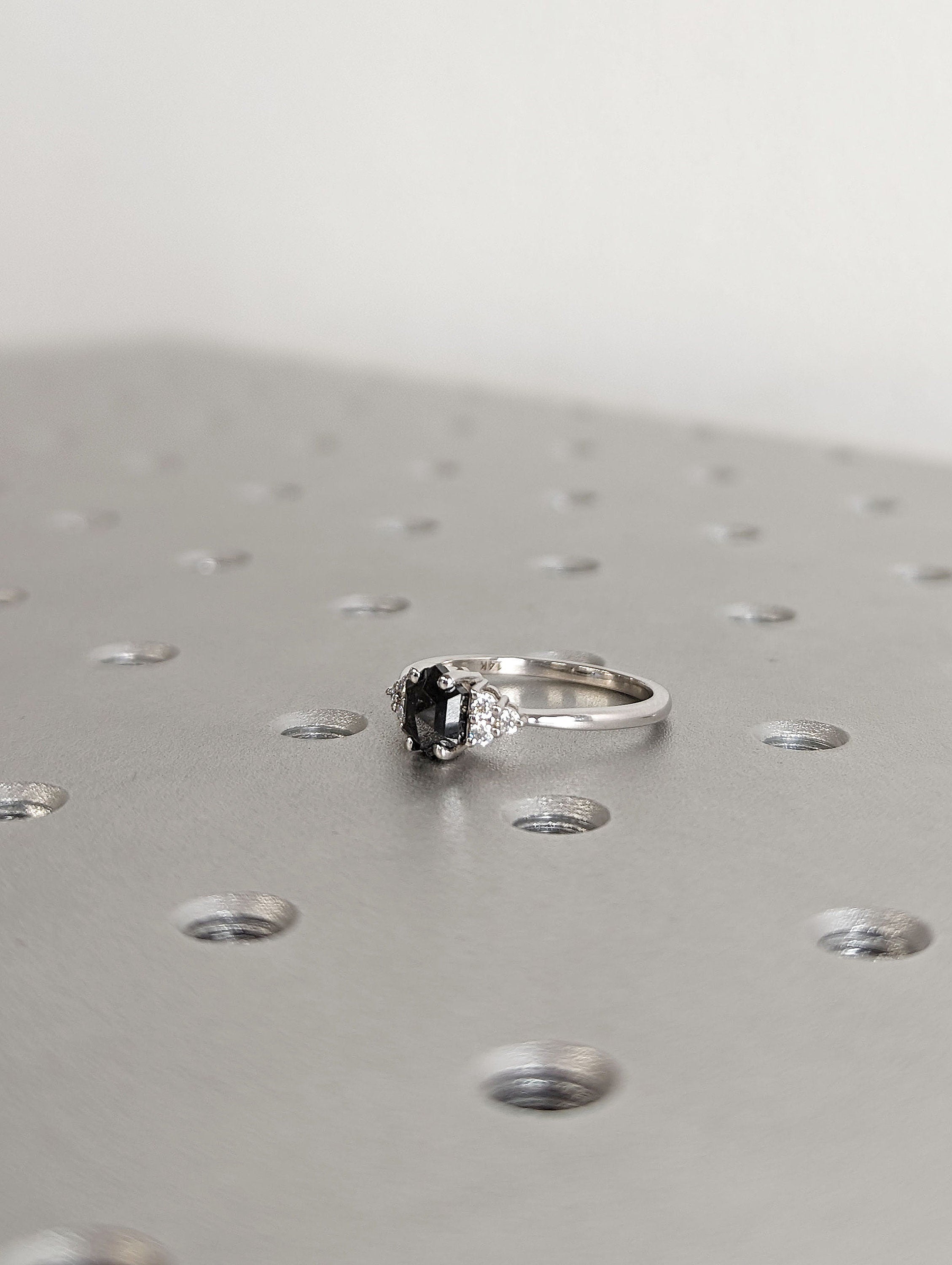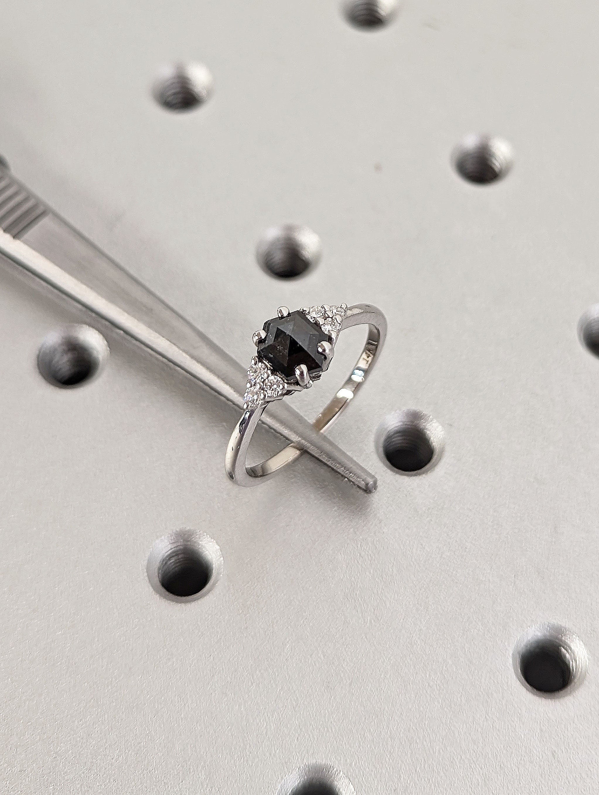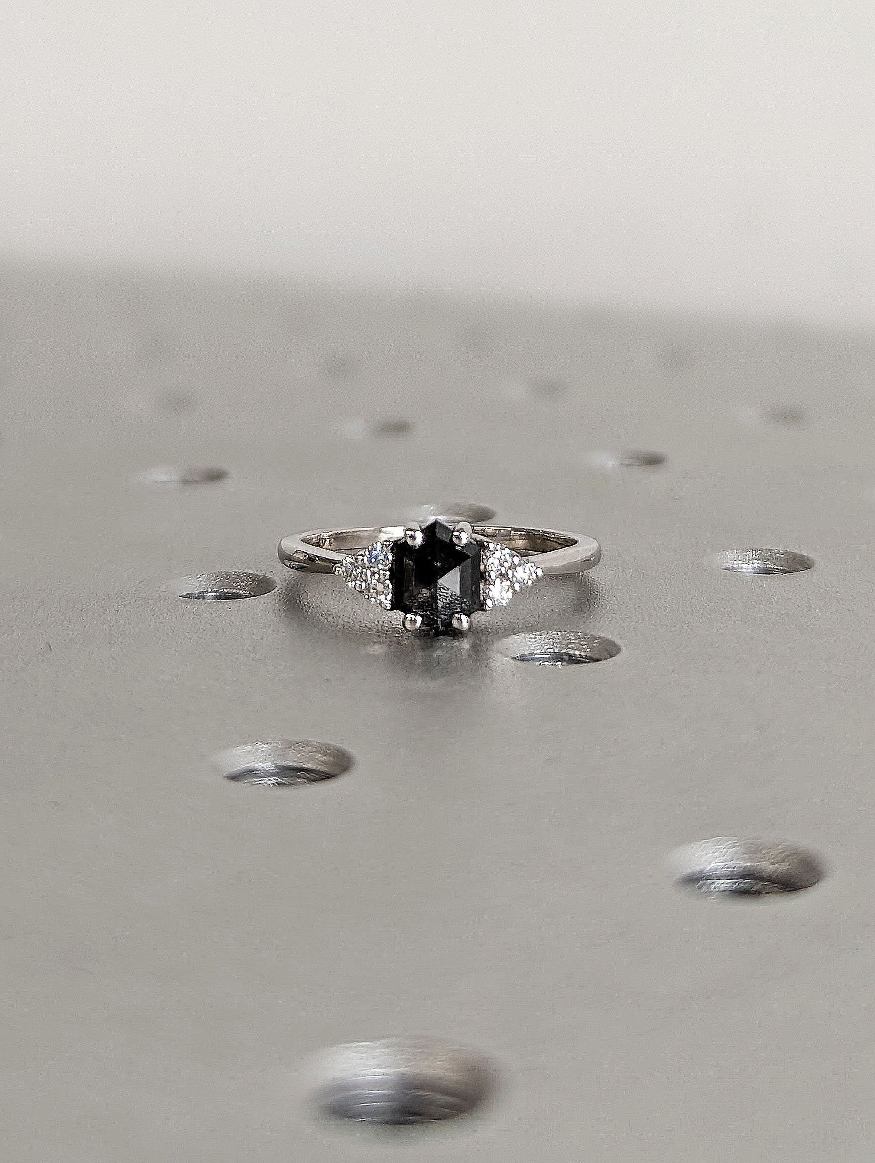 A dazzling handcrafted ring featuring a hexagon shape, natural Salt and Pepper Diamond center, accented by round diamonds or moissanites on a tapered dainty band.