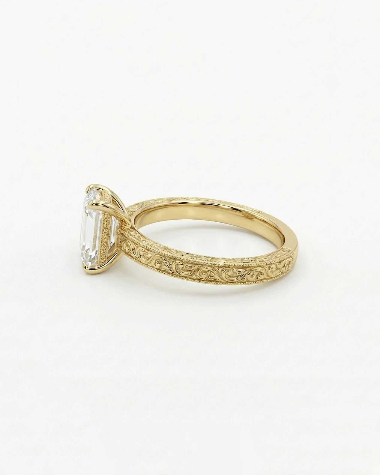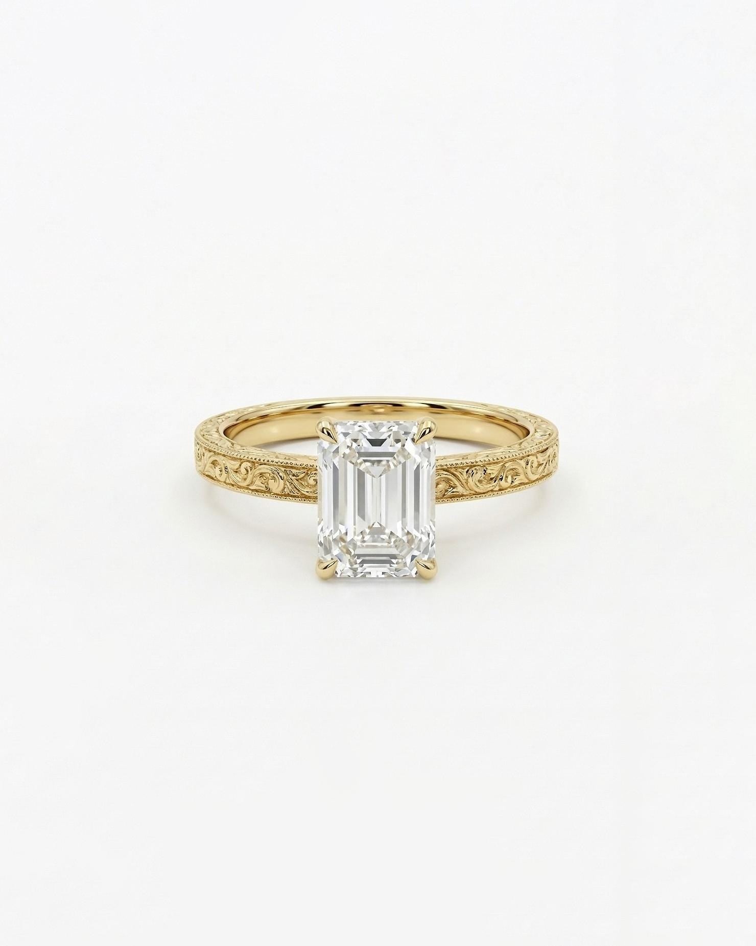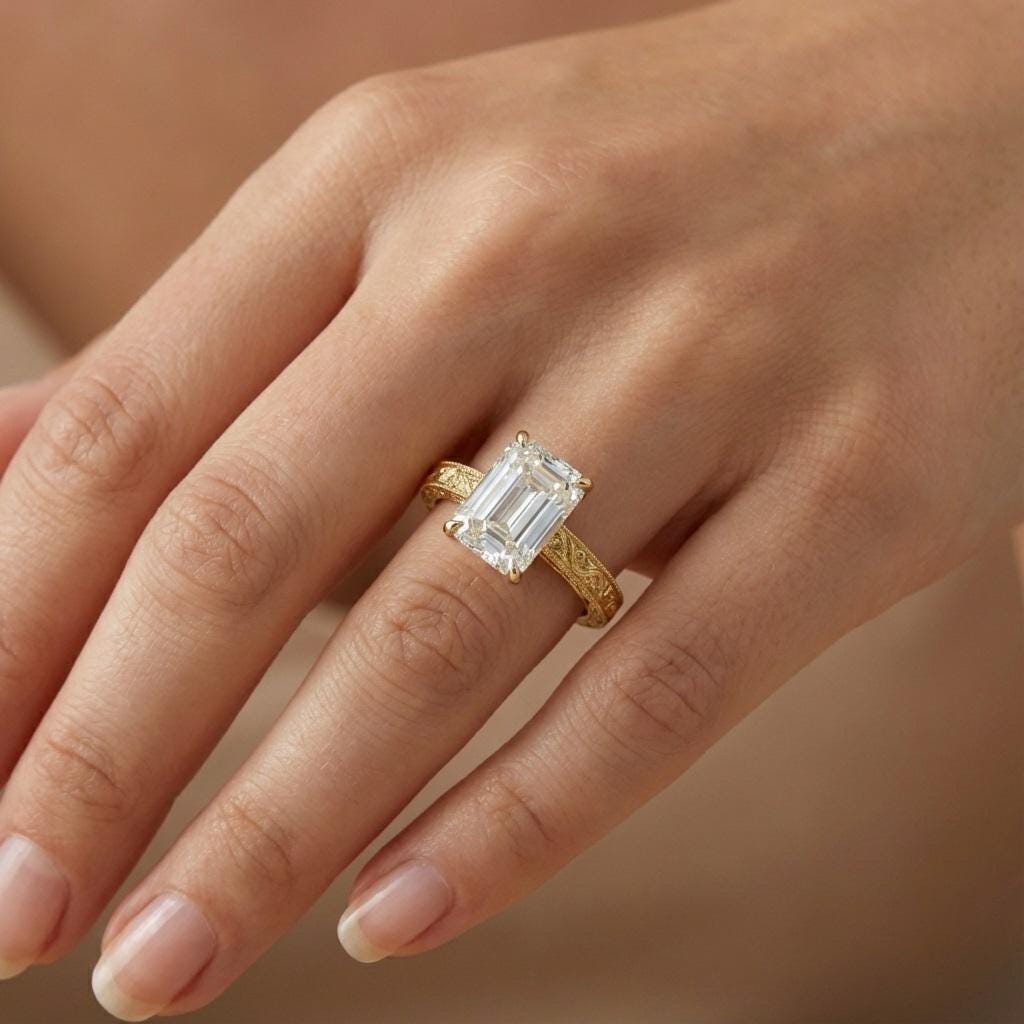 Art Deco Solitaire Wedding Anniversary Gold Ring: 1-4ct VVS Moissanite, Emerald cut, Talon Prong Setting