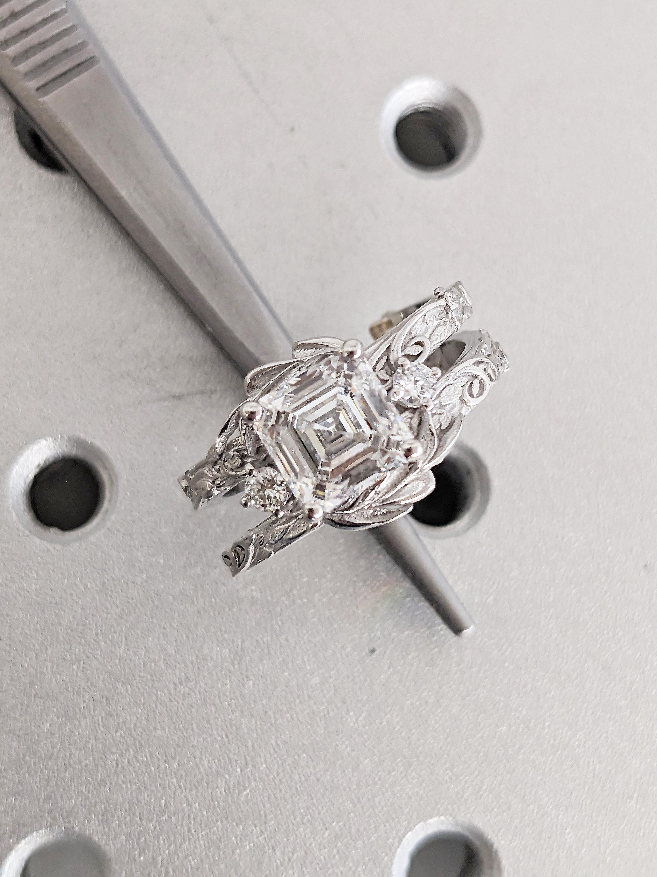 This antique style engagement ring showcases a captivating Asscher-cut Lab Grown Diamond at its center, complemented by round-cut side stones available in Natural Diamonds, Lab Diamonds, or Moissanites. Delicate floral engravings flow elegantly along the band, adding a touch of vintage romance to its timeless brilliance. A perfect choice for those who cherish sustainability, beauty, and everlasting love.