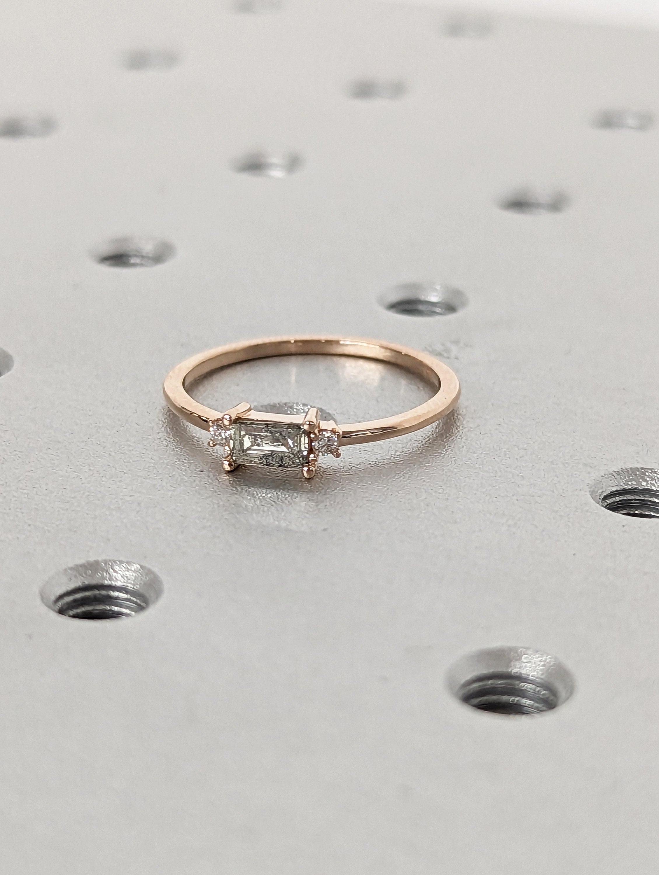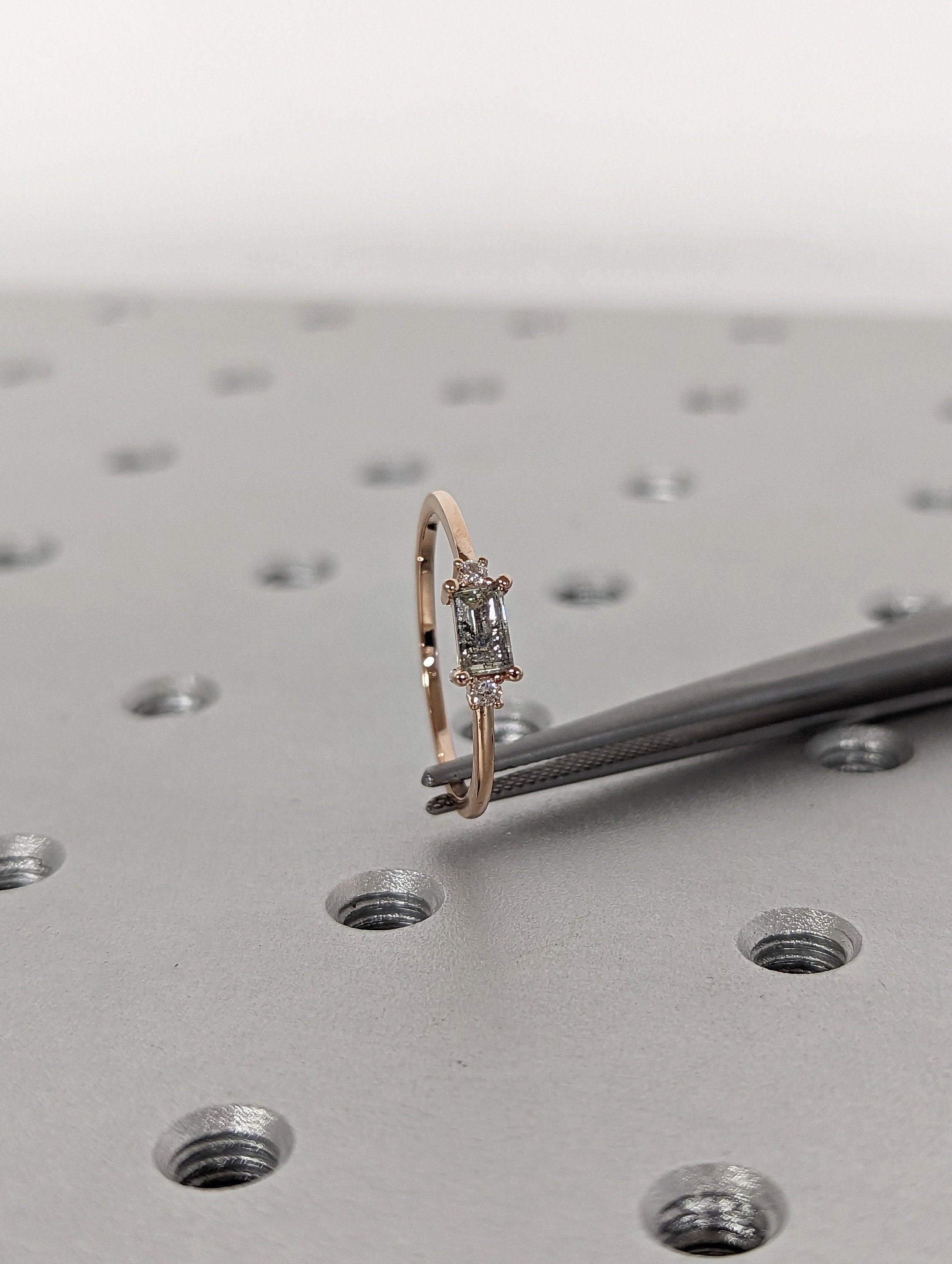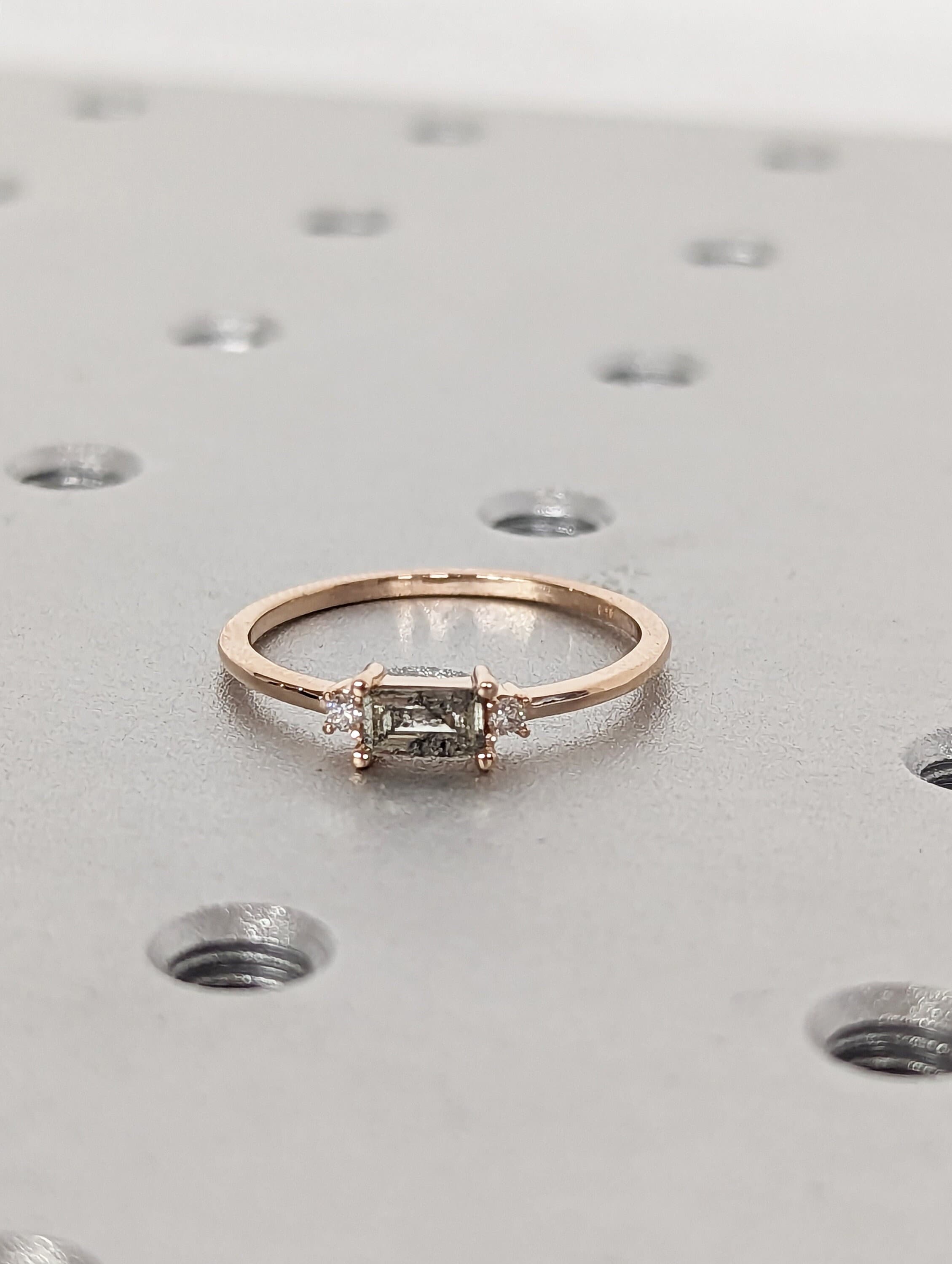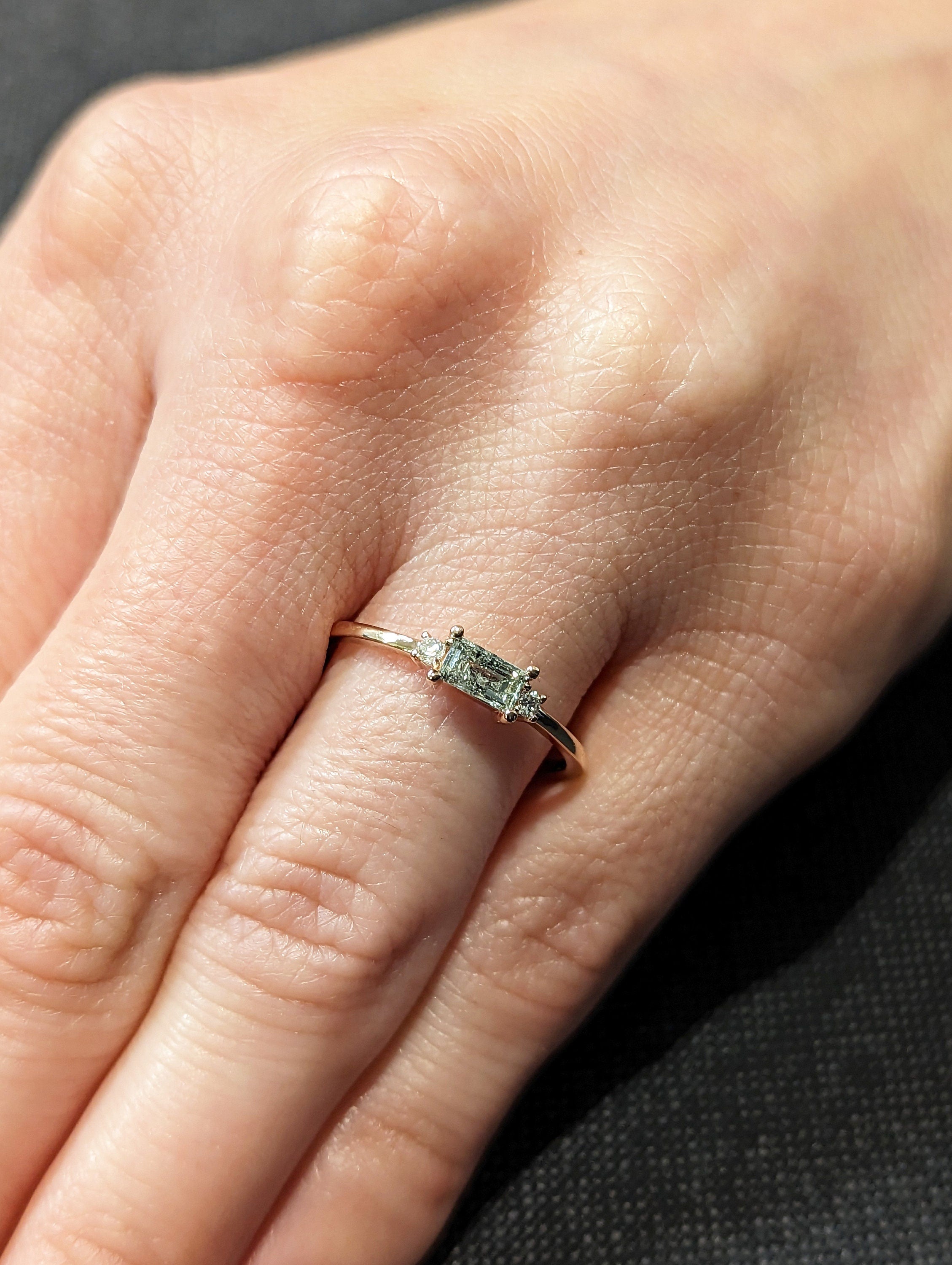 Emerald Baguette Raw Salt and Pepper Diamond Gold Engagement Ring Art Deco 1920's Inspired Thin Petite Band 14k Unique Ring for Her