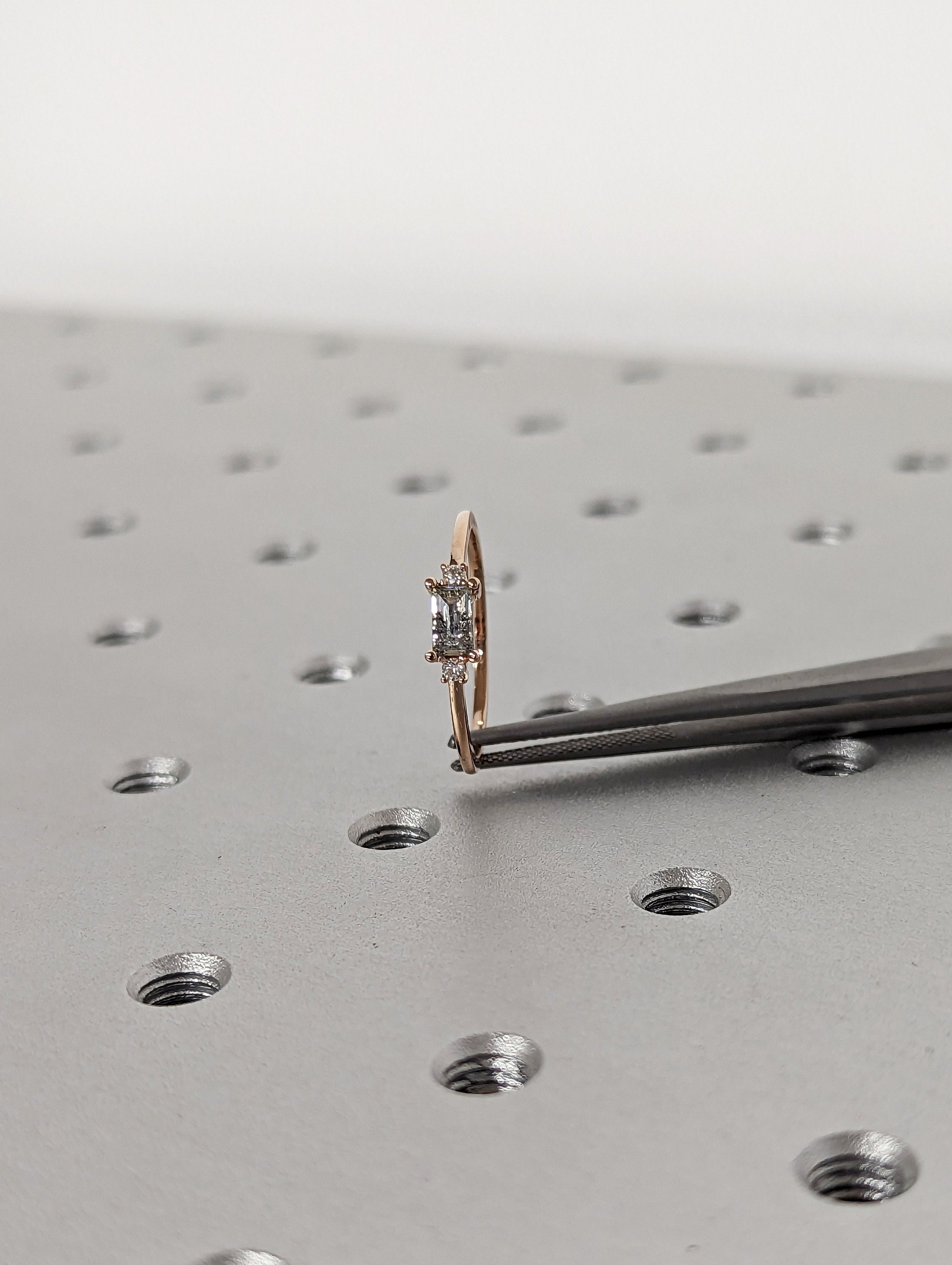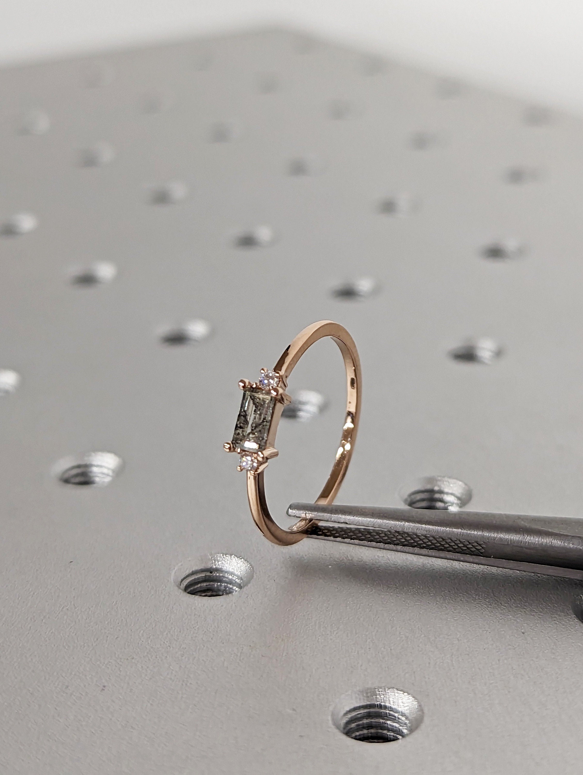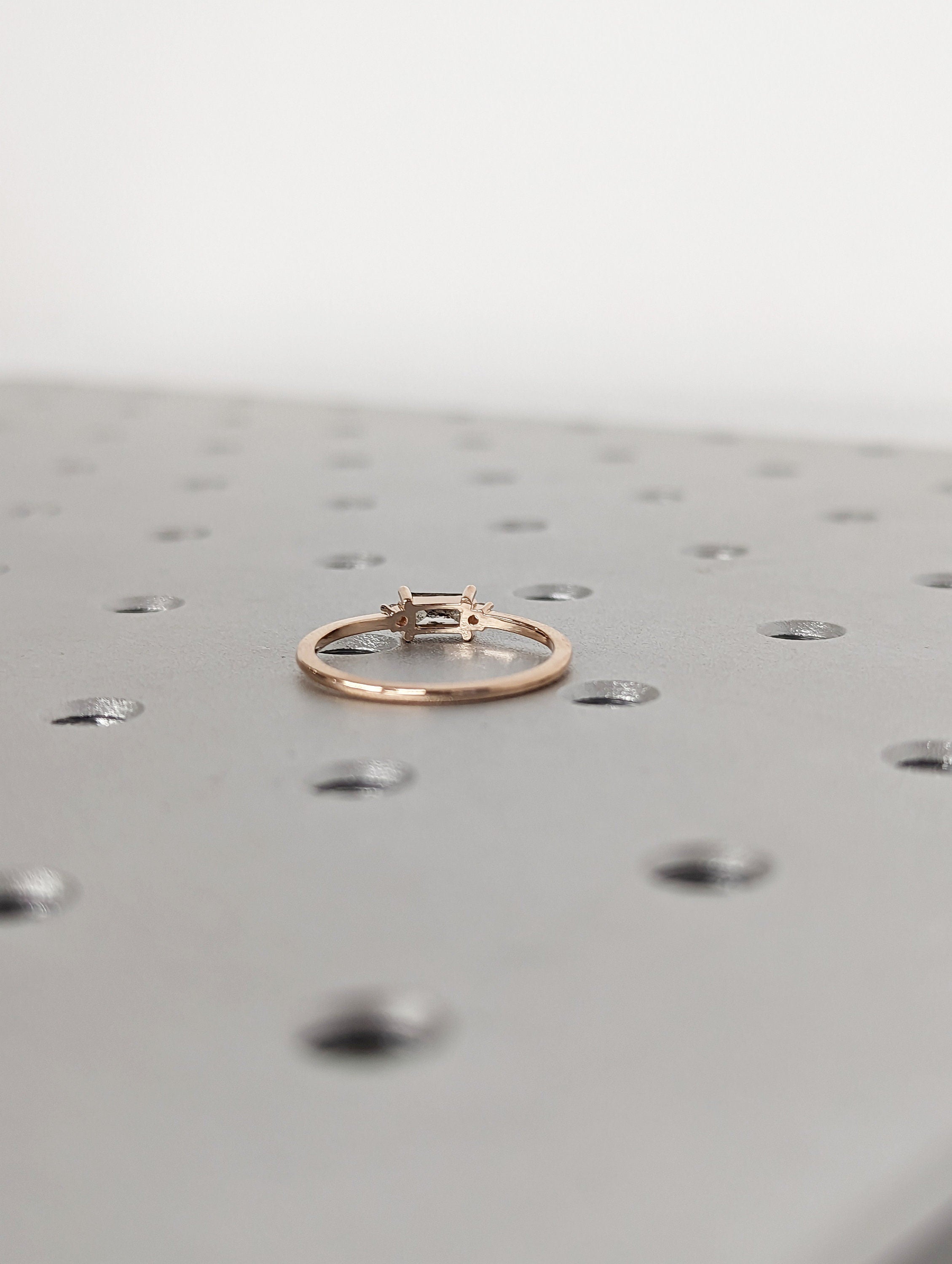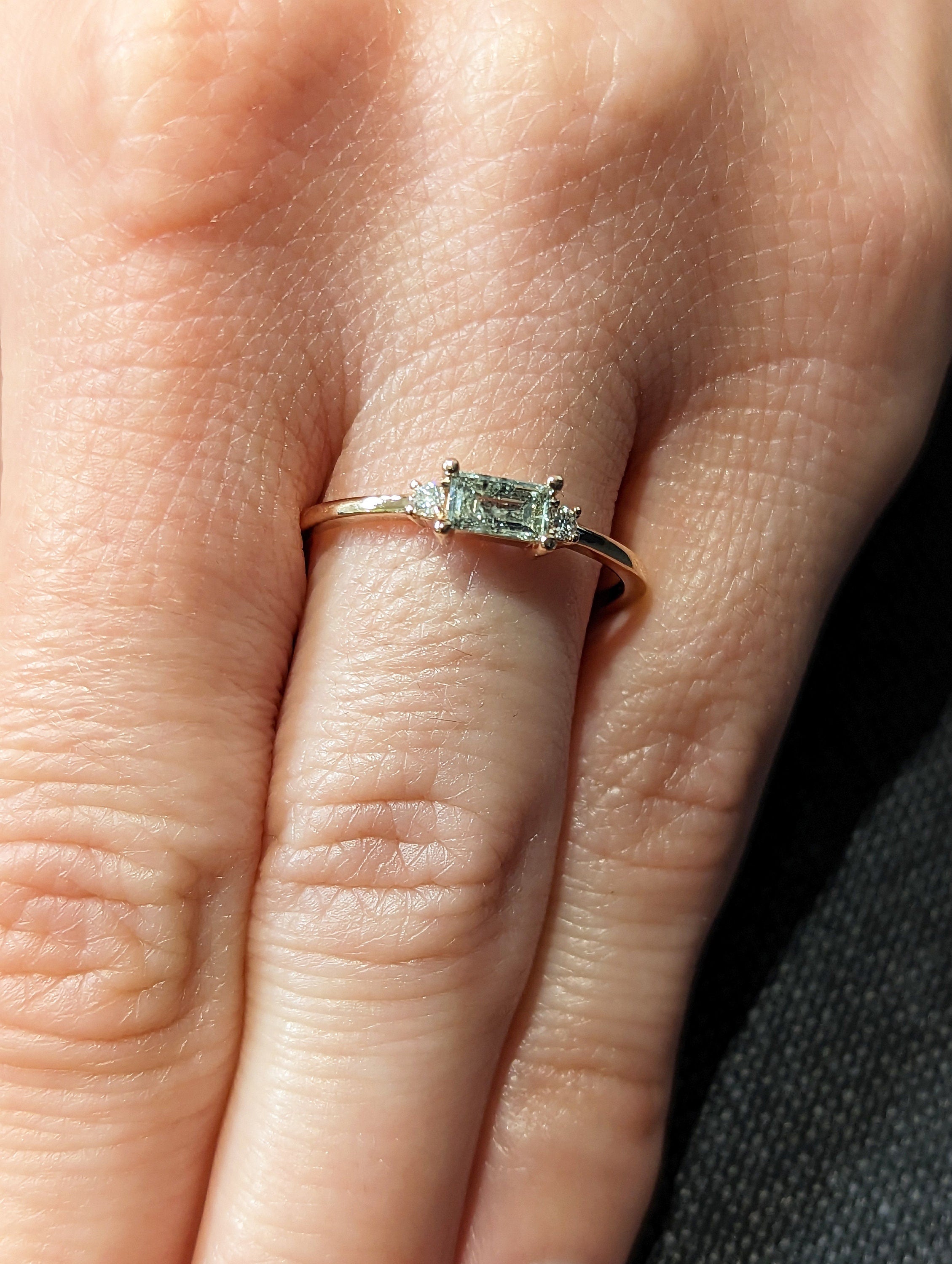 Emerald Baguette Raw Salt and Pepper Diamond Gold Engagement Ring Art Deco 1920's Inspired Thin Petite Band 14k Unique Ring for Her