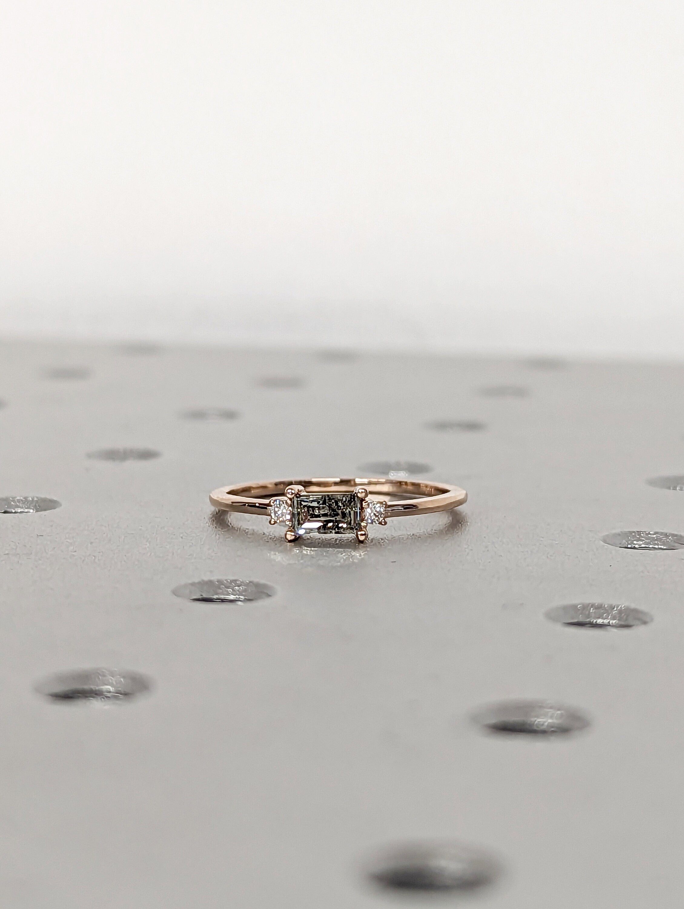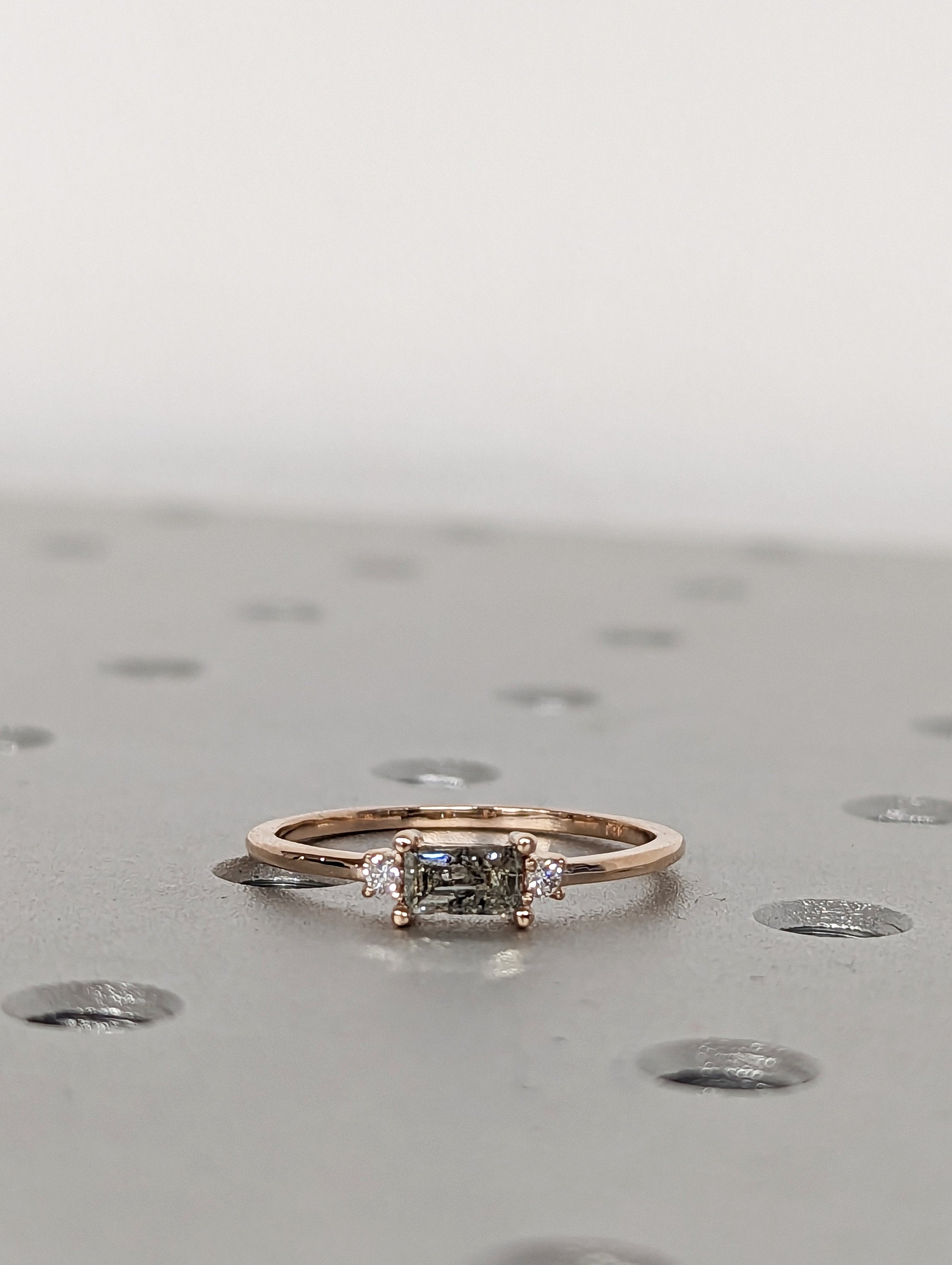 A stunningly beautiful vintage inspired design, petite band with a baguette cut Salt & Pepper diamond, adorned by 2 beautiful diamonds to contrast the center diamond.