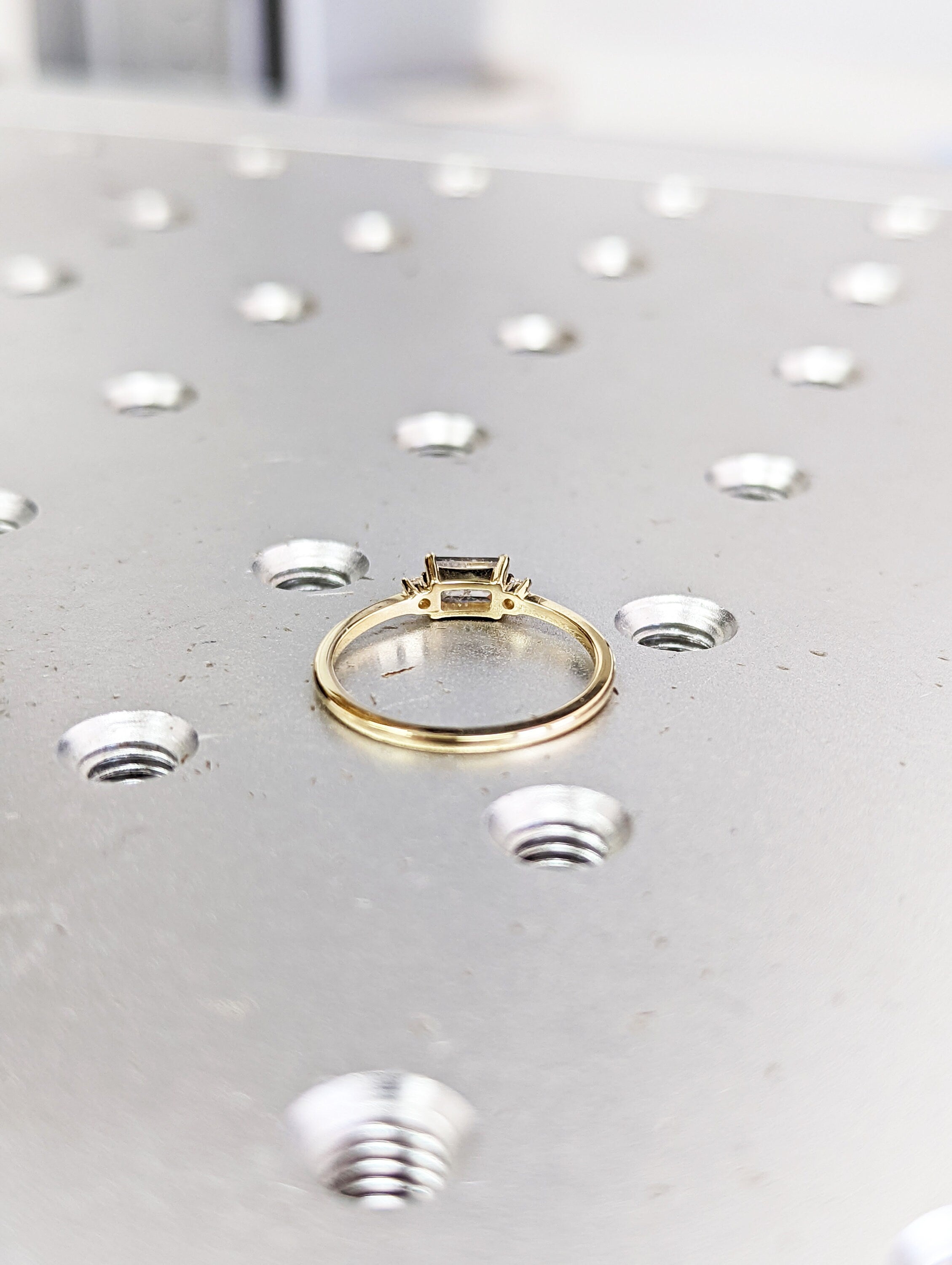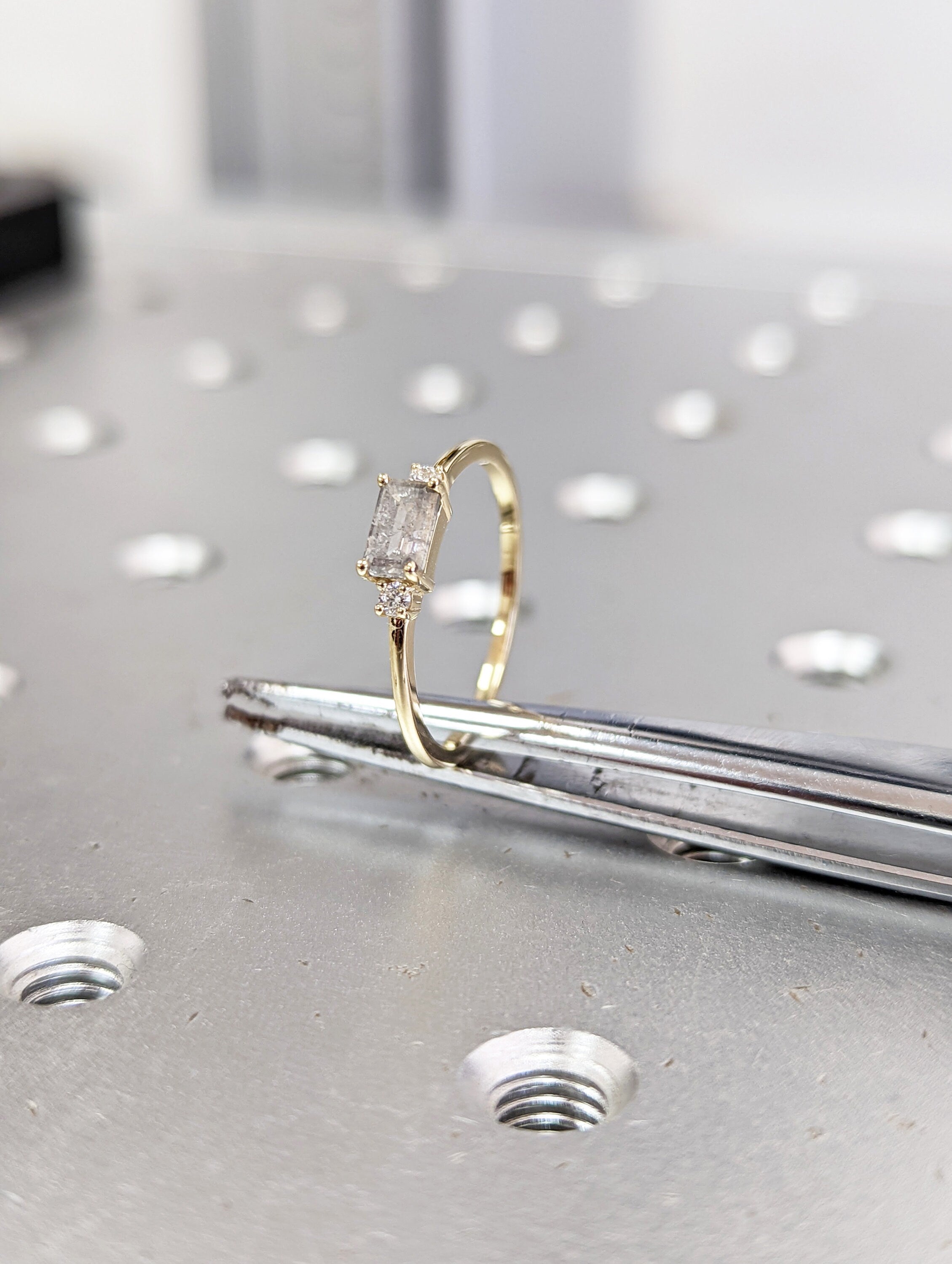 Emerald Baguette Raw Salt and Pepper Diamond Gold Engagement Ring Art Deco 1920's Inspired Thin Petite Band 14k Unique Ring for Her