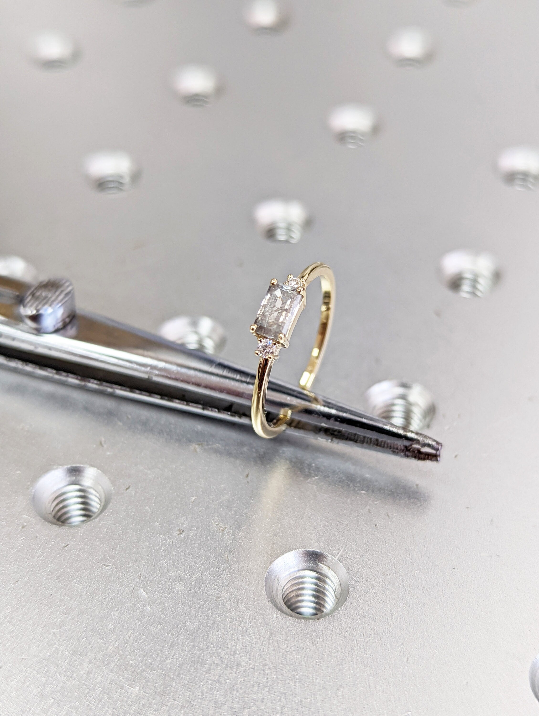 A stunningly beautiful vintage inspired design, petite band with a baguette cut Salt & Pepper diamond, adorned by 2 beautiful diamonds to contrast the center diamond.