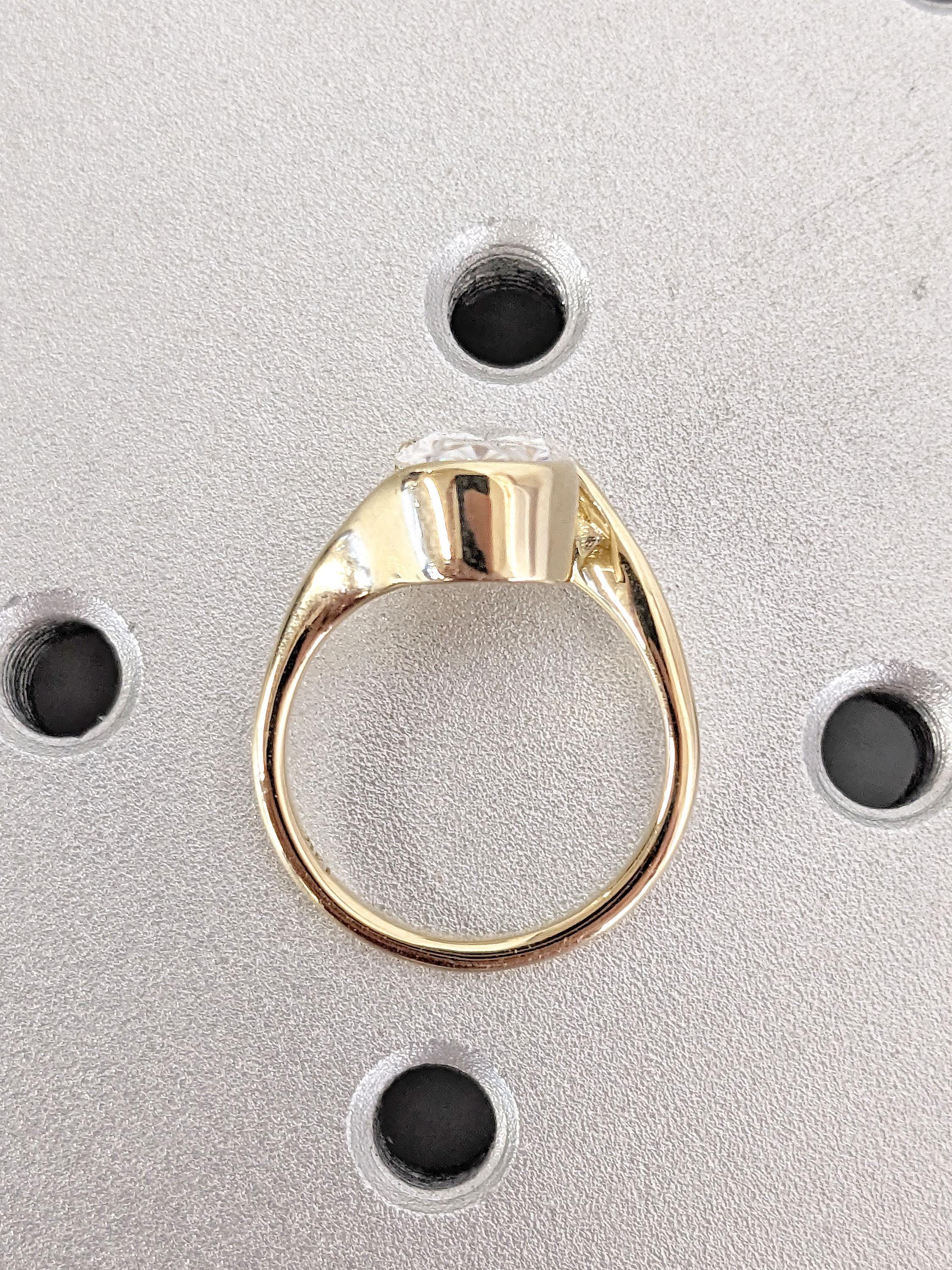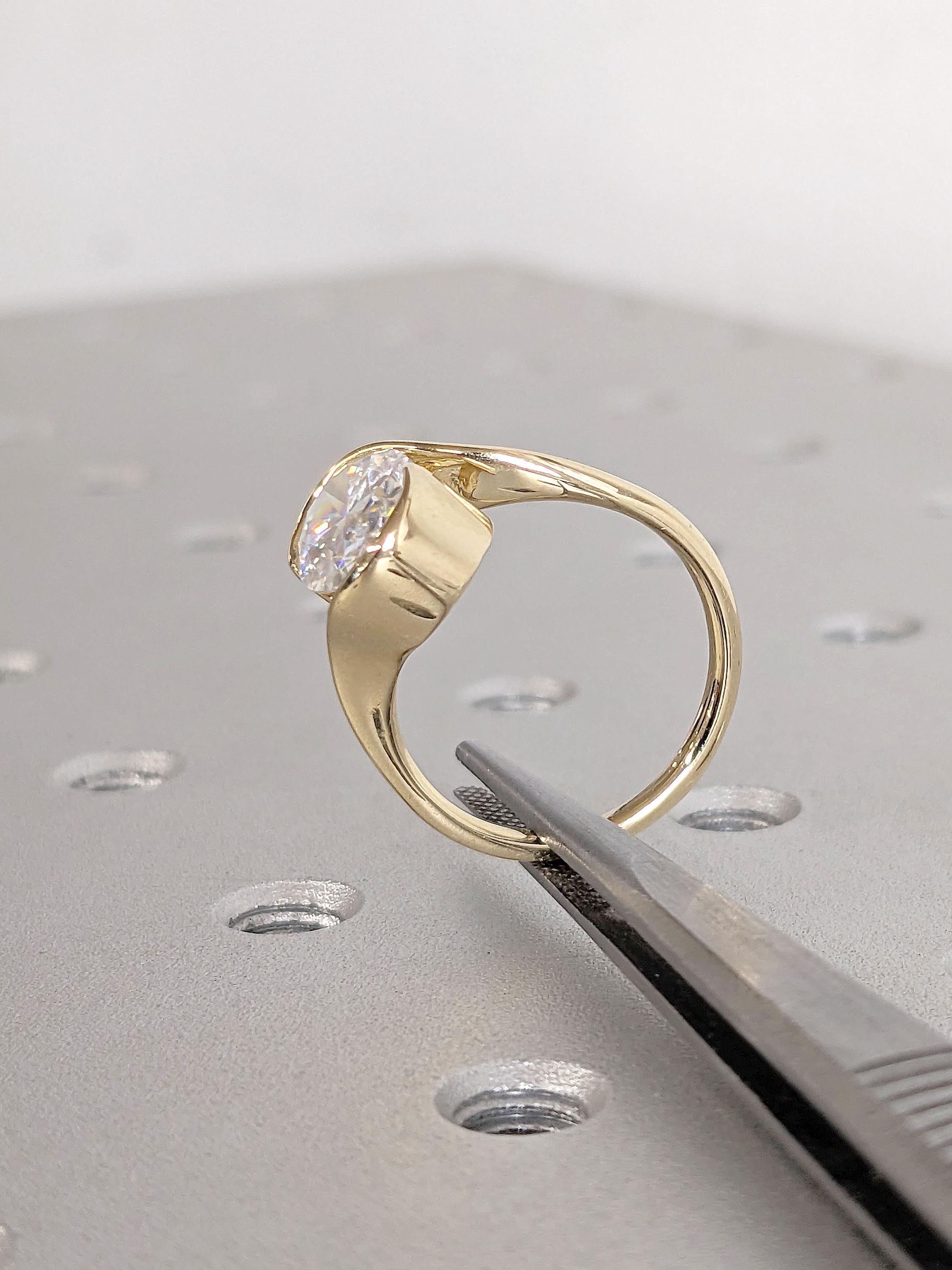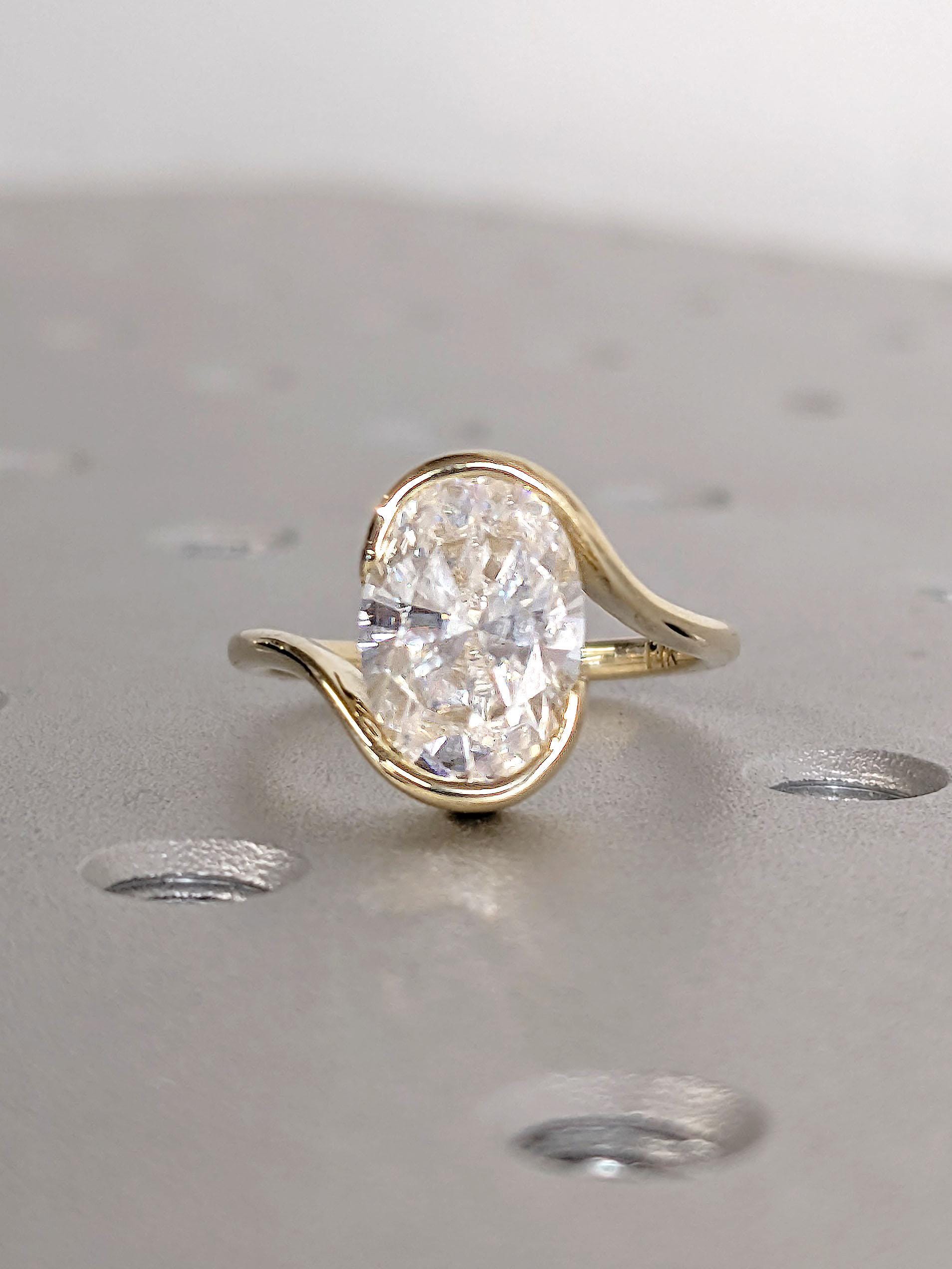 Modern and unique, a bezel set bypass ring featuring an oval cut Moissanite center stone, set on a dainty 1.6mm width band. This minimalist yet trendy statement ring makes it a wonderful complementing jewelry for any occasion.