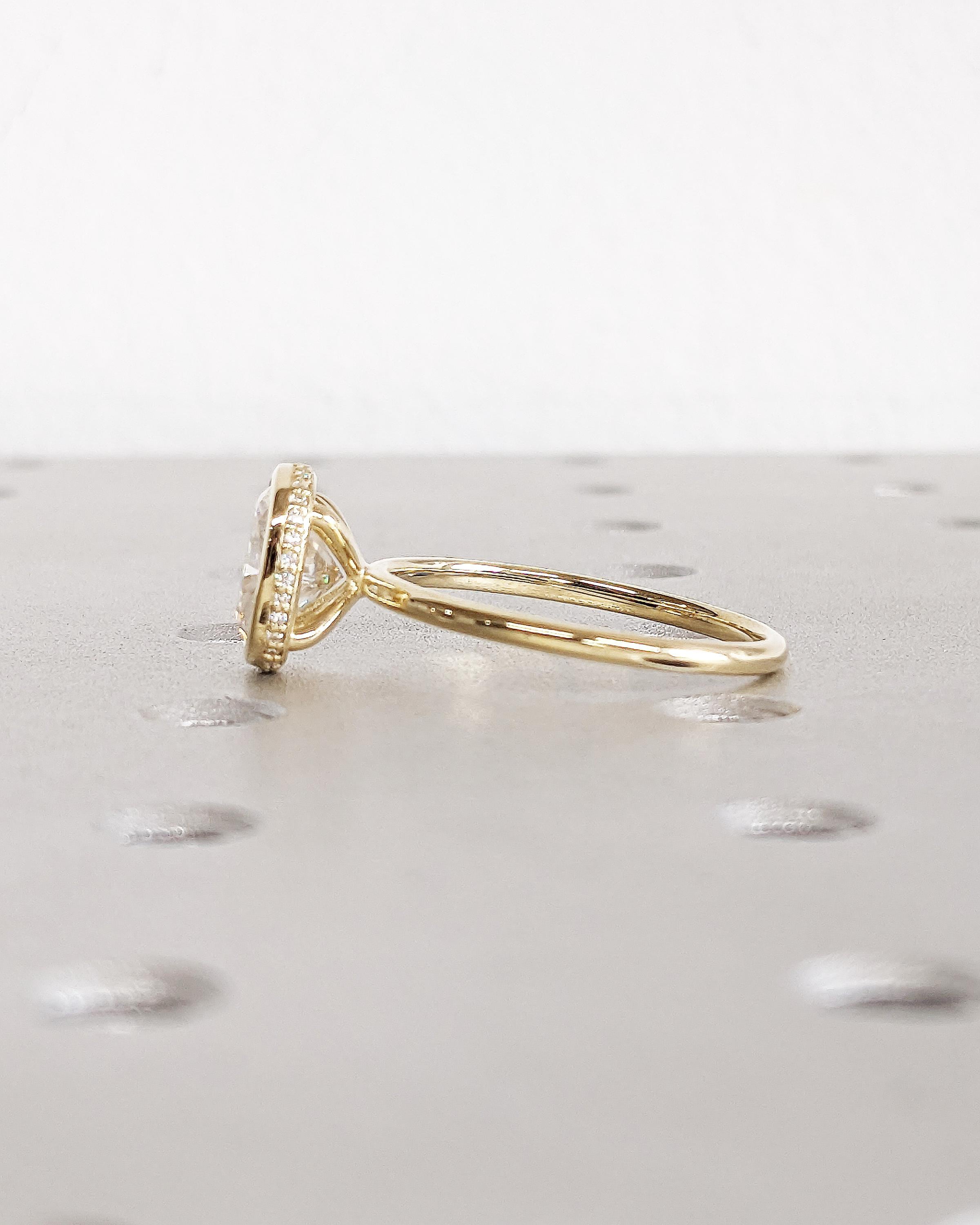 Understated and elegant, this sophisticated engagement ring features a cushion cut Lab Diamond in bezel setting with Natural Diamonds or Moissanite hidden halo, atop a delicate rounded band. Can be matched with a full eternity band as a bridal jewelry set or as a fashion statement ring on its own to glam up your chic look!