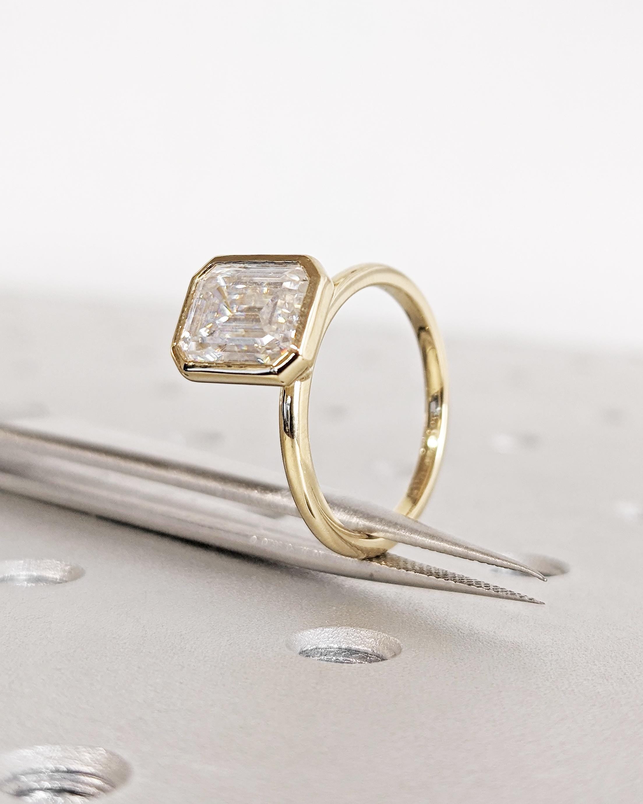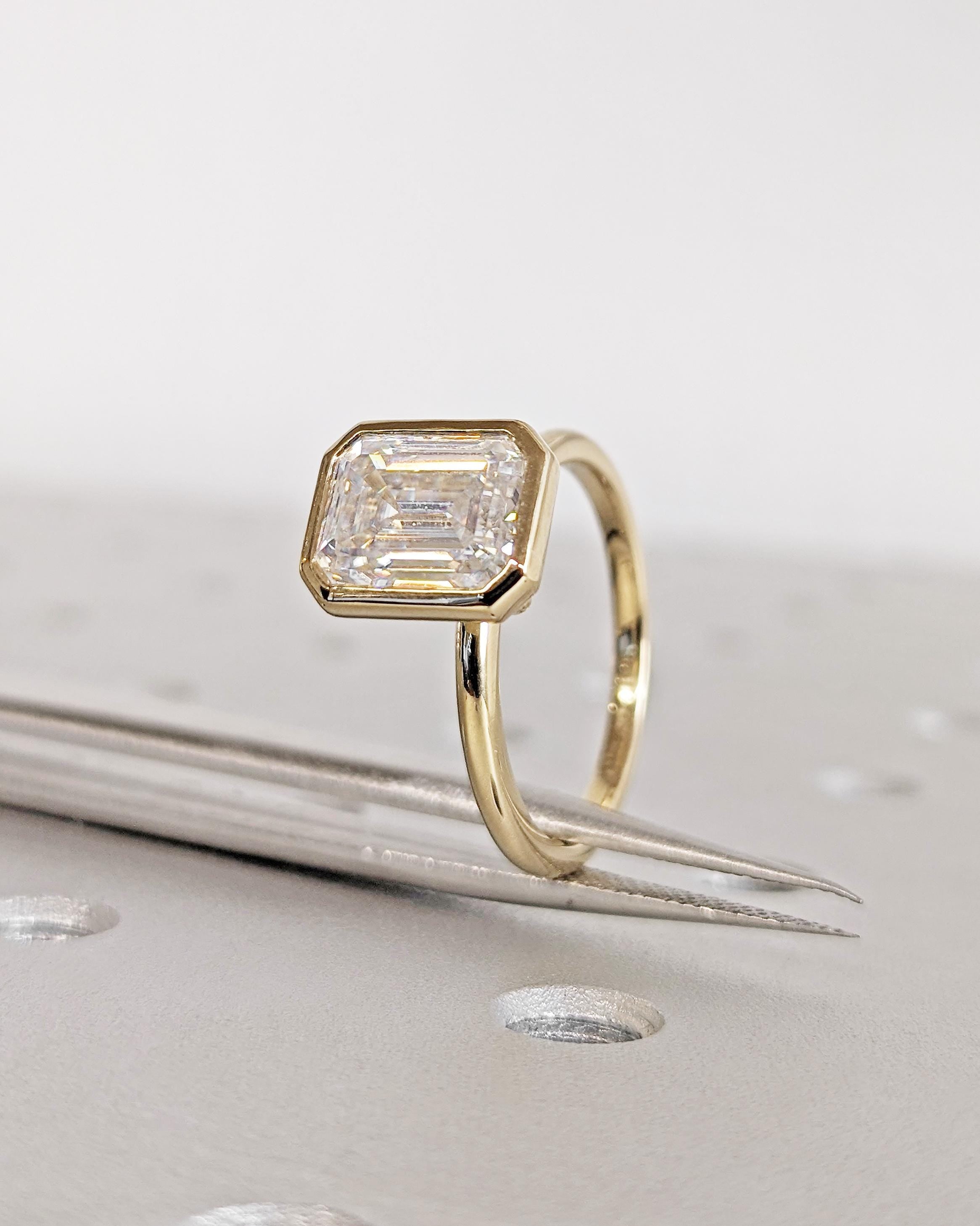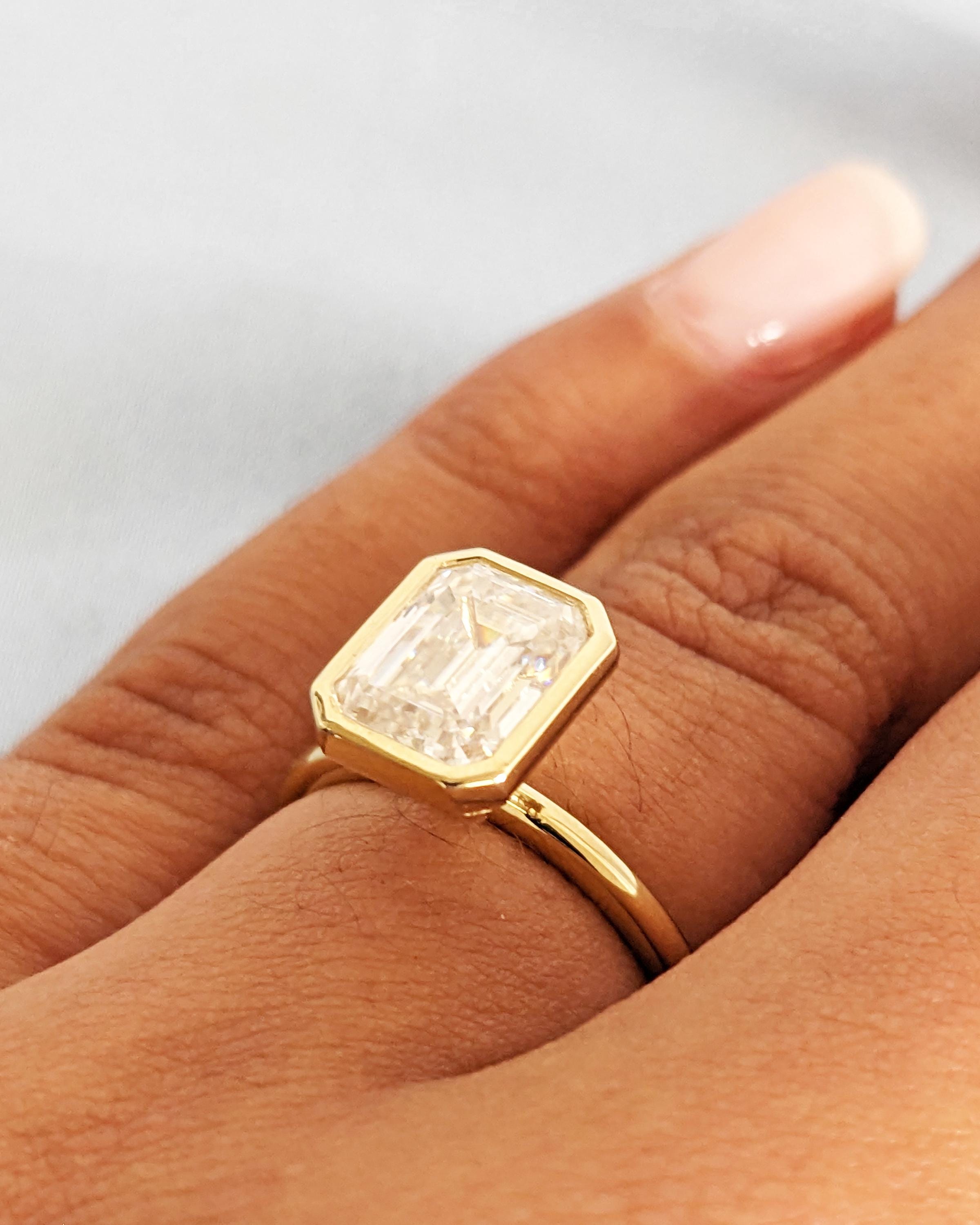 This elegant engagement ring features a stunning emerald cut lab diamond set in a sleek bezel setting. The dainty rounded band gives it a clean, minimalist appeal. Perfect on its own, or pair it seamlessly with our full eternity band for a flawless combination.