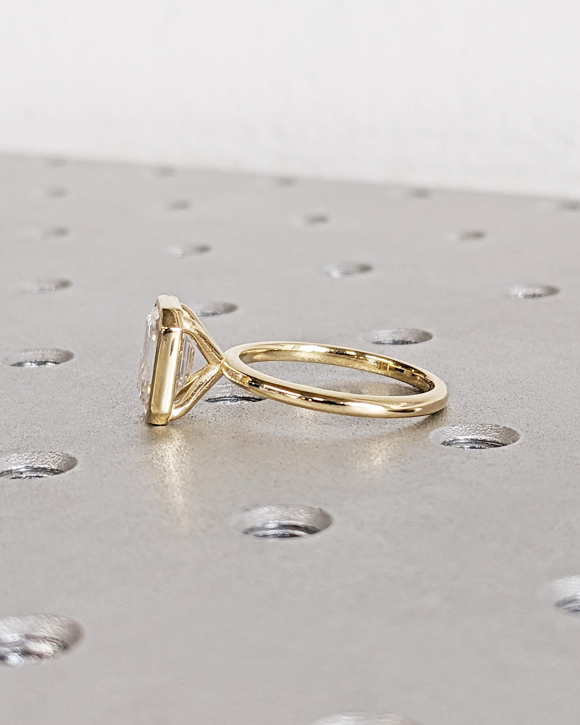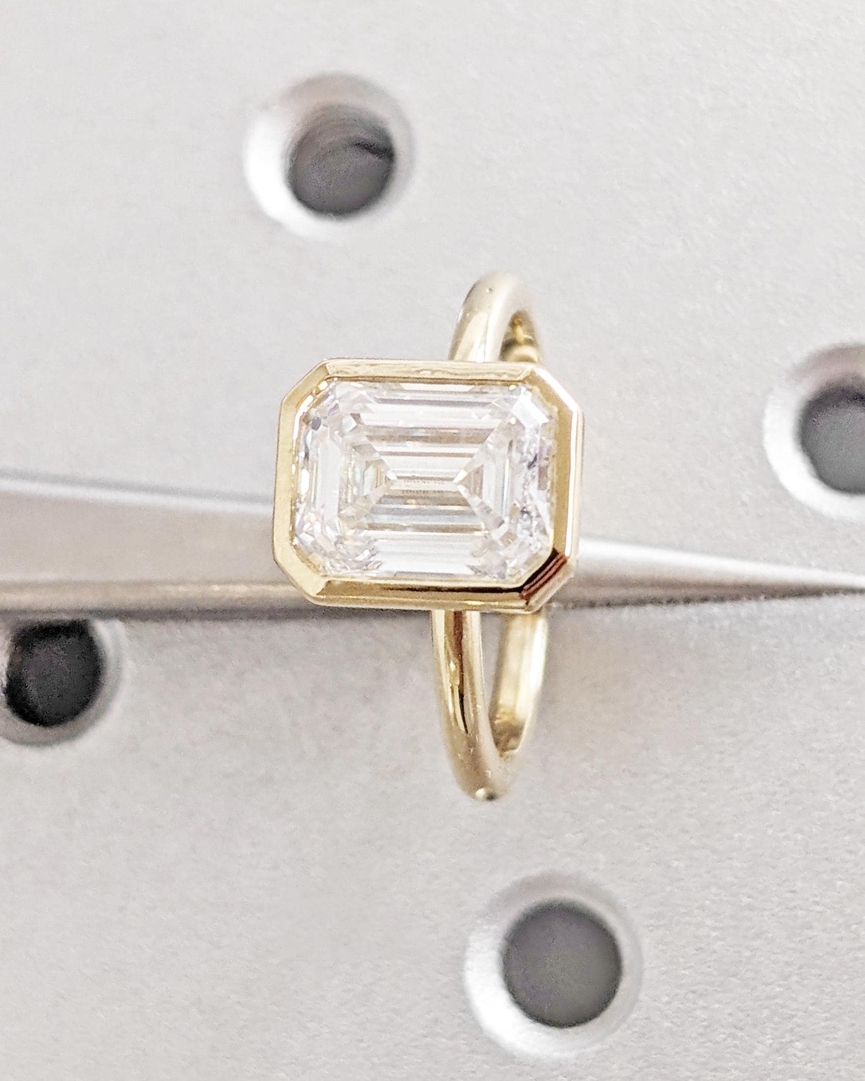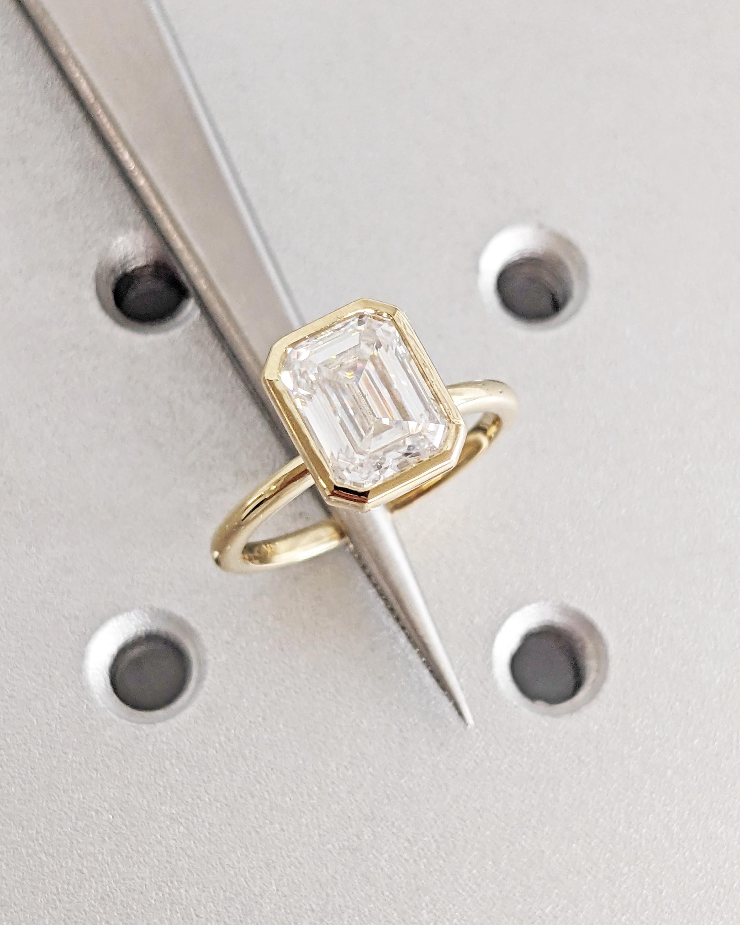 This elegant engagement ring features a stunning emerald cut lab diamond set in a sleek bezel setting. The dainty rounded band gives it a clean, minimalist appeal. Perfect on its own, or pair it seamlessly with our full eternity band for a flawless combination.