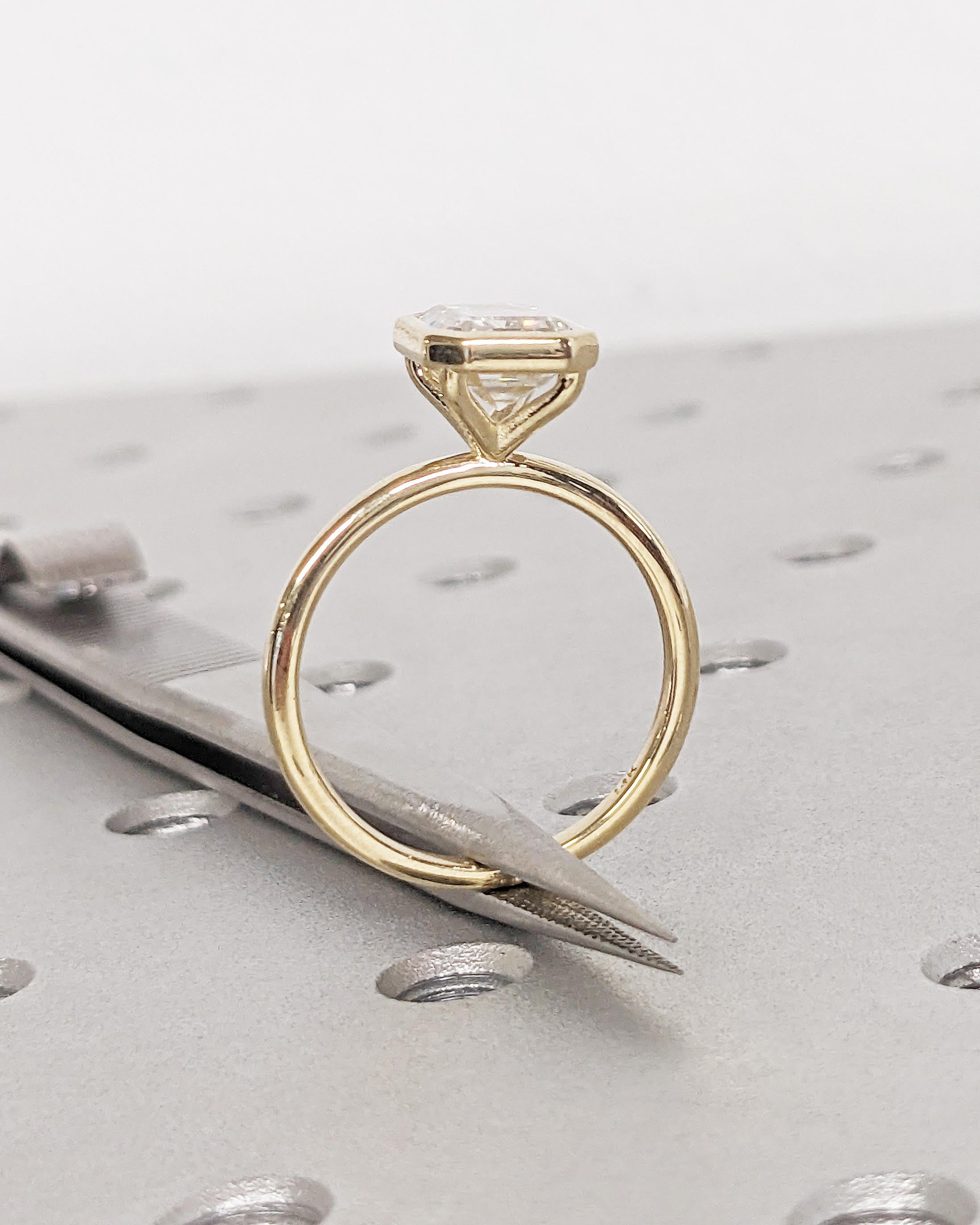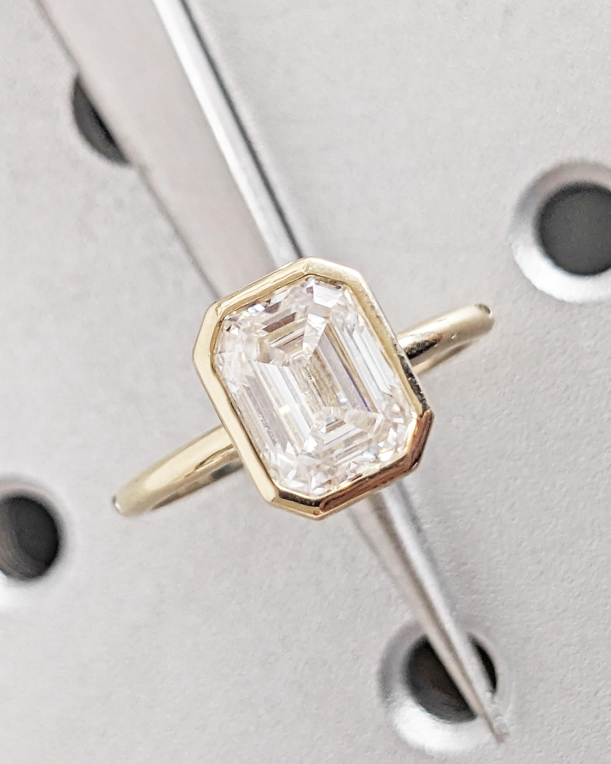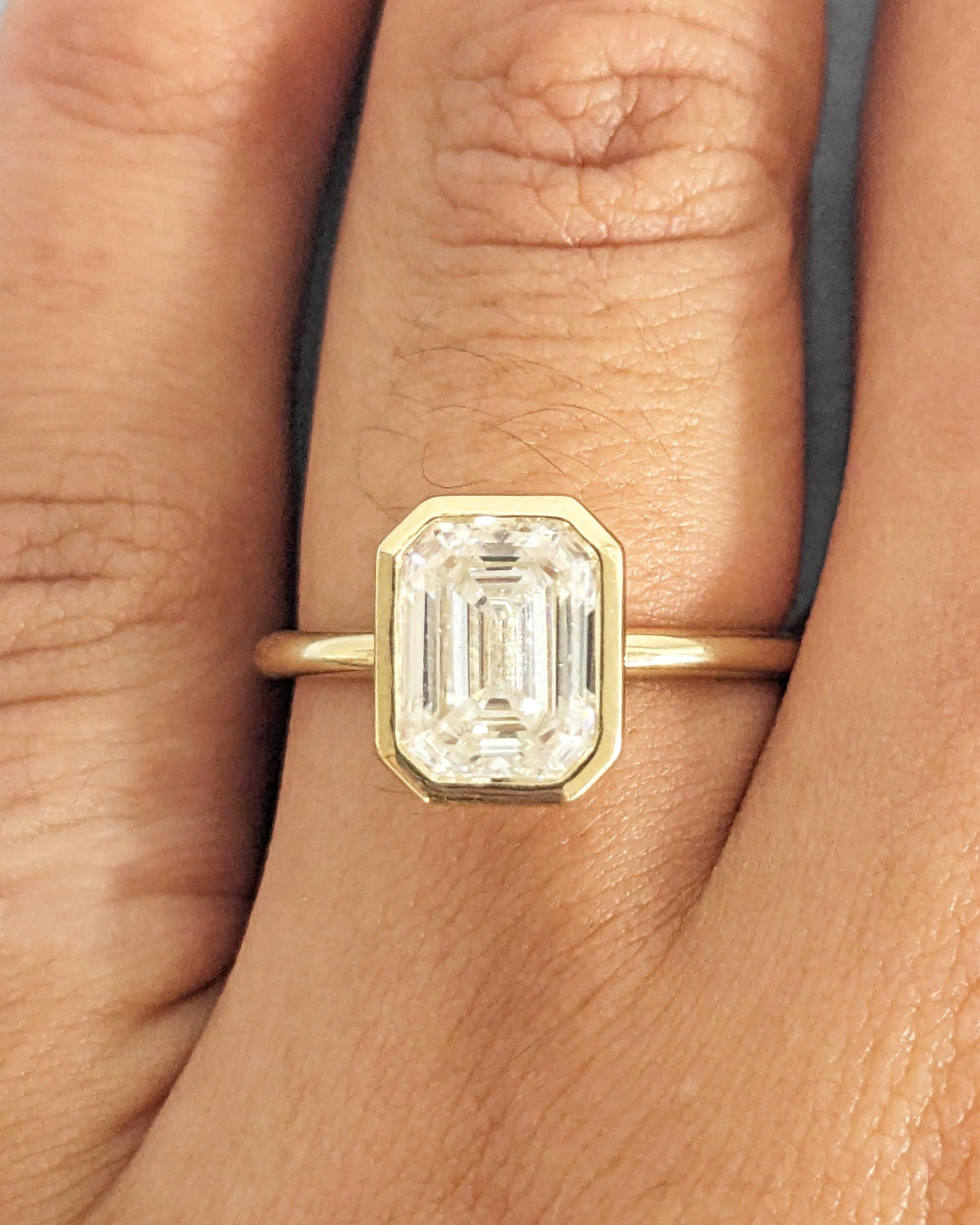 This elegant engagement ring features a stunning emerald cut lab diamond set in a sleek bezel setting. The dainty rounded band gives it a clean, minimalist appeal. Perfect on its own, or pair it seamlessly with our full eternity band for a flawless combination.